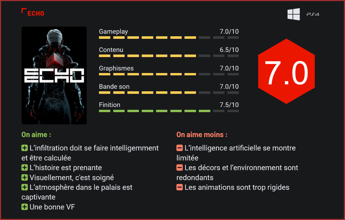 Ce petit ovni mêlant réflexion et anticipation sur fond de science-fiction est le fruit d’un développement de plusieurs années d’un petit studio, petit par sa taille, mais non par son imagination et ses compétences. Unique en son genre, Echo plonge le joueur dans un mystérieux palais, où l’aspect majestueux des couloirs est assombri par la présence d’une multitude de clones, prêts à en découdre avec le joueur… Développé par le studio Ultra Ultra – c’est le nom qu’a pris la petite équipe de huit personnes qui a mis au monde ce jeu très particulier, principalement des ex-développeurs de la saga Hitman – Echo est un au design et au concept véritablement uniques, qui pourrait bien séduire les joueurs à la recherche de titres sortant des sentiers battus. L’influence d’Hitman est omniprésente. D’une part, parce que le jeu se classe dans la même catégorie en mêlant action et infiltration, et d’autre part parce que le feeling du jeu s’en rapproche à plusieurs moments, notamment lors des éliminations furtives. L’amour vaincra… Ou pas Notre aventure démarre avec le réveil de l’héroïne, En, plongée dans un sommeil artificiel jusqu’à l’arrivée de son vaisseau à proximité de la destination : une planète de glace qui se résume à un immense palais luxueux. Une exploration pour sauver l’âme de son bien-aimé qui a été enfermé dans un étrange cube. Malheureusement pour En, sa quête sera mise à mal par la présence d’étranges robots capable de copier ses moindres faits et gestes. Une aventure qu’En ne fera pas seule. Accompagnée par la présence vocale d’une intelligence artificielle alliée, nommée London, En pourra compter sur celle-ci dans sa progression malgré des tensions palpables sur divers sujets, dont la « création », une sorte de religion bien étrange. Jauger ses actions pour ne pas mourir de ses propres mains Pour tenter de ressusciter son compagnon, En va devoir remettre le courant ce qui va avoir pour fâcheuse conséquence de « réveiller » un mécanisme étrange de sécurité : l’apparition de robots qui imitent l’intrus. Dans un premier temps imparfaits, les clones vont se rapprocher de plus en plus de leur modèle, allant jusqu’à copier ses stratégies de combat sur le terrain. C’est là que toute la créativité du studio Ultra Ultra se montre. À intervalles réguliers, le palais replonge dans l’obscurité ce qui a pour effet de mettre à jour les comportements des robots en fonction de ce qu’En a réalisé durant les phases se déroulant en plein jour. Les robots agissent comme des échos au comportement de notre héroïne. Fonctionnant donc sur un cycle lumières-ténèbres, les actions des robots seront influencées par les mouvements qu’En a fait durant la dernière phase de lumière. Il n’est donc pas question de foncer tête baissée quand tout ce que l’on fait pour détruire son ennemi aura des conséquences sur nos propres chances d’évoluer lors de la prochaine phase. Il y a un côté sadique chez Echo, et c’est justement ce qui donne sa véritable identité à ce titre unique en son genre… Au-delà d’anticiper les actions des adversaires, le joueur devra doser chacun de ses gestes pour réussir à contrer ses propres mouvements lors de la prochaine phase. En revanche, les phases de ténèbres laisseront une plus grande part de liberté à notre héroïne bien que la présence des droïdes juste à côté aura le don de conserver le sentiment de tension chez le joueur. Le concept est alléchant, mais malheureusement – ou heureusement – l’intelligence artificielle dont jouissent les robots reste cadrée par sa condition d’AI limitée. Il est en outre possible d’appâter les robots à un endroit ou un autre pour réaliser des éliminations furtives ou les éviter en les contournant. D’intelligence artificielle, ils n’en ont parfois que le nom. Chaque action a un coût Côté personnage, ses mouvements en tant que tels seront limités par une jauge de vie. Chaque action (tirer, éliminer un ennemi, sauter) enlève un point de vie, matérialisé par son bouclier sphérique. Il sera possible de le recharger via divers orbes lumineux. Véritable détecteur de danger et de visibilité, mais aussi de GPS, celui-ci se montrera d’une grande aide. Mais attention, l’infiltration reste privilégié par rapport à la confrontation. En effet, bien qu’équipée d’un pistolet – plusieurs élimination avec une seule balle lorsque les ennemis sont alignés -, En ne résistera qu’à deux coups de la part d’un de ses doubles. C’est à ce niveau qu’on retrouve le concept de dosage ; tuer et perdre un point d’action tout en risquant de se faire repérer ou esquiver un ennemi. Une opulence malsaine Bien que la première heure de jeu se montre assez lente, cela permet au joueur d’admirer la beauté des décors. Les couloirs de l’immense palais sont d’une beauté étourdissante. Le luxe est le mot d’ordre, meublé dans un style Louis XVI, les dorures et divers objets de décoration transpirent l’or et les matériaux rares. Une opulence qui, à force, ne fait que renforcer le sentiment d’intrusion dans un endroit où l’on ne veut pas de nous. L’atmosphère pesante est parfaitement soulignée par la bande son qui a reçu un travail exemplaire. On est bercé par des sonorités orchestrales de science-fiction des plus correctes. On notera également le travail des doubleurs qui apporte de la vie aux dialogues – En est doublée par Rose Leslie, Ygritte de Game of Thrones, et London par Nick Boulton, Druth dans le jeu vidéo Hellblade. On regrette tout de même que le jeu ait la fâcheuse tendance à se répéter – chaque niveau ressemblant ici au précédent. Les gros changements se font dans les zones de maintenances qui s’éloignent de l’élégance des dorures du palais pour se diriger vers des allures industrielles. Conclus