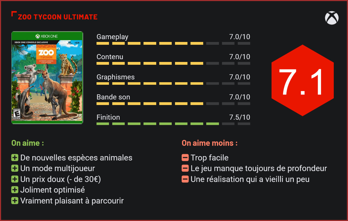 Parmi les titres qui avaient accompagné le lancement de Kinect sur Xbox One, Zoo Tycoon demeure l’un des incontournables pour les amateurs de jeux de gestion. Le jeu de Frontier Developments a étonnamment droit à une réédition sur la console de Microsoft, avec quelques jolies nouveautés à la clé… Si l’annonce de la fin de la production de Kinect a refroidi les plus fervents supporters de Kinect, Microsoft n’a pas encore totalement abandonné sa plate-forme. L’éditeur sortait la semaine trois rééditions de titres parmi les plus populaires sur Xbox One et Xbox 360, dont l’excellent Zoo Tycoon. Dans cette réédition du célèbre jeu de gestion de parc animalier, les joueurs découvriront, outre un mode coopératif à quatre, plusieurs nouvelles espèces animales, originaires d’Amérique du Sud et d’Australie, qui justifieront presqu’à elles seules l’investissement dans cette “édition ultime” rassemblant tout le contenu du jeu originel et ses extensions solo & multijoueur. Au casting, outre les lions, éléphants et zèbres, les joueurs découvriront donc plusieurs espèces plus exotiques, comme le koala, le kangourou ou l’ornithorynque. Au total, plus de 200 espèces animales sont désormais représentées dans le jeu. Si le but du jeu n’a en soi pas changé – il s’agit toujours de construire un parc animalier et d’en gérer tous les aspects (des entrées au niveau de satisfaction des visiteurs), tout en veillant au bien-être des animaux, l’introduction d’un mode coopératif en ligne rend l’aventure beaucoup plus excitante, en particulier pour les joueurs qui étaient passé à côté de ce hit en puissance au moment de sa sortie. On appréciera par ailleurs le travail réalisé par les développeurs d’Asobo, qui se sont chargés de cette réédition du titre de Frontier, qui nous livrent un titre entièrement optimisé pour la Xbox One X – et compatible 4K et HDR -, et en outre compatible avec le programme “Play Anywhere” de Microsoft. Visuellement, le jeu n’a rien perdu de son charme, même s’il a (forcément) un peu vieilli. Les décors restent superbes, et les modélisations à la hauteur des passionnés du règne animal. Parcourir son vaste parc animalier reste en soi un véritable plaisir – que petits et grands se feront un bonheur de partager. Car Zoo Tycoon est l’une des très rares exclusivités sur Xbox One qui visent à la fois un public très jeune et plus mature. Proposée sous la barre des 30 euros, cette réédition du jeu de Frontier mérite donc le coup d’oeil, en particulier si vous étiez passé à côté de cet excellent jeu au moment de sa sortie. Asobo ne s’est en effet pas contenté d’un simple portage 4K du titre de Frontier et nous livre une version chargée en contenus inédits, et parfaitement optimisée pour la Xbox One X à laquelle on ne reprochera finalement qu’un certain manque de profondeur par rapport à son ancêtre. Conclusion Asobo nous livre une réédition en bonne et due forme du jeu de Frontier, qui apporte, outre une optimisation pour la Xbox One X (avec le 4K et le HDR de rigueur) un nouveau mode multijoueur coopératif et plusieurs nouvelles espèces animales. Suffisamment de nouveautés pour justifier un passage à la caisse, pour les joueurs qui étaient passés à côté de ce très sympathique jeu au moment de sa sortie… Seul (gros) regret : les développeurs n’ont pas touché aux mécanismes de jeu, toujours aussi simples.