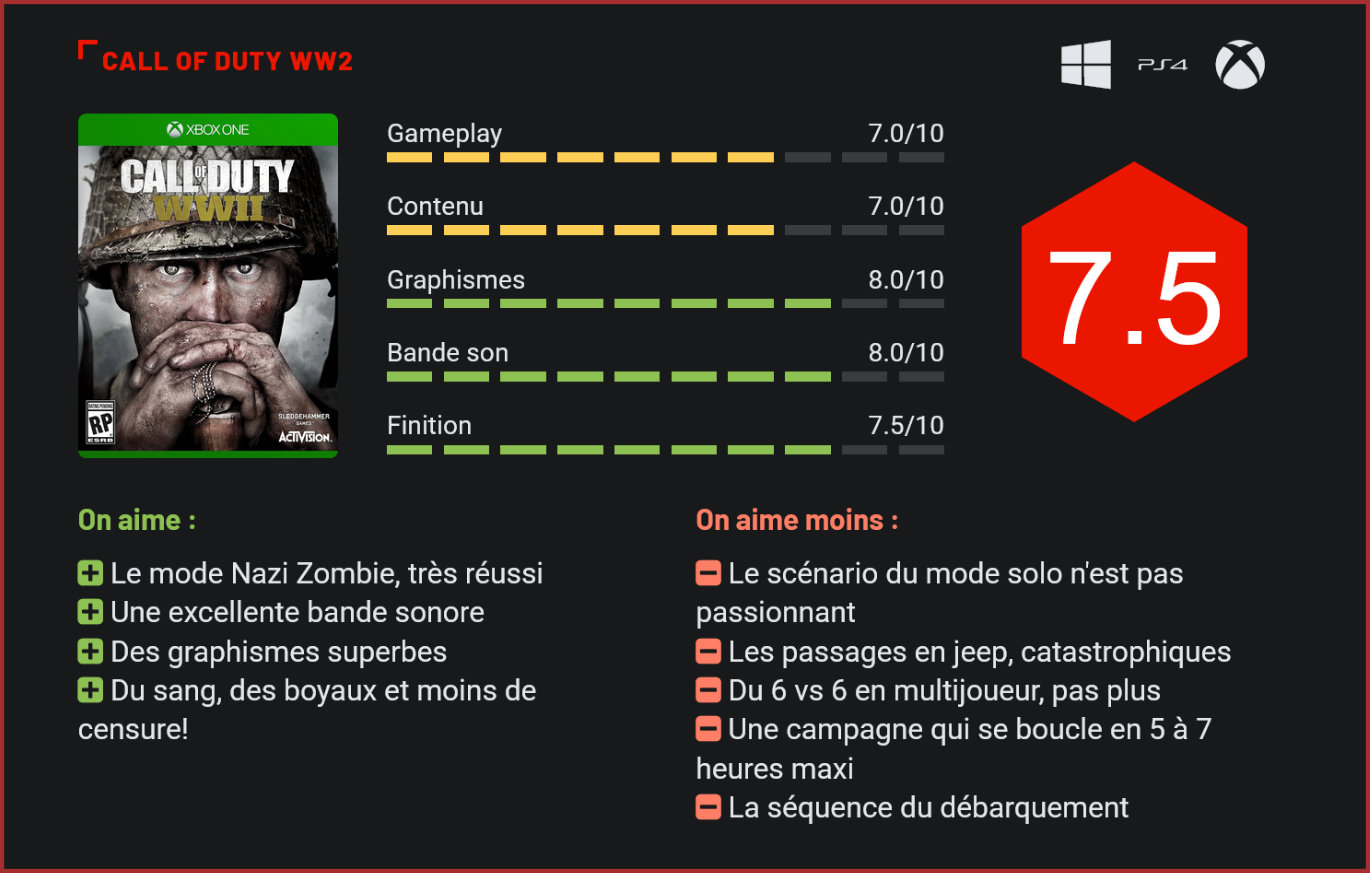 Après le très décevant Advanced Warfare, Call of Duty revient en force avec un épisode qui propose un véritable retour aux sources de la franchise. Confié aux développeurs de Sledgehammer Games, qui avaient notamment travaillé sur le développement de Dead Space, Call of Duty WW2 propose comme son nom l’indique, de se replonger en pleine Seconde guerre mondiale et de prendre les commandes d’une escouade sur le chemin de la guerre… Si les deux premiers épisodes de la série étaient parvenus à séduire la presse spécialisée, la franchise d’Activision a connu depuis ses débuts des hauts et des bas en raison notamment des choix opérés par l’éditeur tant au niveau du développement que de la ligne scénaristique. L’obsession d’Activision pour l’époque contemporaine et le multijoueur avait conduit de nombreux fans de la série à l’abandonner en cours de route. Après des années d’errance, la série revient en force avec un épisode qui opère un véritable retour aux sources. Car oui, n’ayons pas peur de le dire, Call of Duty WW2 remet les pendules à l’heure pour la série en procédant à une série d’ajustements. Le mode solo reprend ici une place centrale dans le jeu, en proposant une aventure scénarisée digne d’une grosse production hollywoodienne. Et pour cause puisque le joueur suivra les aventures d’une escouade de soldats envoyés sur le front, des plages de Normandie à Paris, en passant par les Ardennes et Aachen (Aix-la-Chapelle). La campagne solo n’est certes pas bien longue (5 à 7h en difficulté normale), mais elle se révèle très réussie, et passionnante de bout en bout. Les premiers pas dans la campagne donnent pourtant une impression mitigée. Car oui, la première mission, sur les plages de Normandie, n’est pas tout à fait à la hauteur. On aurait espérer ressentir davantage le danger, la peur et l’enfer des plages du débarquement. Si la vidéo d’introduction retranscrit plutôt bien la tension du débarquement, la course folle sur la plage vers les bunkers nazis ne tient pas ses promesses. Par chance, la suite est beaucoup plus réussie. De l’infiltration de Paris à la Bataille des Ardennes, les missions qui nous sont ici présentées sont non seulement variées mais tiennent également le joueur scotché à son pad. Nerveux, le jeu de Sledgehammer Games ne déçoit pas, sauf peut-être en ce qui concerne son scénario et la destinée des différents soldats de notre escouade. L’idée de faire suivre la progression d’une escouade était en soi plutôt bonne. Mais dans la pratique, difficile de s’attacher à des personnages avec qui on n’a pas le temps de créer une connexion, et qui incarne pour la plupart les stéréotypes des marines américains. Pour autant, ne minimisons pas ici le travail opéré par les développeurs, qui ont pris soin de retranscrire avec un maximum de réalisme l’horreur de la guerre. Plusieurs changements s’opèrent d’ailleurs par rapport aux précédents épisodes. Le jeu est ainsi beaucoup plus gore : l’hémoglobine coule à flots, les boyaux se déversent sur les plages et les développeurs n’ont rien épargné aux joueurs. Ce qui représente en soi une évolution notable pour une franchise trop souvent considérée comme “grand public”. Ensuite, Call of Duty perd en simplicité en intégrant une barre de vie. Une nouveauté qui, mine de rien, rend les affrontements beaucoup plus techniques puisque le joueur ne pourra plus simplement se planquer 5 secondes pour récupérer son énergie. Il devra soit chercher des medipacks soit appeler le médic pour récupérer un pack et se l’injecter. Dans le feu de l’action, la panique se fait très vite ressentir. Enfin, pour peu que vous n’ayez pas choisi le mode de difficulté le plus bas, vous devrez recommencer parfois à plusieurs reprises certains passages et trouver la bonne technique pour progresser. Le jeu ne se finit donc plus en “ligne droite” avec une seule vie, et opère un véritable rehaussement de la difficulté. Les sensations sont donc au rendez-vous, des escarmouches aux affrontements de char, en passant par les nettoyages de zones et même quelques séquences d’infiltration dans un Paris occupé. Notre seul regret concerne finalement le rythme du jeu, qui a parfois tendance à trop s’accélérer, à la manière d’un blockbuster américain, au point d’en devenir ridicule. On pense aux séquences de courses-poursuites en jeep, chaotiques et sans intérêt, mais aussi à quelques passages qui donnent l’impression au joueur de s’être transformé en un véritable Terminator. Ce, alors que le jeu prône le réalisme… Une incohérence narrative qui nous empêche de profiter pleinement du divertissement. Le jeu souffre également de quelques séquelles héritées des précédents opus, avec quelques vilains QTE sans grand intérêt intégrés ça et là. La bonne nouvelle, c’est que les joueurs auront également droit à quelques séquences plus innovantes, et très abouties, de l’infiltration de Paris aux combats aériens au-dessus de l’Allemagne, il y a vraiment de quoi prendre son pied dans cette campagne. Du côté du multi, le sentiment est plus mitigé. Call of Duty WW2 conserve ici l’ADN de ses prédécesseurs, sa communauté, ses marques. Ce qui n’est en soi pas un mal. Mais les joueurs allergiques aux précédents épisodes de la franchise n’y trouveront sans doute pas leur bonheur… Un total de 10 cartes attendent les joueurs, avec très peu de surprises au programme. La construction des cartes reste très classique, et si elles font voir du pays, elles ne proposent rien de vraiment différent des précédents opus de la série. Les affrontements se faisant en 6 contre 6, il ressort également une impression de trop peu dans les parties. Mais le véritable défaut du multijoueur reste la communauté du jeu, trop éclectique pour satisfaire, entre les joueurs