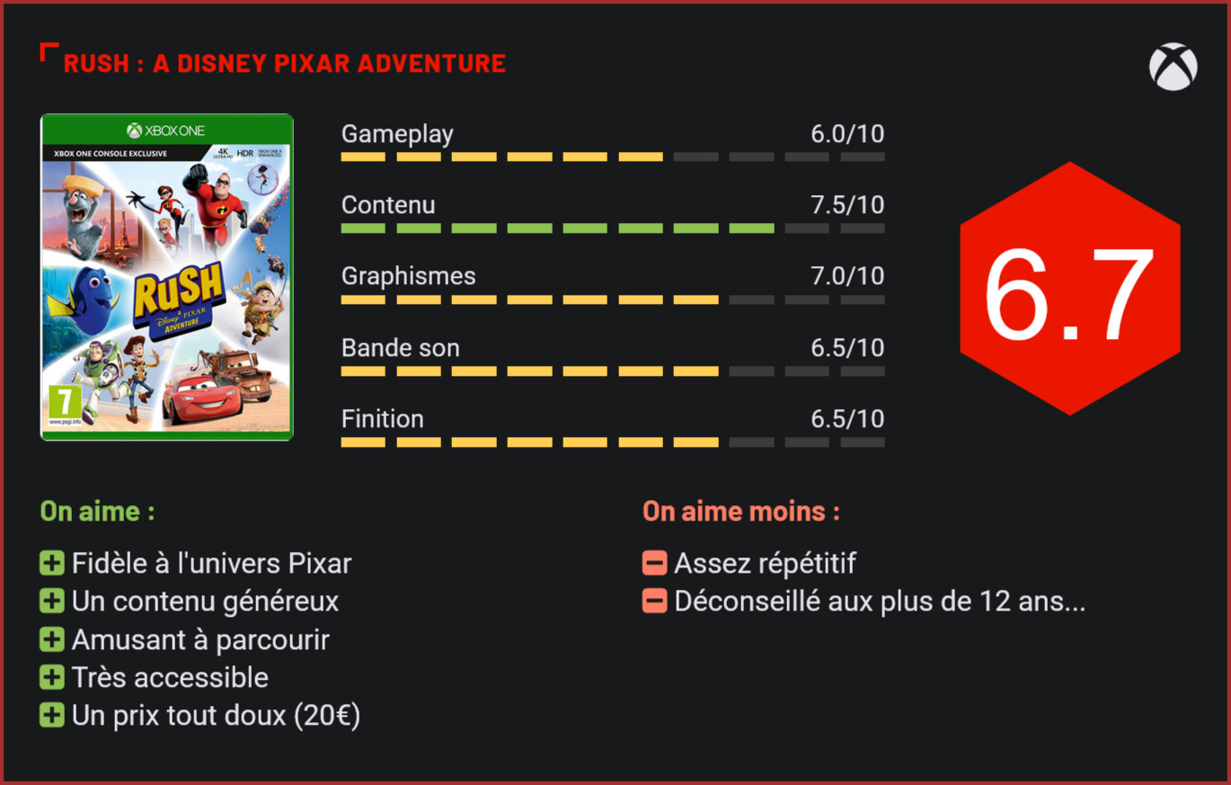 Initialement sorti sur Xbox 360, Kinect Rush a aujourd’hui droit à une réédition sur Xbox One et à une dékinectisation en bonne et due forme, qui permettra aux joueurs qui étaient passés à côté de ce sympathique jeu d’aventure, de le redécouvrir sur leur console de dernière génération. Passé relativement inaperçu au moment de sa sortie, la faute en grande partie au fait que le titre était exclusivement jouable avec Kinect, le système de reconnaissance de mouvements de Microsoft, Rush : A Disney Pixar Adventure a droit lui aussi à un remaster en bonne et due forme, avec à la clé un nouveau chapitre inédit… Et le moins que l’on puisse dire, c’est que les développeurs d’Asobo ont mis les petits plats dans les grands pour créer l’événement avec un titre parfaitement adapté au pad, optimisé pour la Xbox One X (avec le HDR et la 4K de rigueur), compatible Xbox Anywhere et qui comprend en outre un chapitre inédit basé sur le long-métrage Le monde de Dori. Clairement destiné à un public très jeune (8-12 ans), Rush propose une bonne trentaine d’épreuves, mêlant course, plates-formes et affrontements, dans des décors inspirés par les films d’animation de Pixar. Certains épisodes sont plus réussis que d’autres. C’est le cas notamment de Cars, qui propose des courses et courses-poursuites inspirées dans les décors du film. Rapides et funs, les épreuves délivrent une bonne dose d’adrénaline, avec en sus bon nombre de bonus à exploiter durant les courses. Les séquences inspirées des films Le Monde de Dori, Ratatouille et Up! sont un peu moins inspirées, avec de l’exploration, des énigmes et des parcours à boucler en évitant des séries d’obstacles. Très vite, la répétitivité se fait ressentir. Le niveau de difficulté n’étant pas très élevé, difficile de s’amuser si vous avez dépassé le cap des 12 ans. Car il faut bien l’avouer, le jeu cible une audience très jeune et ses graphismes très colorés trahissent cette identité. Visuellement, en dépit de son âge, le jeu reste très joli, avec des décors très colorés, des modélisations des créatures et protagonistes abouties et de jolis effets spéciaux. La bande sonore n’est pas en reste avec toutes les musiques officielles des longs-métrages dans lesquels le jeu vient piocher du contenu. Certes, on remarque que quelques détails passent moins bien sur Xbox One, mais pour son public cible, Rush n’a pas à rougir. Notre plus regret finalement concerne davantage la répétitivité des séquences – très axées sur les jeux de parcours – que la réalisation du jeu ou son contenu (très riche). La prise en main au pad donne d’ailleurs un petit coup de fraicheur à ce titre qui pouvait vite se révéler très agaçant à parcourir avec le capteur Kinect. Point intéressant : on notera qu’il est possible de parcourir l’aventure en coopération, à deux joueurs. Si l’action reste parfois brouillonne, la progression à deux reste intéressante, notamment pour accompagner son enfant dans le jeu, et l’encourager à progresser. Très bien pensé pour les plus petits, Rush reste l’une des très rares bonnes adaptations de l’univers de Disney en jeu vidéo et mérite à ce titre que l’on s’y intéresse. Au niveau du prix, le jeu est également proposé à un prix doux (sous la barre des 30€) – une bonne raison de plus de craquer! Conclusion Rescapé de l’ère Kinect, Rush reste un formidable jeu d’aventure pour les plus petits, beau à damner et d’une fidélité extrême à l’univers de Pixar. Une aventure que l’on destinera quasi-exclusivement aux moins de 12 ans, compte tenu de sa répétitivité et de sa grande simplicité d’accès.