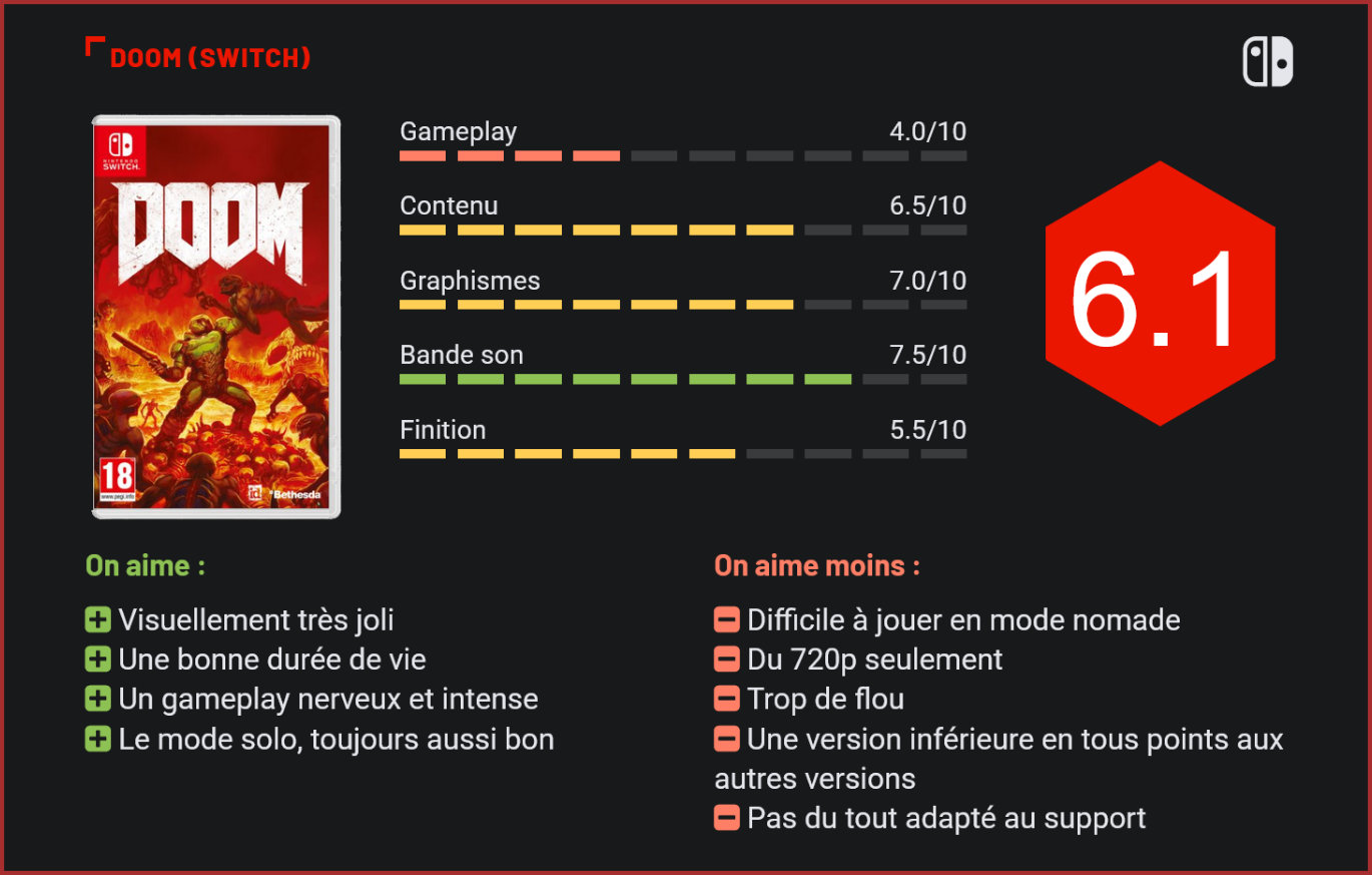 La petite console de Nintendo accueille son premier jeu de tir à la première personne, qui n’est autre que l’excellent Doom d’ID Software. Un titre brutal, qui contraste avec les autres productions présentes sur la petite console de Nintendo… Sorti il y a déjà un bon moment sur PC, Xbox One et PS4, le reboot de Doom avait reçu un accueil très chaleureux des critiques. Beau à damner, le titre d’ID Software pouvait également se vanter de dépoussiérer un genre qui était pratiquement mort : le « Doom-like » bête et brutal, que les amateurs de FPS ont progressivement délaissé pour des shooters plus tactiques. Voir débarquer une licence aussi culte sur Switch était un peu comme un rêve devenant réalité pour les propriétaires de Switch, qui étaient sans doute loin de s’attendre à voir débarquer le jeu d’ID Software sur leur console. Rapidement, la presse spécialisée a toutefois émis quelques doutes sur le portage, s’interrogeant notamment sur les capacités de la console de Nintendo à faire tourner un titre aussi réussi visuellement… Et puis, bien sûr, il y avait la question de savoir si les contrôles seraient à la hauteur sur une console essentiellement nomade. Autant dire que le défi n’était pas gagné d’avance pour les développeurs… La bonne nouvelle, c’est que si ID Software a dû réaliser quelques concessions au niveau de la réalisation technique (pas d’affichage 4K, un frame-rate un peu plus lent que sur PC, et moins de détails, pour plus de flou), le portage fait relativement honneur à la machine. La petite console de Nintendo surprend même, en faisant sans trop de difficultés tourner un jeu gourmand, visuellement très joli, et bourré d’effets spéciaux. Sur le petit écran de la console, Doom rend très bien, malgré une surabondance de flou. L’affichage est toutefois limité à du 720p. Ceux qui avaient déjà parcouru le jeu sur PC ou One ne noteront pas d’énorme différence sur le plan technique, en dehors de quelques ralentissements lorsque l’écran est surchargé par les hordes de démons. En ce qui concerne le gameplay en revanche, difficile d’être impressionné. Jouer à Doom en mode nomade nous a au moins permis de nous rendre compte que la Switch n’était clairement pas une console faite pour jouer à des FPS. Les joy-cons n’offrent pas une aussi grande précision que le pad, et cela se ressent dès les premières minutes de jeu. Si vous parviendrez facilement à éliminer les deux ou trois premiers monstres, les choses se compliqueront rapidement lorsque les ennemis se compteront sur plus d’une main. Se déplacer, viser et straffer est un véritable défi sur la console de Nintendo. Les sensations sont bien entendu nettement meilleures au pad, une fois la console glissée dans le dock, mais l’intérêt d’y jouer dans ce format est limité. D’une part parce que vous trouverez aujourd’hui Doom sur Xbox One ou PS4 facilement sous la barre des 15€. D’autre part, parce que le jeu est beaucoup plus beau en 4K et en HDR sur ces consoles que sur la version Switch, qui tourne en 720p. Tout l’intérêt de voir débarquer Doom sur Switch était justement de pouvoir y jouer en mode nomade, et malheureusement, le titre n’était pas du tout adapté à cet usage. Alors certes, le portage permettra au moins à ceux qui n’ont aucune autre console – ni PC -, de redécouvrir un classique du FPS. Mais à moins de n’avoir que la Switch, difficile de conseiller ce portage. Au niveau du contenu, on notera que Panic Button a fait l’effort d’intégrer le mode multijoueur présent sur les autres plates-formes, ce qui est en soi une bonne nouvelle. En revanche, l’éditeur de niveaux n’est pas au programme. Reste qu’avec son mode solo long et captivant, et son mode multijoueur, Doom offre une solide durée de vie et un excellent retour sur investissement. Il s’impose également comme une jolie vitrine technologique pour Nintendo et sa petite console portable, qui ne cesse décidément de nous surprendre. Conclusion S’il n’a rien perdu de sa superbe – et fait même honneur à la Switch -, ce portage de Doom ne trouvera toutefois d’intérêt qu’auprès de ceux qui étaient passés à côté de ce grand classique du FPS et qui ne possèdent que la Switch. D’une part, parce que le titre est difficilement jouable en mode nomade. D’autre part, parce qu’une fois glissée dans le dock, la console ne fait pas vraiment honneur au jeu d’ID Software, plus beau, plus complet et plus agréable à prendre en mains sur les autres plates-formes. A défaut d’être incontournable, ce portage est donc une jolie roue de secours pour ceux qui ne disposeraient ni d’une PS4, ni d’une Xbox One, ni d’un ordinateur capable de faire tourner le fleuron d’ID Software.