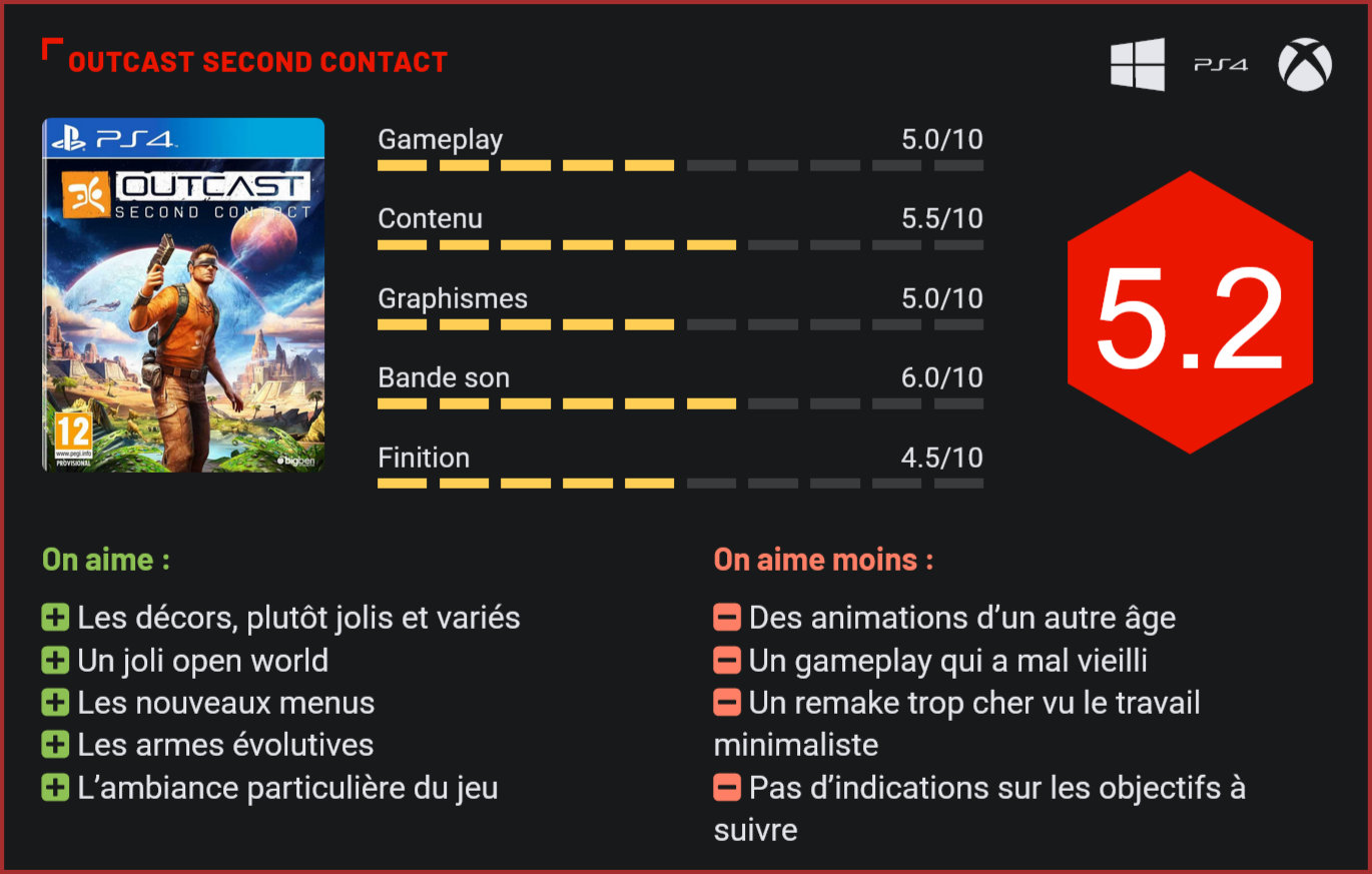 Financé par le biais d’une campagne de crowdfunding, le remake d’Outcast – qui est considéré par de nombreux joueurs comme un classique de la science-fiction – était attendu au tournant. Le jeu du studio belge Appeal tient-il toutes ses promesses ? La réponse dans notre test complet ! Il y a 18 ans, précisément, un petit studio de développement belge sortait l’un des meilleurs jeux de science-fiction de tous les temps. Unique en son genre, Outcast proposait au joueur de se plonger dans un vaste monde ouvert à la recherche de réponses aux nombreuses questions que soulevaient son scénario. Près de deux décennies plus tard, ses créateurs décident de remettre au goût du jour leur jeu et lancent une campagne de financement participative sur la plate-forme de crowdfunding KickStarter. Couronnée de succès, l’initiative poussera l’éditeur BigBen Interactive à soutenir le projet, pour que le remake du jeu sorte également sur consoles de salon. Et d’un point de vue purement graphique, il faut l’avouer, Appeal Software a réalisé un travail extraordinaire. Outcast : Second Contact a tout d’une grosse production. Plus qu’un simple remaster, Appeal nous livre un remake en bonne et due forme, avec des graphismes parfaitement remis au goût du jour et un univers enchanteur à explorer. Comme son ancêtre, le jeu tire une grande partie de son intérêt de ses vastes décors en monde ouvert, qui recèlent de secrets à découvrir. Plutôt fluide, le jeu fait plutôt honneur aux capacités des développeurs à remettre au goût du jour un titre qui était graphiquement totalement dépassé. Assez paradoxalement, si les modélisations et les décors ont eu droit à un solide travail, les animations semblent elles sorties d’un autre âge. Un « détail » pour certains, qui pourra toutefois gêner les plus jeunes, pas habitués à une telle vulgarité. Du côté du contenu à proprement parler, le jeu n’a pas non plus énormément évolué. Les développeurs se sont contentés d’ajouter une vilaine séquence d’introduction – en 2D – et d’agrandir certaines zones de jeu, et c’est à peu près tout. Le gameplay n’a absolument pas évolué, et c’est probablement ce que l’on reprochera le plus à ce remake, qui essaye tant bien que mal de remettre au goût du jour une formule qui fonctionnait parfaitement il y a 18 ans, mais qui a bien mal vieilli. Si l’exploration représente l’épine dorsale du titre, et fonctionne toujours plutôt bien, en grande partie grâce aux superbes décors du jeu, les séquences de combat – d’une simplicité déconcertante puisqu’il s’agit de « locker » un ennemi pour le canarder tout en évitant ses tirs en straffant de gauche à droite et de droite à gauche – ne présentent plus beaucoup d’intérêt. La présence d’un jetpack dans l’arsenal du joueur aurait pu rendre l’action beaucoup plus palpitante, mais les développeurs se sont malheureusement contentés de l’utiliser pour accélérer les déplacements du joueur uniquement. Pas question donc de survoler les zones. Dans le même registre, on notera qu’il est possible de faire évoluer ses armes – un concept intéressant, même si dans la pratique les combats sont sans doute les séquences de jeu les moins intéressantes d’Outcast : Second Contact. Enfin, il est important de noter que si cette fidélité au matériau d’origine réjouira les joueurs les plus nostalgiques, les plus jeunes risquent malheureusement de se sentir complètement largués dans cet univers hostile. La plupart des quêtes consistent en effet à trouver des indices, par un système de dialogues pas très excitant, pour se rapprocher progressivement de son but. Le joueur n’a pas droit ici à une boussole ni à une flèche qui lui montrerait la direction à prendre. Il faudra donc passer par les menus – joliment remis au goût du jour, heureusement ! – pour faire le tour des informations glanées à gauche et à droite pour trouver son chemin. Le concept est intéressant, et fera sans doute ronronner quelques joueurs nostalgiques, mais l’idée laissera également sur le carreau bon nombre de joueurs, pas habitués à devoir effectuer des recherches et sortir un calepin de leur poche pour trouver leur chemin. Pour le reste, l’univers du jeu est très séduisant. Avec son scénario de mondes parallèles, son intrigue bien ficelée et ses nombreux dialogues, Outcast : Second Contact devrait séduire les passionnés de science-fiction et plus particulièrement encore les fans de Star Trek. On regrettera toutefois là aussi que la narration ait pris un vilain coup de vieux, et que la cinématique d’introduction ne soit pas plus réussie. Malgré les petits moyens du studio, il y avait sans doute moyen de faire beaucoup mieux… Malgré ses nombreuses qualités, Outcast : Second Contact ne parvient pas tout à fait à convaincre, la faute en grande partie à son gameplay qui n’a que trop mal vieilli et quelques manquements qui auraient pu justifier son plein tarif. Mais au prix auquel il est proposé (environ 45€), difficile de l’acheter les yeux fermés. Car dans la pratique, seuls les joueurs les plus nostalgiques devraient réellement apprécier cette expérience vraiment unique en open-world, mêlant exploration et enquête. Riche en contenu, et passionnant de bout en bout, Outcast n’est malheureusement pas un titre grand public, mais davantage un jeu de niche se destinant avant tout aux passionnés de science-fiction. Avis aux amateurs… Conclusion Avec Second Contact, Appeal nous livre un excellent remake d’un monument de la science-fiction. Malheureusement, si le studio de développement belge est parvenu à joliment remettre au goût du jour son jeu, avec un moteur graphique flambant neuf, le titre n’a pas évolué au niveau de son gameplay et prend du coup un sacré coup de vieux. Les séquences d’action déstabiliseront sans doute