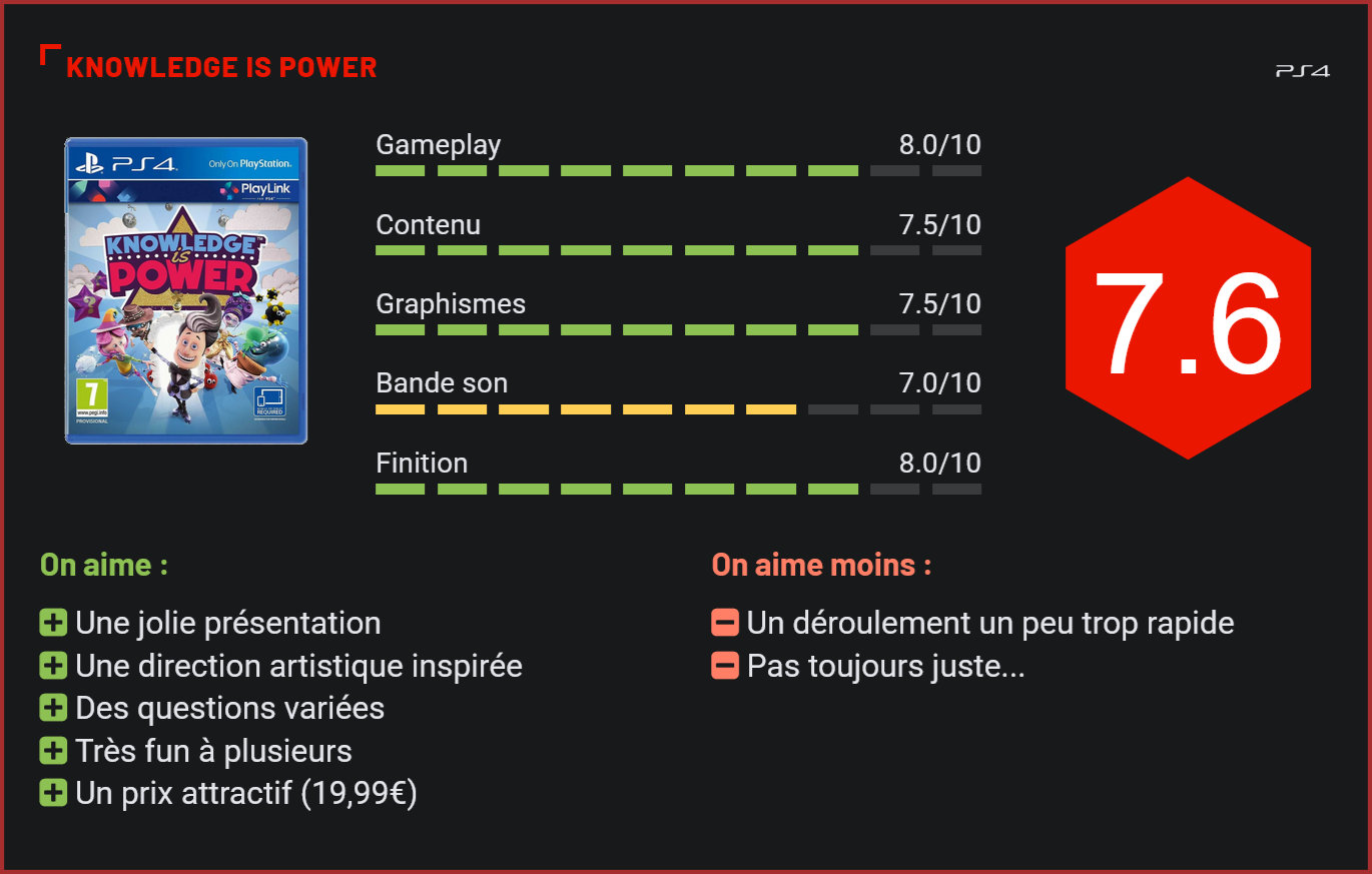 Parmi les titres accompagnant le lancement en grande pompe de PlayLink, on citera le sympathique Knowledge is Power, un jeu dans la veine de “Buzz” qui joue la carte du modernisme en remplaçant le buzzer traditionnel par un smartphone. Rappelez-vous, lors de l’E3 dernier, Sony levait le voile sur un party-game au design très particulier, qui était censé accompagner le lancement de PlayLink. Sobrement nommé “Knowledge is Power”, le titre en question s’inspirait de la franchise “Buzz” en proposant aux joueurs de participer à des quiz. L’originalité du titre vient du fait que le buzzer traditionnel est ici remplacé par une application qui s’installe directement sur le smartphone des joueurs prenant part à la compétition… Pratique, dans la mesure où on ne dispose pas toujours de suffisamment de manettes pour permette à chacun de prendre part au jeu! Knowledge is Power parvient à se démarquer de Buzz et des autres jeux-quiz par sa réalisation et sa direction artistique. Le jeu parvient en effet à créer son propre univers, en lorgnant notamment sur celui de Tim Burton, avec des personnages aux allures cartoonesques. Le rendu est visuellement très impressionnant pour un jeu de ce genre, et l’ambiance, bien que calquée sur celle d’un show télévisé, totalement décalée. Facile d’accès, le jeu dispose d’un vaste répertoire de questions. Outre des questions sur la géographie ou l’Histoire, on citera la présence de nombreuses questions sur la culture générale, le cinéma ou la musique. Entre chaque question, le joueur peut voter pour changer de sujet, et ainsi donner un nouveau tournant à la partie. Une bonne idée pour permettre à ceux qui ne sont pas calés dans un sujet de se faire écraser par leurs amis… Pour rendre les parties plus excitantes, Sony a pensé à intégrer un système de malus, que les joueurs peuvent attribuer à l’adversaire de leur choix. Pratique pour handicaper les joueurs les plus efficaces ou faire pencher la balance en sa faveur. Des “power-ups” à la manière d’un Mario Kart qui représentent une véritable bonne idée en soi! Party-game par nature, Knowledge is power n’est toutefois pas toujours très juste avec les joueurs et a la fâcheuse tendance à donner un avantage aux joueurs qui saisiront tout l’intérêt des malus plutôt qu’à ceux qui disposent de la meilleure culture générale. Regrettable, même si l’objectif du titre est accompli. Car ne nous voulons pas la face, Knowledge is Power n’est pas un titre qui boostera votre Q.I., mais davantage un jeu délirant à jouer entre amis pour décompresser après une grosse semaine. Vu son prix (19,99€), le titre remplit parfaitement son contrat, et plus encore grâce à sa réalisation graphique de haute volée, son charme et sa bande sonore, d’une rare efficacité. Conclusion Drôle, joli et efficace pour animer une soirée entre amis, Knowledge is Power est un formidable party-game pour la gamme Playlink, qui devrait logiquement séduire de nombreux joueurs. Son prix attractif en fait un divertissement abordable, qui ne souffre finalement que d’un seul défaut : le jeu a tendance à favoriser les joueurs qui comprennent le mieux l’usage des malus plutôt que les plus cultivés…