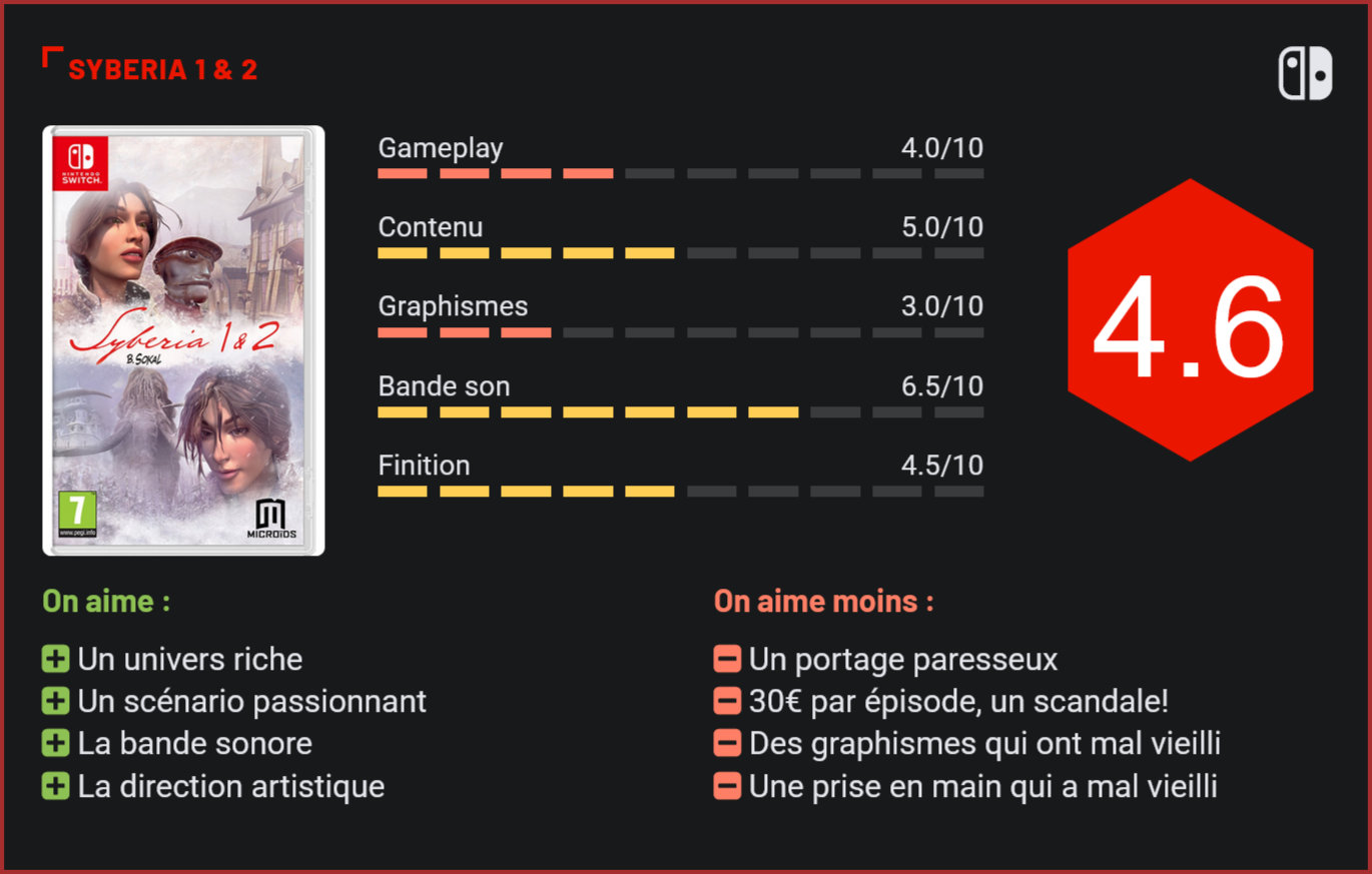 Considérés comme de véritables pépites du point & click, Syberia 1 & 2 ont droit à un portage en bonne et due forme sur la dernière console de Nintendo. Une bonne raison de se replonger dans l’univers fascinant de Benoit Sokal. Sorti en 2002 sur PC, Syberia était parvenu à séduire un vaste public avec son univers mystérieux et son charmante héroïne, Kate Walker, une jeune avocate New-Yorkaise envoyée par son bureau en France pour signer le rachat d’une fabrique d’automates. Son voyage la mènera jusqu’en Russie, à la recherche des mystérieux mammouths. Riche, le scénario de Syberia a surtout le mérite de nous faire voir du pays et d’explorer des zones de jeu dessinées par le grand Benoit Sokal – dessinateur belge qui avait notamment travaillé sur l’Amerzone. Visuellement, le spectacle est grandiose, même si les deux jeux ont plutôt mal vieilli (en particulier le premier épisode). Voyage emprunt de magie dans les terres glacées de Sibérie, Syberia est une aventure palpitante qui doit tout son intérêt à l’univers enchanteur imaginé par Benoit Sokal, les étranges personnages que le joueur rencontrera dans l’aventure et les nombreux dialogues qui permettront de lever le voile sur l’univers mystérieux du jeu. Point & click oblige, pas ou très peu d’action ici. Le joueur dirige Kate avec l’un des deux sticks de la console et la dirige dans des décors figés à la recherche d’autres personnages à qui parler. Il devra également résoudre différentes énigmes pour progresser dans l’aventure. Celles-ci, relativement simples, consistent pour la plupart à activer des leviers ou retrouver des objets. Pour progresser, il faudra dès lors parler à tous les personnages rencontrés durant l’aventure, en prenant soin de ne pas oublier ce qui nous est dit… Le jeu a toutefois bien mal vieilli, tant au niveau de ses graphismes – malgré la direction artistique somptueuse – que de son gameplay. Les déplacements de Kate restent très raides et il n’est pas rare de devoir réorienter plusieurs fois son personnage pour passer d’une salle à l’autre, la caméra ayant la fâcheuse tendance à changer d’angle et donc la direction du personnage, lorsque le joueur laisse le doigt appuyé sur le stick pour avancer dans une direction. Le second volet s’en sort globalement mieux que le premier – tout simplement parce que le jeu est sorti plus tard. Visuellement, le retard est moins visible. Chaque titre étant vendu une trentaine d’euros – séparément -, nous conseillerons aux joueurs de démarrer malgré tout par le premier volet, ne serait-ce que pour le scénario extraordinaire du jeu – qui sera difficile à suivre si vous n’avez pas bouclé le premier épisode. Autre petite déception : le jeu n’est pas en full-screen puisqu’il faudra se contenter d’une petite fenêtre sur l’écran de la Switch. On aurait clairement pu mieux faire pour un portage, surtout à ce prix. Reste que Syberia 1 et 2 demeurent deux classiques absolument incontournables pour tous les joueurs amateurs de point & click et de titres proposant un scénario riche et bien construit. Une petite pépite à redécouvrir dans son salon ou dans le train, en mode nomade… Conclusion Microids remet au goût du jour deux grands classiques du point & click sur Switch pour le plus grand bonheur des joueurs nostalgiques qui pourront redécouvrir l’univers grandiose de Benoit Sokal dans le train ou dans leur chambre grâce à la petite console nomade de Nintendo. Si les deux épisodes ont mal vieilli et que le portage reste paresseux, difficile de ne pas être séduit par le scénario passionnant de ces deux titres, la bande sonore magistrale et la direction artistique superbe. Reste qu’à 30€ l’épisode, on y songera à deux reprises avant de craquer…
