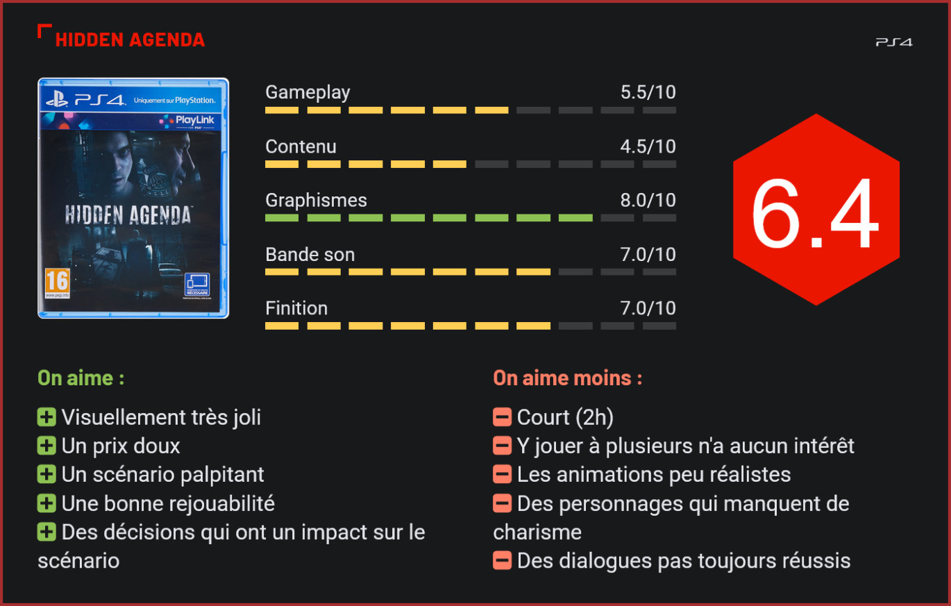 Faisant partie des titres de lancement de l’offre PlayLink, Hidden Agenda était sans aucun doute l’une des exclus PS4 les plus attendues de cette fin d’année. Le titre de Sony tient-il toutes ses promesses? Petit à petit l’offre PlayLink de Sony se renforce. Véritable porte-étendard de la technologie introduite par Sony il y a de cela quelques mois, Hidden Agenda faisait partie des exclus PS4 les plus attendues de cette fin d’année. Comme nous vous l’avions expliqué par le passé, PlayLink se veut une technologie hybride qui permet au joueur d’interagir avec sa console en utilisant son smartphone. Dans le cas présent, le jeu se veut un titre à la croisée des genres, à mi-chemin entre le film d’animation interactif et le “party-game”. Party-game parce que le jeu est jouable à plusieurs et le titre a été pensé pour être joué à plusieurs. Mais pour véritablement profiter de l’expérience, il vaudra toutefois mieux confortablement s’installer dans son fauteuil et “admirer le spectacle”. Se rapprochant d’un Heavy Rain au niveau de son ambiance, le jeu de Sony propose de suivre une enquête passionnante menée par une jeune inspectrice qui va tenter d’innocenter un meurtrier, accusé à tort de l’assassinat d’une personne. L’atmosphère ici est macabre, les décors sombres et les dialogues matures. Le joueur sera d’ailleurs surpris par la violence de certaines scènes qui rappellent à plus d’un titre la série Saw. Plutôt bien écrit, le scénario gardera le joueur scotché à son pad durant deux à trois heures. Mais la véritable force d’Hidden Agenda, c’est que contrairement à La Planète des Singes, chaque choix a ici un impact direct sur le scénario. Le joueur devra choisir qui sauver, comment agir, quels arguments communiquer à ses supérieurs ou opter pour la manière forte ou douce, selon les situations. A plusieurs, le titre peut malheureusement vite devenir très frustrant compte tenu du fait que le nombre de votes décidera de l’action. Dès lors, les décisions du joueur principal ne seront pas forcément prises en compte. L’aspect multijoueur est sans doute le moins intéressant du jeu. Mieux rythmé que La Planète des Singes, Hidden Agenda a également l’atout de proposer plus d’interactions avec le scénario. Outre les choix narratifs, le joueur pourra également interagir avec l’intrigue par le biais de QTE qui viennent rythmer l’action et par de courtes séances d’inspection, au cours desquelles il devra découvrir des indices à l’écran. Malheureusement, si le concept est sympathique et le scénario plutôt bien écrit, les animations maladroites nous rappellent trop souvent qu’on se trouve face à un jeu et non pas un film interactif. A cela s’ajoutent quelques défauts récurrents dans ce type de production avec des dialogues parfois peu palpitants, des personnages peu charismatiques, quelques incohérences narratives et un scénario certes plutôt réussi mais qui reste sur un sentier très balisé. On aurait très clairement pu en attendre davantage de ce jeu! Là où Sony a tenu ses promesses en revanche, c’est au niveau de la réalisation technique, très impressionnante à l’exception des animations douteuses des personnages, et de l’impact de chaque décision du joueur. Les plus enthousiastes pourront finir le jeu plusieurs fois pour saisir toute l’ampleur de ces embranchements scénaristiques. Précisons d’ailleurs que vu la durée de vie du titre (2 heures, en ligne droite), il sera préférable de rentabiliser son achat, même si Hidden Agenda est vendu à un prix très correct (19,99€). Conclusion A défaut d’être une totale réussite, Hidden Agenda s’impose comme une expérience plutôt enthousiasmante pour les cinéphiles, avec son scénario accrocheur, ses décisions qui ont impact réel sur l’aventure et ses visuels superbes. L’expérience est toutefois de courte durée et souffre de nombreux petits défauts mineurs qui viennent plomber l’expérience de jeu. Au final, si le titre mérite le détour à petit prix, on regrette que l’expérience PlayLink soit aussi pauvre, le mode multijoueur ne présentant que peu d’intérêt.