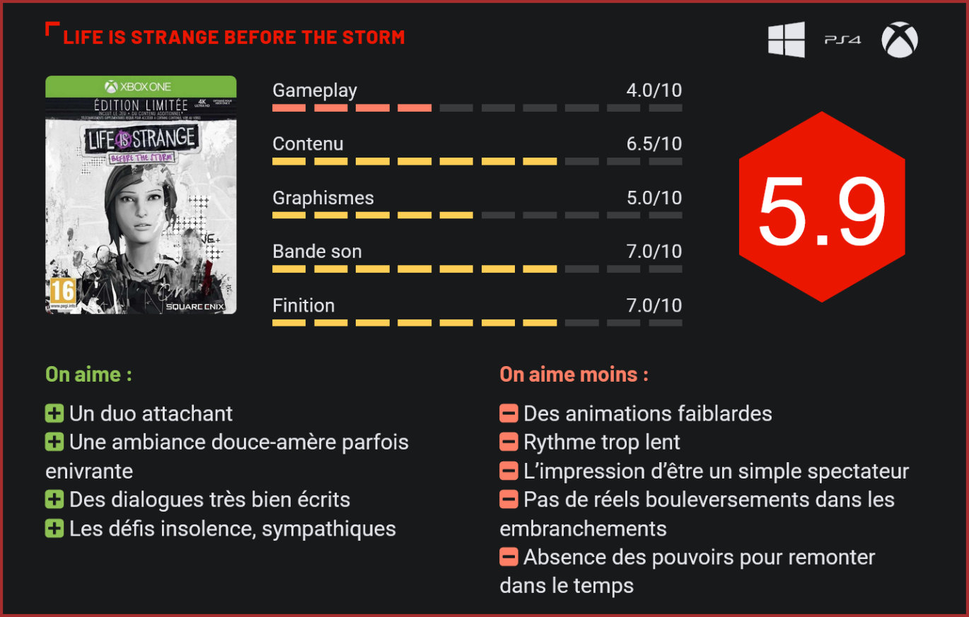Before the Storm, la préquelle du succès surprise de 2015 Life is Strange, vient d’être complétée par la sortie de son troisième épisode. L’occasion de faire le bilan sur cette aventure complémentaire à un récit doux-amer impliquant les adolescentes Chloé Price, Rachel Amber et Maxine Caulfield. En 2015, Square Enix et le studio français DONTNOD livraient la première saison de Life is Strange, un jeu épisodique narratif dans la veine des productions TellTale Games (The Walking Dead, The Wolf Among Us) mettant en scène Max Caulfield et son amie Chloé Price. Cette première saison, composée de cinq épisodes, nous mettait dans la peau de Max, une étudiante en photographie ayant le pouvoir de remonter le temps. Celle-ci retrouvait son amie d’enfance, Chloé, déterminée à mener avec elle une enquête autour d’une étudiante mystérieusement disparue. Intimement lié à ces évènements, Life is Strange : Before the Storm prend place trois ans avant cet arc narratif. Autrement dit, il n’est pas nécessaire d’avoir fait la première saison pour l’apprécier, même si de nombreux éléments ont été inclus pour les connaisseurs. Une dramaturgie digne d’une série télé Seulement évoquée, Max fait ici place à Chloé, l’héroïne de cette « saison 0 ». Le joueur incarne donc l’adolescente rebelle, qui va nouer une amitié (voir plus) avec la belle et populaire Rachel. Les deux adolescentes possèdent leur lot de problèmes plus ou moins graves, Chloé souffrant de la mort tragique de son père et de l’absence de son amie Max, tandis que Rachel découvre que son père trompe sa mère. Nous n’en dirons pas plus, si ce n’est que tout est pensé pour provoquer un effet boule de neige, la dramaturgie étant le point fort du titre. En effet, Life is Strange : Before the Storm, tout comme son prédécesseur, se savoure davantage comme une série interactive en trois parties (les épisodes Eveille-toi, Splendide Nouveau Monde et L’enfer est vide étant sortis à plus ou moins 1 mois et demi d’intervalle depuis fin août) que comme un jeu vidéo à part entière. L’atmosphère douce-amère du récit, qui nous fait penser à un croisement entre Twin Peaks et Dawson’s Creek, est très réussie, tout comme les dialogues et les voix des protagonistes. On regrettera cependant que l’esthétique du jeu, dans la lignée de la saison 1, souffre d’animations au contraire peu expressives ne rendant pas grâce aux émotions vécues par les protagonistes. Un gameplay très simpliste Before the Storm met donc l’accent sur les déboires adolescents et les conséquences inattendues de ses propres actes par le biais de mécanismes proches des jeux TellTale Games (The Walking Dead). Le gameplay se veut encore plus simpliste que dans la saison 1, laissant complètement de côté les allers-retours dans le temps pour ne préserver que les aspects hérités du point and click. On fait marcher l’héroïne sur de courtes distances (un bouton permet de courir mais les environnements sont tellement balisés qu’il ne sert au final pas à grand-chose), on interagit avec les objets présents dans chaque scène et l’on effectue un certain nombre de choix au cœur de dialogues afin de faire évoluer le récit. Si certains choix sont libres, on ne constate pas d’embranchements significatifs en mesure de radicalement changer l’histoire, qui, quoique l’on décide, nous amènera là où elle le veut. Plus intéressantes mais au final malheureusement trop peu présentes, des phases de “défi d’insolence” apparaissent au détour de certains dialogues, permettant de provoquer volontairement certains protagonistes afin de les faire plier à sa propre volonté. Amusant mais hélas de trop courte durée. Une tempête de contemplation Vous l’aurez peut-être compris, Life is Strange : Before the Storm est plus encore que son prédécesseur un jeu d’ambiance qui prend son temps. Terriblement. Il va même jusqu’à assumer complètement son aspect contemplatif par le bais d’une poignée de scènes où il ne se passe absolument rien. Durant ces moments, les protagonistes restent là, savourant simplement l’instant présent, en admirant par exemple un panorama. Parfaites pour les cœurs tendres qui seront séduits par la relation entre Chloé et Rachel, ces scènes risquent d’agacer les plus endurcis (heureusement pour eux, elles peuvent être écourtées en appuyant simplement sur un bouton). Mais que l’on soit ou non sensible à l’histoire des adolescentes, il est un fait que le titre manque cruellement d’action. Le premier épisode, qui pose tranquillement le background, apparaît partiellement anecdotique, et en laissera plus d’un sur la touche. Heureusement, les deux épisodes suivants sont plus intéressants et « s’emballent » un peu plus au fur et à mesure jusqu’à l’ultime plan final…qui donne envie de se replonger dans la saison 1. On notera qu’un épisode bonus intitulé “Adieux”, faisant probablement la liaison directe entre les deux saisons, sortira début 2018. Conclusion Life is Strange Before the Storm est une préquelle inférieure à son modèle. Moins passionnante et captivante, elle laisse au joueur l’impression d’être davantage un simple spectateur qu’un réel acteur possédant le destin des protagonistes entre ses mains. Même s’il reste dans la lignée du jeu original, avec notamment un récit poignant et des dialogues très bien écrits, Before the Storm peine à fasciner et ennuie même quelque peu à cause de son manque réel d’action et de suspense (rien à voir avec un Walking Dead qui vous prend – littéralement – aux tripes, ou même avec la première saison dont les évènements s’avéraient bien plus passionnants). Il n’en demeure pas moins, tout comme son prédécesseur, un titre vraiment à part dans le panorama vidéoludique actuel, et il ne serait pas étonnant de voir l’ave