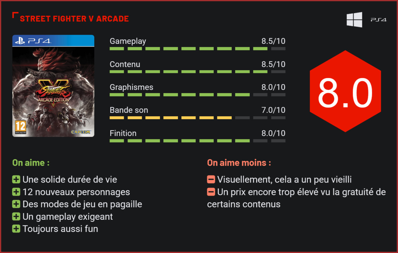 Deux ans après sa sortie, Street Fighter V signe déjà un retour en force avec une édition spéciale du jeu qui rassemble tous ses DLC et introduit plusieurs nouveautés majeures dans le jeu de baston de Capcom. Et le moins que l’on puisse dire, c’est que les mordus de jeux de combat en auront largement pour leur argent avec cette édition spéciale du jeu, sobrement nommée “Arcade Edition”, qui rassemble l’intégralité des DLC sortis jusqu’ici ainsi que quelques petites nouveautés, qui sont par ailleurs proposées gratuitement aux propriétaires de Street Fighter V. Si vous possédiez déjà l’original, inutile donc de passer à la caisse puisque cette édition du titre s’adresse exclusivement à ceux qui étaient passés à côté du jeu au moment de sa sortie… Au programme des réjouissances donc : 12 personnages supplémentaires, issus des saisons 1 et 2, qui viennent fortement renforcer le casting du jeu et offrent aujourd’hui un solide contenu aux fans de la série, mais aussi quelques nouveautés tant au niveau du gameplay que des modes de jeu. Beaucoup plus nerveux que ses ancêtres – et pour cause puisque Capcom a tenu à rendre le gameplay plus agressif en donnant un très net avantage aux joueurs qui bousculent leurs adversaires -, Street Fighter V évolue encore avec l’ajout d’un second V-Trigger pour chaque personnage, que le joueur devra sélectionner avant le match, et qui lui offrira un avantage tactique durant le combat. De nouveaux coups sont également au programme, pour chaque personnage. Solide, le gameplay de Street Fighter V reste très accessible sans toutefois manquer de profondeur. Par ailleurs, on notera l’introduction de nombreux modes de jeu supplémentaires, avec notamment un mode Arcade qui était attendu au tournant par les fans, et réserve bien des surprises, tant au niveau des Bonus Stages que des boss de fin. L’arrivée d’un mode versus en team battle apporte également une véritable bouffée d’air frais à ce Street Fighter V, qui se transforme enfin en un véritable divertissement pour les soirées entre amis. Si ce mode de jeu ne fera sans doute pas des émules dans le domaine de l’e-sport, il aura le mérite d’ouvrir de nouveaux horizons à ce jeu, désormais plus family-friendly que par le passé. Autre nouveauté qui devrait cette fois plaire aux hardcore gamers : l’introduction d’un mode Combats Supplémentaires qui nécessitera l’usage de Fight Money pour accéder aux défis payants, lesquels permettront de débloquer quantités de contenus tels que des costumes inédits ou de l’expérience. Conclusion Beaucoup plus complet que par le passé, Street Fighter V est aujourd’hui un jeu de combat très riche en contenu qui mérite le détour ne serait-ce que pour son gameplay nerveux ou la diversité de ses modes de jeu. Si, visuellement, le jeu a vieilli, il n’en reste pas moins joli, et devrait logiquement séduire les amateurs de jeux de baston qui étaient passés à côté du titre il y a deux ans – peu convaincus par son casting et ses modes de jeu. Enfin complet, Street Fighter V mérite aujourd’hui enfin le détour. Dommage qu’il ait fallu autant de temps pour en arriver là…