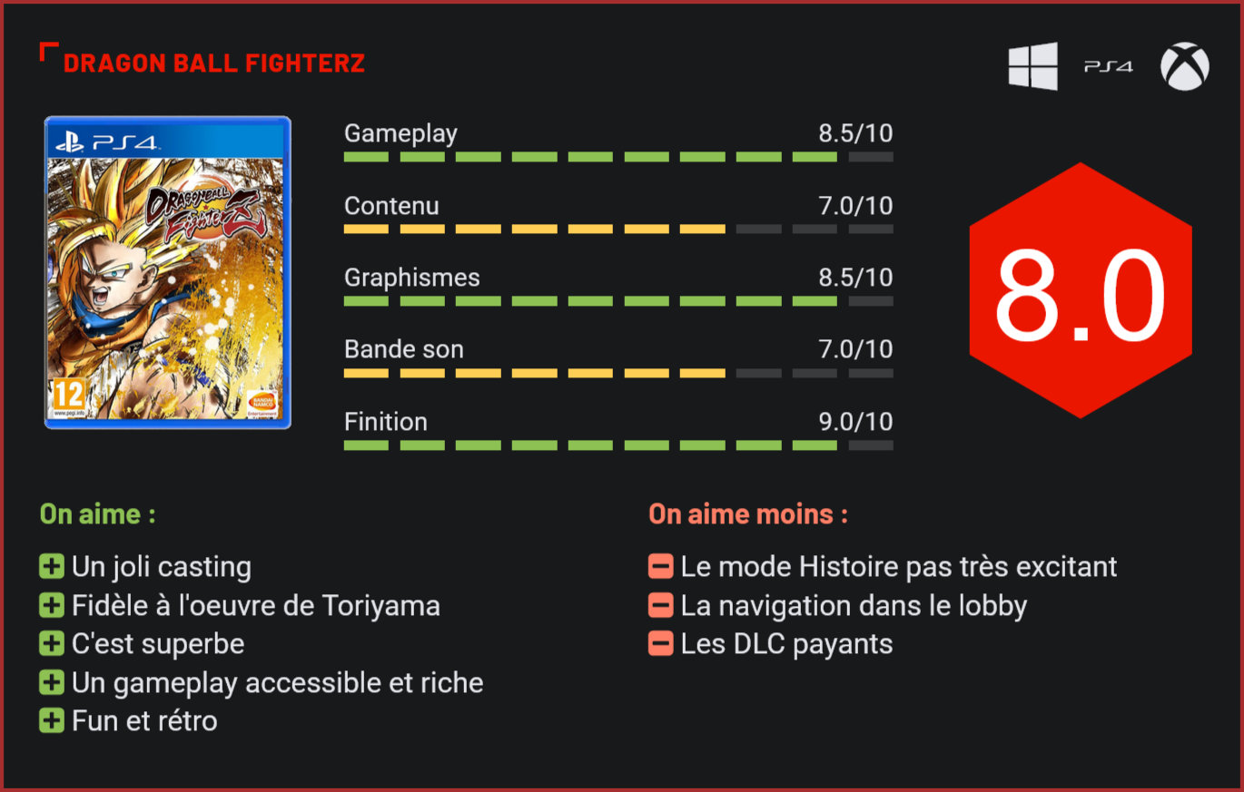 Attendu au tournant par les fans de la franchise, Dragon Ball FighterZ ne déçoit pas et s’impose même comme l’une des meilleures adaptations de la série animée en jeu vidéo. Explications. Portée à de multiples reprises en jeu vidéo, la série animée créée par le célèbre auteur Akira Toriyama revient aujourd’hui avec une nouvelle adaptation vidéoludique que l’on doit une fois encore à Namco-Bandai. Bien conscient qu’il fallait se renouveler après trois Xenoverse, l’éditeur a choisi de prendre des risques en développant un titre au design old-school qui s’inspirerait des jeux de baston en 2D des années 90. Ainsi est donc né Dragon Ball FighterZ. Développé par Arc System Works – auteurs de la série Guilty Gear -, FighterZ n’est toutefois pas un jeu de baston en 2D pure puisqu’il reprend un modèle plus moderne de 2.5D. Comprenez par là que les personnages sont bien modélisés en 3D, dans des décors animés en 2 dimensions. Et le rendu est tout bonnement époustouflant puisqu’on se croirait tout simplement dans un épisode de la série. On notera d’ailleurs que les transitions entre les dialogues, cinématiques et séquences de combat font plutôt honneur au moteur du jeu, décidemment très polyvalent. Mais avant de poursuivre sur le volet technique, il est important de préciser la nature de ce volet qui s’écarte des précédentes adaptations livrées par Namco-Bandai en surfant sur la vague nostalgique des Street Fighter, King of Fighters et autres Guilty Gear. Moins exigeants que ses modèles – Dragon Ball reste une franchise grand public et Namco Bandai ne voulait pas cibler un public de puristes -, Dragon Ball FighterZ est un jeu de combat avant tout très fun qui laisse de côté le réalisme pour se concentrer sur le dynamisme de ses affrontements. Ici, tous les personnages se valent. Si les puristes regretteront que Krilin puisse terrasser Vegeta dans un duel, l’approche d’Arc System Works rend les affrontements entre les différents personnages beaucoup plus passionnants que dans les précédents volets de la série. D’autant plus que le casting est plutôt bien fourni avec notamment C-17, C-18, Krilin, SanGoku, Vegeta, Picolo ou encore Freezer au programme des réjouissances. Certes, quelques grands absents sont à noter, mais rien de bien grave. Et on imagine d’ailleurs que Namco-Bandai ne se gênera pas pour nous servir quelques personnages en DLC par la suite… Bien qu’accessible, le jeu n’en reste pas moins technique et exigeant. Il faudra de nombreuses heures de jeu pour maîtriser tous les personnages de FighterZ, les combos, enchainements et super-attaques. Les personnages sont globalement plutôt bien équilibrés. On regrettera en revanche qu’un matraquage des boutons permette de remporter la partie. Beaucoup moins technique qu’un King of Fighters, FighterZ nécessite encore quelques ajustements. Pour faire simple, FighterZ se rapproche davantage d’un Marvel Vs Capcom que d’un Street Fighter. Et ce n’est au final pas plus mal puisque même les débutants pourront prendre leur pied. Pour autant, FighterZ n’est pas un jeu qui ne destine qu’aux débutants. Les développeurs sont parvenus à y glisser quelques subtilités. Si maîtriser les coups ne demandera pas un trop grand travail d’apprentissage, mémoriser les combinaisons gagnantes dans les enchainements aériens et maîtriser le timing se révéleront indispensables pour gagner le haut des rankings en ligne. A condition d’y passer un peu de temps, ils ne devraient avoir aucun mal à mettre une sacrée raclée aux débutants. Et c’est bien là le plus gros atout de FighterZ, qui tout en étant accessible offre une profondeur de jeu suffisante pour séduire les amateurs de jeux de baston. On notera d’ailleurs que le jeu se caractérise aussi par son approche unique en misant avant tout sur du tag-battle avec des affrontements à trois contre trois qui rendent les combats beaucoup plus stratégiques qu’il n’y paraît. Changer de personnage au bon moment permettra souvent de prendre un sérieux avantage sur son adversaire. Au niveau de son contenu, FighterZ surprend également avec une quantité impressionnante de contenus. Outre son excellent casting, le jeu offre également de nombreux modes de jeu allant du classique mode Arcade au mode Histoire – malheureusement pas très excitant, la faute à un scénario qui tarde à prendre son envol, malgré son scénario inédit. Sans oublier bien sûr le multijoueur qui représente l’épine dorsale du jeu, comme dans tout jeu de baston qui se respecte. Les affrontements en ligne sont d’une fluidité impressionnante et on ne regrettera finalement que la navigation avec les étrangers avatars qui ne plaire certainement pas à tous. L’un dans l’autre, quelque chose de plus sobre aurait tout aussi bien convenu. Sur le plan technique en revanche, FighterZ ne déçoit pas avec son moteur graphique impressionnant, ses animations dessinées à la main, ses effets visuels dignes d’une superproduction hollywoodienne et sa bande sonore originale. Bourré de références et d’une fidélité extrême à l’œuvre d’Akira Toriyama, Dragon Ball FighterZ est la perle que les fans de la série animée attendaient depuis si longtemps – et incontestablement un excellent jeu de baston se destinant tant aux débutants qu’aux passionnés. Conclusion Fidèle à l’oeuvre d’Akira Toriyama, Dragon Ball FighterZ est le jeu de combat que les fans de la série animée attendaient depuis des années. Accessible au grand public, le titre n’en garde pas moins un gameplay riche et profond. D’une beauté à couper le souffle, FighterZ est également très fun à parcourir que ce soit en solo ou en multijoueur avec ses affrontements en tag-battle. On lui regrettera toutefois un mode Histoire trop sobre et pas très excitant, qui aurait gagné à être davantage calqué sur celui de la série