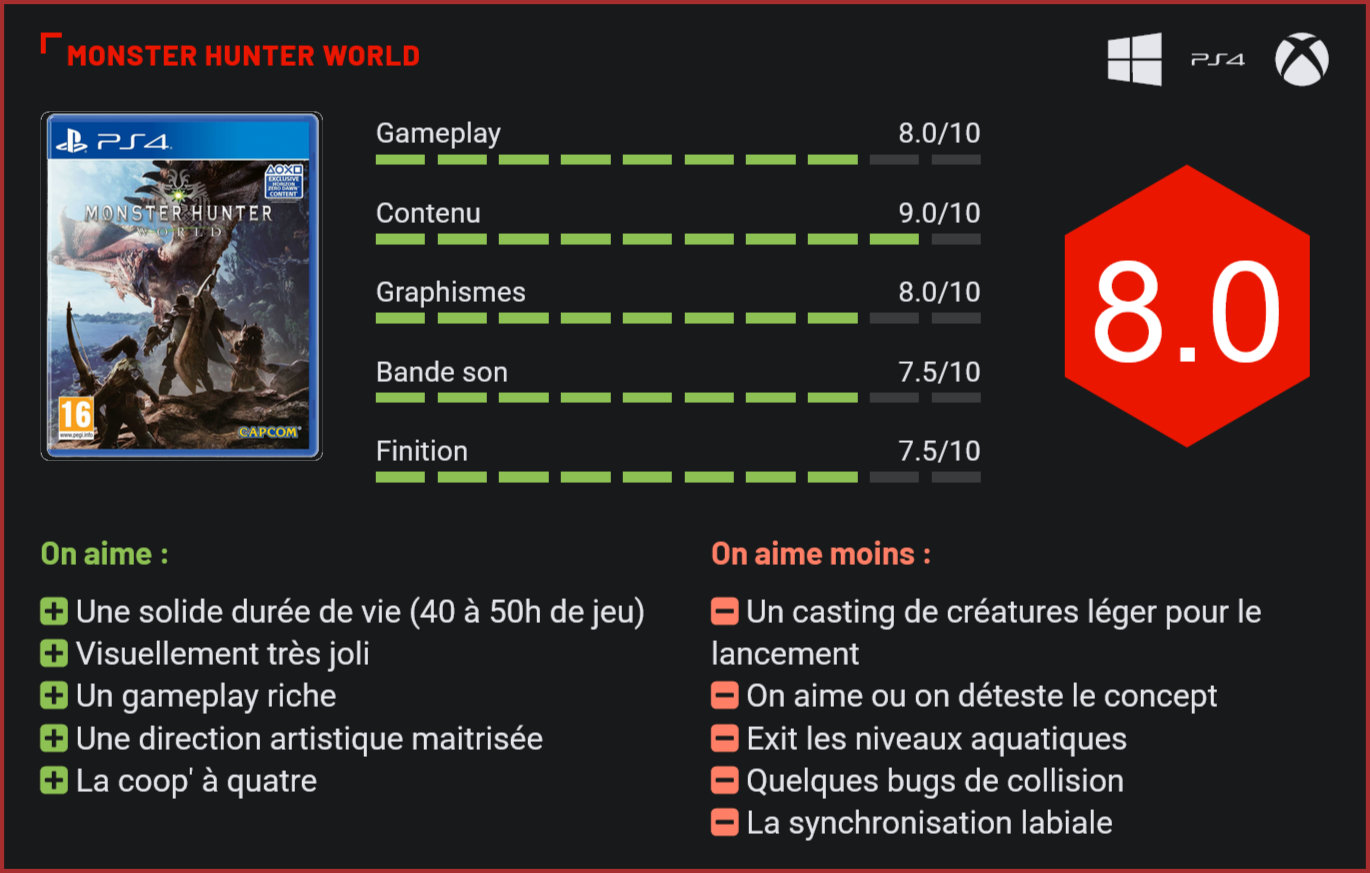 Longtemps délaissée par le grand public, la série des Monster Hunter tente aujourd’hui un retour en force avec un épisode plus accessible et qui tire brillamment parti des capacités des consoles de dernière génération. Longtemps destinée exclusivement aux hardcore-gamers, la série des Monster Hunter s’ouvre enfin au grand public avec Monster Hunter World, le dernier épisode en date, sorti sur Xbox One et PS4. Bien conscient de l’énorme potentiel de sa franchise, Capcom a décidé de lui offrir une cure de jouvence. Recyclant une grosse partie du bestiaire des précédents épisodes, Monster Hunter World conserve les mécaniques de jeu caractéristiques de la série tout en osant plus d’accessibilité. Et si dans le fonds, le jeu n’a pas beaucoup changé, son nouveau moteur graphique fait enfin honneur à la franchise. En se métamorphosant en une franchise grand public, Monster Hunter simplifie les règles du jeu, apportant un peu plus de flexibilité à son gameplay tout en expliquant davantage son fonctionnement aux novices. Comme ses ainés, Monster Hunter World est donc un jeu de chasse, et non pas un RPG ni un jeu d’aventure, comme ses visuels le laissent penser. Répétitif par nature, le titre propose de réaliser différentes missions de traque et de chasse de gigantesques créatures dans des zones de jeu de taille relativement modestes, qui présentent néanmoins l’avantage de ne plus être entrecoupées par de multiples chargement, comme c’était le cas par le passé. Pour autant, pas de monde ouvert ici, ou en tout cas pas dans la définition pure du terme puisque chaque changement de zone implique un temps de chargement. Entre chaque mission, le joueur se retrouve dans un petit village, qu’il pourra explorer pour faire le plein d’objets, améliorer son armement ou accéder à ses réserves. Les missions qui lui seront confiées tout au cours de l’aventure le forceront à traquer des créatures de plus en plus grosses et surtout de plus en plus dangereuses, seul ou à quatre en coopération. Et c’est sans doute sur ce point que le jeu gagne le plus de points puisqu’en solitaire, l’aventure peut vite se transformer en une triste balade, malgré la beauté des décors. Au niveau du gameplay, Monster Hunter World propose une expérience de jeu véritablement unique. Car ici, pas de flèche pour vous indiquer la direction à suivre, ni de barre de vie pour vos adversaires. Chaque mission est composée d’une longue séquence d’exploration / de traque, laquelle est généralement suivie par un affrontement dantesque qui mettra à rude épreuve vos nerfs et votre capacité à découvrir les failles dans la défense adverse. Car les créatures que vous rencontrerez dans l’aventure ont toutes leurs failles, et nécessiteront des approches différentes pour être terrassées. Etant donné l’absence de jauge de vie, on notera d’ailleurs qu’il faudra impérativement garder un oeil sur l’attitude des monstres pour avoir des indices sur leur état de fatigue et leur force. Durant les affrontements, le joueur devra également veiller à faire régulièrement le plein d’énergie en utilisant une potion ou un autre objet de son inventaire, mais aussi à enchainer les parades pour attaquer son ennemi au bon moment. Ne soyez également pas surpris : les affrontements dans Monster Hunter World sont longs, et peuvent parfois durer jusqu’à plusieurs minutes… Technique, le jeu n’en reste pas moins accessible. Ou e tout cas, Capcom a grandement simplifié certains mécanismes de jeu. Le concept du jeu est ainsi beaucoup mieux expliqué aux débutants, qui ne se sentiront pas “perdus” dès la première minute de jeu. Dans le même ordre d’idée, pour faciliter la tâche aux nouveaux venus, Capcom a imaginé un système de collecte d’indices qui permettra au joueur d’étudier les habitudes des différentes espèces rencontrées pour les trouver plus facilement dans le monde qui s’ouvre à eux. Ils pourront ainsi localiser plus rapidement de plus grosses bestioles à l’aide des fameuses navicioles. Pris par la main dès les premières minutes du jeu, le joueur apprendra tous les mécanismes de Monster Hunter World dans les deux premières heures de jeu. Deux heures de jeu qui ne seront guère très excitantes donc, mais l’apprentissage étant nécessaire pour mémoriser les mécanismes parfois complexes de Monster Hunter, on n’aurait probablement pas pu faire sans… Plus intéressant : la ville principale, dans laquelle le joueur reviendra pour améliorer son armement et acheter du matos entre chaque mission, offrira au joueur de nombreuses interactions. On appréciera ainsi de pouvoir facilement identifier les matériaux nécessaires pour améliorer une arme, pouvoir visualiser des mécanismes de combat avant de passer à la caisse, et obtenir de nombreuses informations sur les performances de chaque arme mise à disposition dans le jeu, chez le forgeron. On notera d’ailleurs que là aussi, Hunter impressionne en mettant à disposition 14 armes différentes qui proposent littéralement 14 styles de jeu totalement différents. N’espérez pas ainsi vous déplacer rapidement si vous avez opté pour une arme lourde. Chaque arme a ses atouts et ses inconvénients, et tous les joueurs trouveront le style qui leur convient le mieux… Si le bestiaire est varié (29 créatures tout de même), on regrettera tout de même qu’il soit autant en retrait par rapport aux précédents épisodes. Au niveau des décors en revanche, la diversité est au programme et les joueurs pourront explorer un univers bouillonnant de vie et d’une richesse impressionnante. Dommage toutefois qu’il ne soit plus possible d’explorer les fonds marins, comme dans les précédents opus… Toutefois, critiquer Monster Hunter World pour son manque de diversité serait mal venu, vu l’énorme durée de vie du titre – qui frôle les 40 heures -, et 