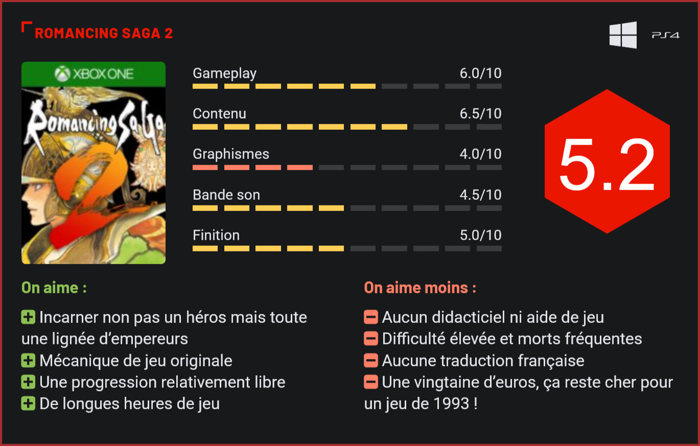 RPG japonais jamais sorti sur les consoles de salon de nos contrées, Romancing Saga 2 nous provient de l’année 1993 et est une production Square Enix. Un gage de qualité pour un titre riche et délicieusement rétro, mais aussi quelque peu archaïque. Avant sa sortie en 2016 sur téléphones mobiles, Romancing SaGa 2 n’avait jamais pointé le bout de son nez en Europe. Il restait l’exclusivité des japonais qui l’ont vu sortir en 1993 sur Super Nintendo (ou Super Famicom, comme on dit là-bas). Un manquement qui est aujourd’hui enfin réparé, le titre étant sorti dans le courant du mois de décembre sur PC, PS4, Xbox One et Switch. Le déroulement de Romancing SaGa 2 (qui est issu de la franchise SaGa) est différent que dans la plupart des RPG de l’époque puisque le titre ne vous attribue pas une équipe et un héros prédéfinis, mais offre la possibilité d’incarner une lignée entière d’empereurs. L’histoire est racontée en flashbacks et se base sur la succession, mettant en scène plusieurs empereurs qui se transmettent de génération en génération la gestion du pays, ainsi que les pouvoirs qu’ils ont acquis au cours de leurs aventures. Faire prospérer son empire en éliminant les sept démons installés dans les diverses régions du pays constituant le cœur de l’histoire. L’empereur est mort, vive l’empereur ! Au fil des générations, le joueur prend le contrôle de différents héros placés dans la ligne de succession impériale. Inutile donc de s’attacher dès le début à votre héros car celui-ci va disparaître rapidement au profit de son successeur, et ainsi de suite au fil de l’histoire et/ou de vos défaites. Le jeu ne s’arrête pour ainsi dire jamais en cas de défaite, puisque une fois mort au combat (ou si le scénario l’impose), vous devrez choisir un nouveau héros/successeur et recruter de nouveaux combattants pour votre équipe. En plus des traditionnels points de santé (HP), chaque personnage possède des Life Points (LP) qui représentent leur nombre de vie. Une fois les LP écoulés, le personnage disparaît de l’aventure pour de bon. Un système cruel qui vous impose de choisir parmi plusieurs candidats un nouvel empereur dès la mort du dernier en poste afin de mener à bien les missions de l’empire. Un empire à faire prospérer Les missions proposées consistent à éliminer les démons qui pullulent sur vos terres, augmenter les richesses de votre empire et financer divers travaux (fabrication de nouveaux équipements, création d’annexes pour développer de nouvelles compétences, etc.). Cette gestion des ressources se fait très naturellement, en dialoguant avec les nombreux PNJ et en validant des ordres lors des dialogues. Chaque joueur peut ainsi faire grandir son Empire comme il l’entend, l’expérience vécue étant tout à fait différente d’une partie à l’autre (même si la fin, elle, est identique pour tous). Pour ce qui est des combats, Romancing SaGa 2 fourmille d’ennemis directement visibles à l’écran qui se mettront à vous poursuivre dès qu’ils vous auront repérés. S’ensuit un combat classique au tour par tour, où chaque personnage (les soldats, mages et archers traditionnels, auxquels s’ajoutent les ninjas et médiums propres à cette édition) dispose de plusieurs armes pour attaquer. Certaines sont plus efficaces que d’autres en fonction des ennemis, et une bonne gestion de l’équipement (et de l’inventaire en général) sera essentielle pour remporter la victoire. Au fil des combats, les personnages ne gagnent pas de niveau mais voient leurs HP augmenter et leurs armes s’améliorer, ce qui débloque de nouvelles attaques pour celles-ci (jusqu’à huit par arme, de quoi varier les plaisirs). Notons que la formation adoptée par vos combats aura également son importance, car elle influe sur l’ordre d’attaque et l’encaissement des coups adverses. A l’ancienne Toute cette gestion passe par des menus relativement clairs, mais le gros hic c’est que Romancing Saga 2 ne vous explique rien de tout cela et vous plonge directement dans l’histoire sans l’ombre d’un didacticiel ou d’une aide de jeu. Les non initiés aux jeux de rôles risquent d’être rapidement laissés sur la touche, d’autant qu’il est donc très courant de mourir et de voir son équipe disparaître pour être remplacée par une autre dès qu’elle tombe au combat. Un poil déstabilisant et décourageant ! Ajoutez à cela le fait que le titre n’a pas été traduit en français (tout est en anglais), et il paraîtra à première vue carrément archaïque voire un brin vieillot aux yeux de nombreux joueurs même s’il a bénéficié d’un léger rafraîchissement graphique. Pas fondamentalement perturbé sur la forme (le titre conserve ses bons gros pixels et ses animations basiques d’antan), cette nouvelle mouture de Romancing SaGa 2 propose toutefois quelques contenus exclusifs tels qu’un nouveau donjon, deux nouvelles classes et un mode New Game+. Conclusion Expérimentations, sacrifices, patience et persistance sont les mots d’ordre afin d’apprécier Romancing SaGa 2 à sa juste valeur. Peu accessible de prime abord, il est avant tout destiné aux connaisseurs, aux purs et durs du JRPG habitués aux systèmes qui savent faire face à la difficulté. L’absence de traduction française et de didacticiel risque par contre de laisser les joueurs les moins expérimentés sur le carreau, ce qui est bien dommage car le titre de Square Enix déploie une mécanique des plus intéressantes, qui en fait un JRPG assez unique en son genre.