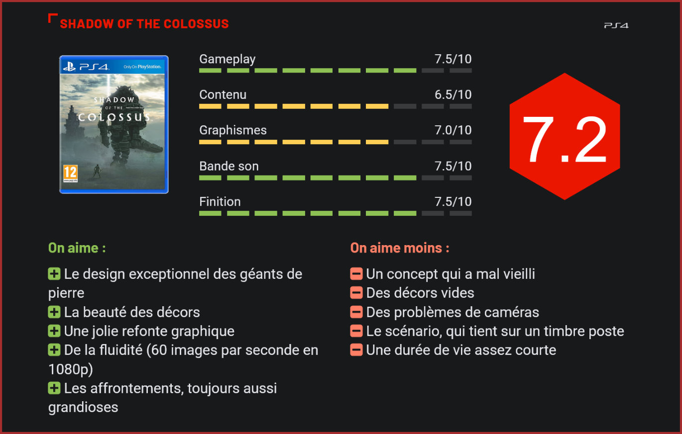 La PlayStation 4 de Sony accueille en ce mois de février une nouvelle exclusivité de taille, avec le remaster – en bonne et due forme – de Shadow of the Colossus, un véritable ovni sorti à l’époque sur PS2 et qui a gagné au fil des années un statut de jeu culte. Considéré comme un véritable chef d’oeuvre par certains joueurs, comme un petit ovni du jeu vidéo par d’autres, Shadow of the Colossus n’avait en tout cas laissé personne indifférent au moment de sa sortie, en 2005. Imaginé par Fumito Ueda – le papa d’Ico et de The Last Guardian -, le jeu avait déjà eu droit à une première réédition sur PS3. Cette fois, c’est le studio Bluepoint Games qui s’est collé à la tâche, pour nous concocter un remake digne de ce nom. Et le résultat est pour une fois à la hauteur de nos attentes! Car si les éditeurs ont souvent tendance à se contenter de remasters légers pour recycler leur catalogue de jeux, Bluepoint Games nous livre une copie entièrement revue et qui rend brillamment hommage à l’œuvre de Fumito Ueda, un peu à l’image de ce qu’Activision a fait avec le remake de Crash Bandicoot sur PS4. L’essentiel du travail ici porte toutefois sur l’esthétique du titre, et non pas sur le gameplay ou les mécaniques de jeu. Les décors du titre ont ainsi été entièrement revus et sont désormais beaucoup plus détaillés. Végétation luxuriante, reflets dans l’eau et rayons de soleil qui transpercent le ciel nuageux donnent vie à un univers que beaucoup considéraient trop épuré sur les précédentes générations de consoles. Le travail réalisé par Bluepoint Games est colossal. Et le résultat à la hauteur de l’attente des fans de l’univers fantastique d’Ueda. Toutefois, même si le résultat est grandiose, beaucoup d’eau a coulé sous les ponts depuis la sortie du titre sur PS2, et le titre a quelque peu perdu de son génie. Au moment de sa sortie, Shadow of the Colossus était l’un des premiers titres à proposer une aventure dans un monde ouvert. Mais aujourd’hui, pratiquement tous les titres laissent le joueur parcourir leur univers librement. Avec les années, le concept du jeu a vieilli, et pour ceux qui n’avaient jamais touché au jeu à l’époque, sur PS2, le premier contact risque d’être décisif. Car oui, Shadow of the Colossus est une aventure grandiose et enivrante dans des décors poétiques (ou vides, c’est selon). Mais le “chef d’oeuvre” d’Ueda n’en reste pas moins un jeu d’aventure très répétitif, dont le scénario tient sur un timbre poste. Le joueur y incarne un jeune garçon nommé Wanda qui va partir à la chasse aux géants pour tenter de sauver sa bien-aimée. Chargé d’éliminer les 12 géants du jeu, il devra traverser les steppes vides du monde imaginé par Ueda pour se rapprocher des monstres, puis les attaquer en utilisant son arc à flèches et son épée, qui lui montrera le Talon d’Achille du monstre. Chaque affrontement sera l’occasion de mettre à l’épreuve vos talents de grimpeur. Car pour terrasser ces monstres, le joueur devra grimper sur leur dos, et faire preuve d’une certaine dextérité. Chaque mouvement consommera son énergie. Il sera dès lors important d’éviter les mouvements superflus et d’opérer des choix stratégiques. Une fois le monstre terrassé, le joueur devra revenir dans le sanctuaire pour se voir assigner sa prochaine mission. Répétitif par nature, le jeu doit tout son intérêt à ses affrontements contre des boss titanesques et à ses paysages splendides. Toutefois, à moins d’être complètement aveuglé par la beauté de son univers, difficile de ne pas remarquer ses nombreux défauts dès la première partie : de ses décors vides, qui se laissent toutefois volontiers parcourir sur le dos de notre fidèle canasson, à la gestion des caméras désastreuse, en passant par son gameplay souvent trop approximatif. Difficile de trouver dans ce titre la “perfection” vantée par de si nombreux médias spécialisés. Et ce, plus encore aujourd’hui qu’au moment où le jeu est sorti. N’ayons pas peur de le dire : si Shadow of the Colossus sortait aujourd’hui, la presse rendrait sans doute un avis beaucoup plus partagé sur ce titre, qui a décidément bien mal vieilli au fil des années. Les mécaniques de jeu, bien huilées pour l’époque, n’ont aujourd’hui plus aucun sens. Et on en vient à regretter que Bluepoint Games n’ait pas ajouté quelques petites nouveautés pour nous distraire entre deux parties de “chasse”. Dans le même ordre d’esprit, le scénario de Shadow of the Colossus reste un beau gâchis. D’une part, parce que l’univers fantastique du jeu méritait d’être plus développé. D’autre part, parce que le character design exceptionnel des créatures ne reflète pas de la qualité intrinsèque du jeu. Oui, Shadow of the Colossus nous ouvre les portes d’un univers fantastique, mais au niveau de la narration, Ueda s’est malheureusement contenté du minimum syndical – exception faite de la superbe cinématique d’introduction. Ceci étant, difficile de résister aux charmes d’un titre au concept aussi original, qui mérite toujours aujourd’hui son statut d’ovni. Difficile aussi de ne pas apprécier à sa juste valeur le travail de Bluepoint Games sur le jeu, tant au niveau graphique (voir dans le visuel présenté ci-dessus le passage opéré de la PS2 à la PS4) qu’au niveau de la fluidité du titre (qui tourne désormais à 60 images par seconde). Les multiples petits ajouts, du mode Photo aux filtres qui permettent de changer les couleurs du jeu, en n’oubliant pas la bande sonore, partiellement revue, achèveront sans doute de convaincre les fans d’investir dans ce remake qui mérite assurément le détour si l’univers d’Ueda vous a toujours séduit. Conclusion S’il demeure un incontournable, Shadow of the Colossus a toutefois très mal vieilli. Répétit