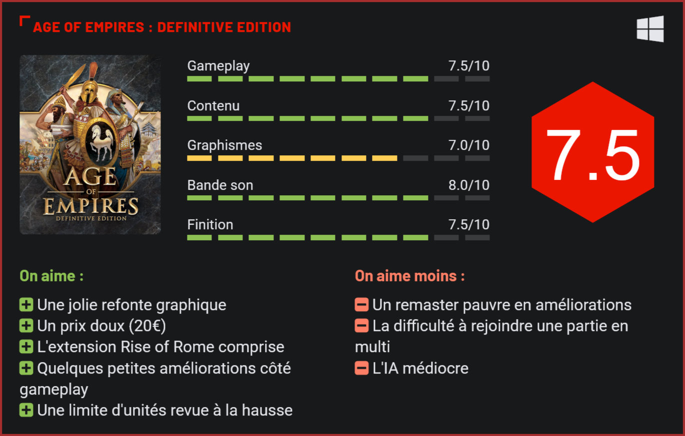 Après avoir remis au goût du jour Age of Empires 2 et Age of Mythology, Microsoft nous livre une refonte du premier volet de la franchise avec un remaster qui s’adresse avant tout aux plus nostalgiques d’entre nous. Nombreux sont les joueurs qui se souviennent du premier Age of Empires. Et pour cause puisque le titre d’Ensemble Studios avait pratiquement créé un genre à lui seul en mixant brillamment stratégie en temps réel et gestion. 20 ans après sa sortie sur PC, Microsoft nous livre un remaster du jeu qui est surtout l’occasion pour le géant de l’informatique de dépoussiérer sa franchise avant de nous livrer le quatrième épisode tant attendu. Et vu l’âge du jeu, un joli coup de pinceau était nécessaire… Dans la pratique, Microsoft nous livre toutefois une refonte assez pauvre du jeu. Le contenu est scrupuleusement identique à celui du jeu originel, à ceci près que le titre est désormais livré avec son extension The Rise of Rome. Aucune extension ni contenu inédit n’est en revanche au programme, contrairement aux remasters d’Age of Empires 2 et Age of Mythology… Le contenu du jeu étant relativement pauvre – par rapport à ses suites -, il aurait été bienvenu de découvrir de nouvelles civilisations ou unités. Au niveau des mécanismes de jeu, le studio de développement a procédé à quelques ajustements qui sont plutôt les bienvenus, ajoutant par exemple quelques automatismes dans le comportement des villageois, qui sont désormais capables de prendre des décisions par eux-mêmes lorsque le travail vient à manquer, et n’attendent plus bêtement qu’on leur donne un ordre. La limite d’unités est revue à la hausse, dépassant désormais le seuil des 250 unités. Enfin, comme dans Rise of Rome, il n’est plus nécessaire de commander une unité à la fois – le joueur peut naturellement commander plusieurs unités, qui sortiront des casernes l’une après l’autre. Le concept, lui, n’a toujours pas changé. A mi-chemin entre un jeu de gestion et un jeu de stratégie, Age of Empires propose de bâtir son propre empire en solo ou en multijoueur en partant d’un petit village préhistorique qu’il faudra faire évoluer, tout d’abord en partant à la recherche de ressources (pierre, bois, nourriture et or) avec ses villageois, puis en construisant une ville et en créant une armée qui permettra au joueur d’affronter ses adversaires sur la gigantesque carte. Au cours de la partie, le joueur devra ainsi gérer ressources, combats, développement de son économie, alliances et évolution technologique. Si le concept a un peu vieilli, il n’en reste pas moins rudement efficace et tout bonnement passionnant. Les parties pouvant durer plusieurs heures, il faudra être patient, et stratégique tant dans les affrontements que dans ses relations avec les autres joueurs. En multijoueur, il sera possible de jouer en équipe (jusqu’à 4 contre 4) ou en free-for-all. Une grande partie de l’intérêt du jeu repose toutefois sur la capacité des joueurs à forger de nouvelles alliances en cours de partie et à échanger des denrées pour terrasser leurs ennemis. Malheureusement, et c’est sans doute le plus gros défaut du jeu : pas de Steam. Microsoft a opté pour le support exclusif de son Xbox Live, ce qui devrait avoir un gros impact sur l’aspect communautaire du jeu. Lors de nos différents essais, nous avons ainsi constatés de grosses difficultés à rejoindre une partie multijoueur. La décision de ne pas rejoindre le catalogue de jeux de Steam est d’autant plus surprenante que les autres épisodes de la série sont eux bien disponibles sur la plate-forme… Sur le plan technique, le studio de développement a opéré un travail extraordinaire. Fidèle au matériau d’origine, le remaster conserve le design caractéristique du tout premier Age of Empires tout en améliorant l’affichage (avec un zoom qui s’active avec la molette de la souris), la fluidité du jeu et le rendu global. Comme vous pourrez le voir dans l’image présentée ci-dessus, la différence saute aux yeux sans pour autant nous faire éclater la rétine. On aurait toutefois aimé que Microsoft aille plus loin dans le travail en revoyant par exemple l’intelligence des unités – parfois désastreuse – ou le mode solo – trop proche d’un didacticiel. Pour 20€, difficile de se plaindre tant le travail réalisé rend honneur à ce chef d’œuvre du jeu vidéo. Mais à n’en pas douter, Age of Empires aurait mérité un hommage encore plus vibrant. Conclusion 20 ans après sa sortie, Age of Empires s’offre un remaster pauvre en contenu mais qui a le mérite de brillamment remettre au goût du jour ce classique du RTS. Visuellement très réussi, ce remake séduira avant tout les joueurs nostalgiques qui ont passé des centaines d’heures sur le jeu. Outre les graphismes, Microsoft a profité de l’occasion pour apporter quelques retouches au gameplay. Toutefois, difficile de ne pas ressentir une impression de trop peu après plusieurs heures de jeu. Le contenu reste e effet relativement pauvre par rapport aux standards actuels, l’intelligence artificielle a très mal vieilli et l’absence de compatibilité avec Steam rend l’accès aux parties en multijoueur plus complexe que d’ordinaire.