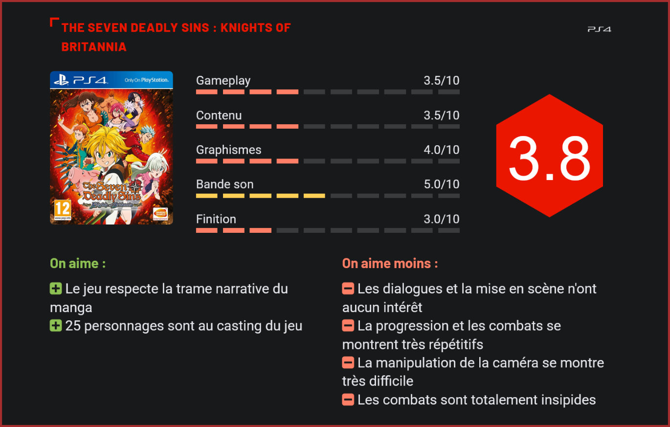 Après une première adaptation du manga sur Nintendo 3DS, Bandaï-Namco remet le couvert sur consoles de salon. Un deuxième essai qui n’aurait pas forcément dû voir le jour. Si le titre « Seven Deadly Sins » vous dit quelque chose, c’est tout à fait normal. Il s’agit en réalité d’un manga écrit et dessiné par Nakaba Suzuki, sorti en 2012. L’animé a depuis le temps été porté en série en 2014 et est disponible sur Netflix Original. L’histoire de The Seven Deadly Sins est donc plutôt d’actualité, notons d’ailleurs qu’une adaptation en film d’animation est prévu pour cette été. Est-ce que cette aura commerciale explique pourquoi Bandaï-Namco s’est lancé dans un nouveau portage sur console ? Possible. Une adaptation fidèle, mais sans intérêt Niveau histoire, rien de nouveau puisque le jeu se base essentiellement sur l’animé. Une adaptation assez fidèle de la trame narrative originale saupoudrée d’une multitude de combats en tout genre. Malheureusement, cela reste assez léger. Pour les non-initiés, résumons : au sein du Royaume de Liones, les choses ne vont plus. Après l’assassinat sauvage du roi,le Grand Maître des Chevaliers Zaratras, ces mêmes chevaliers sacrés ont pris le pouvoir au détriment des intérêts du peuple dont ils sont supposés être les protecteurs. L’ordre est maintenu d’une main forte, sans tranquillité pour les petites gens. Le seul espoir se trouve dans les Sept Péchés Capitaux (Seven Deadly Sins), un groupe de chevaliers qui se cachent depuis 10 ans après avoir raté leur coup d’état contre la couronne. Pourtant, l’héritière du trône, Elizabeth s’est lancé à leur recherche afin de contrecarrer le pouvoir des Grands Chevaliers Sacrés et leurs plans machiavéliques. Si le jeu a le mérite de respecter la trame narrative du manga – bon point pour les fans -, cela n’empêche pas le sentiment abrupt que l’on peut ressentir en plongeant dans l’histoire. Les personnages principaux sont introduits de manière frontale, sans réellement les intégrer subtilement à la trame narrative ce qui sera un problème pour les non-initiés désireux, au final, de comprendre l’histoire. Par ailleurs, les dialogues se montrent totalement sans intérêt, ce qui rendra encore plus difficile l’immersion et la compréhension des enjeux de l’histoire. Le développeur NatsumeAtari prend plutôt la position d’une adaptation faite pour les fans que pour faire découvrir l’univers à de potentiels nouveaux amateurs. Jeu d’action qui manque… d’action Pour ce qui est du mode de jeu, on peut clairement parler de déception. La majorité du jeu se résumant à des dialogues et des phases de combats. Même pour un titre d’action, cela reste assez limité. Les phases de combats se montrent sans réel intérêt. En dehors de quelques attaques magiques sympathiques, les phases critiques ne se démarquent pas vraiment. Au final, les combats se montrent répétitifs, le joueur enchaînant les ennemis qu’il balaye du revers de la main. Les affrontements sont également desservis par la caméra qui se montre difficile à contrôler et qui virevolte comme bon lui semble. Un peu frustrant quand on essaye de démonter les méchants. La possibilité de se téléporter vers un ennemi vient légèrement corriger ce défaut, mais pas totalement. L’action du jeu se divise entre des phases de dialogues insipides, des combats inintéressants et des balades de santé sur la carte grâce au bar-cochon, le Boar Hat, l’un des seuls points sympathiques du jeu. Le bar-cochon servant à se déplacer d’un point A à un point B sans – encore une fois – réel intérêt si ce n’est d’admirer cet étrange énergumène. En ce qui concerne les quêtes qui nous forceront à découvrir la carte, l’impression de nous prendre par la main pour nous confronter à des mini-jeux est légitime. Combattre une horde de petits soldats, cueillir divers objets au sol, massacrer le plus de monde suivant un chrono et, évidemment, dévaster les personnages iconiques de la saga. Autre point qui peut amener le joueur au péché de la colère : les tutoriels. Ces tableaux expliquant à la fois les phases de combats et de progression, voire de l’histoire, apparaissent de manière brutale à l’écran, sans crier garde et bloquent à la fois le jeu et les potentiels sentiments d’excitation avant un affrontement. Attention les yeux Visuellement, le constat est le même que pour les combats : rien d’intéressant. Mais c’est justement durant les phases d’affrontements que les décors sont les plus “remarquables” puisque les attaques magiques et basiques offrent un joli spectacle par rapport au reste. Le fait que les décors soient destructibles durant les combats apporte également un peu de cachet. Malheureusement, les textures restent grossières et les couleurs sont tantôt criardes, tantôt absentes. Autrement dit, la réalisation est totalement indigne d’un support comme la PS4… On notera également l’apparition des dialogues en français à l’écran – un bon point, et une caractéristique plutôt surprenante pour une aussi petite production. Au niveau des musiques, celles-ci encadrent parfaitement les phases d’affrontement de manière épique, ce qui n’est pas pour déplaire. Il est toutefois regrettable que celles-ci ne soient pas les mêmes que pour la série animée. Conclusion Si l’idée d’adapter Seven Deadly Sins était séduisante sur le papier, la pratique n’est pas vraiment concluante. Pour un jeu d’action, les combats font plus de bruits que ne montrent des choses concrètement intéressantes. Répétitif et sans enjeux, Seven Deadly Sins est un jeu fade qui laisse un goût amère en bouche. Les segments narratifs – dialogues et mise en scène – sont tout aussi insipides ce qui laisse penser que Bandaï-Namco s’est dépêché de sortir le jeu pour surfer sur la vague commer