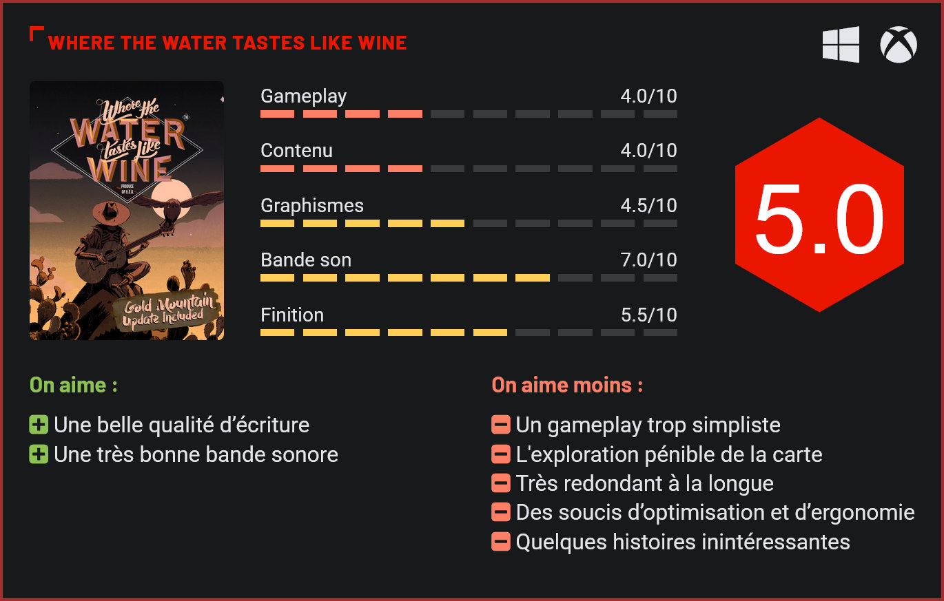 Véritable OVNI sorti à la fin du mois de février sur PC, Where the Water Tastes Like Wine plonge le joueur dans le folklore et l’univers du vagabondage à l’américaine pour revisiter à sa sauce le jeu narratif. Une expérience aussi épurée qu’unique en son genre. Issu du studio indépendant Dim Bulb Games, Where the Water Tastes Like Wine propose un road trip (à pied) au cœur d’une Amérique remplie de marginaux, touristes déboussolés et autres vagabonds. Après une partie de poker perdue face à un loup démoniaque, le joueur incarne un squelette géant qui explore le moindre recoin de la carte des États-Unis dans le but d’y récolter un maximum d’histoires, contes et autres légendes tour à tour tendres, effrayantes, palpitantes ou drôles. Des histoires qu’il sera à son tour possible de raconter à différents personnages (16 en tout) lors d’une conversation nocturne autour d’un feu. Le jeu se déroule ainsi en deux grandes phases : l’une où l’on foule, état par état, une carte modélisée en 3D des États-Unis afin de dénicher la moindre histoire qui s’y cache, et l’autre où l’on choisit de raconter ces histoires à différents protagonistes en fonction d’une thématique précise. Si le joueur choisi de raconter la bonne histoire, l’intérêt (symbolisé par un œil qui s’ouvre petit à petit en haut de l’écran) de votre interlocuteur s’éveille et, au terme de la nuit, ce denier pourra vous confier un récit plus important. Dans la première phase, le ton des histoires peut parfois être orienté par le biais d’un choix de réponse, et, une fois apprises, elles peuvent aussi être enjolivées ou détournées au fil de vos rencontres. Quelques autres mécaniques interviennent dans le gameplay (comme la possibilité de faire du stop, prendre un train ou devoir gérer son argent ou la faim), mais cela n’a finalement que peu d’intérêt et ressemble plus à des ajouts pour tenter de diversifier l’ensemble que de véritables mécaniques bien pensées. Le but du jeu est littéralement de nous raconter des histoires, à la manière d’un livre illustré. Très épuré d’un point de vue visuel, le jeu propose d’ailleurs peu d’animations, et ce sont des vignettes fixes qui illustrent les récits. Le style graphique adopté est assez sombre, dans des tons gris, bruns et verts, et les dessins affichent un trait noir très marqué qui appuie le style si particulier du titre. Les phases d’exploration sont par contre beaucoup moins séduisantes, avec une carte très basique et une sorte de papier peint baveux en guise d’horizon. Ajoutez à cela la cadence franchement lente du personnage dans ses déplacements et de nombreuses saccades, et vous obtenez une progression assez moche et ennuyante sur celle-ci. L’ergonomie est de son côté elle aussi assez pénible, avec une interface manquant cruellement de clarté. Heureusement, la plupart des histoires sont très bien écrites et seules quelques-unes d’entre elles s’avèrent inintéressantes. Le jeu mise tout sur sa qualité d’écriture et sur son atmosphère, qui est rehaussée par une excellente bande-son, même si cette dernière peut s’avérer redondante à la longue. Il est d’ailleurs amusant de retrouver le chanteur Sting au casting vocal, l’ancien leader du groupe The Police doublant la voix du loup que vous rencontrez au tout début de l’aventure, dont on est finalement plus spectateur qu’acteur, le jeu se laissant plus lire et regarder que véritablement jouer. Certains apprécieront, d’autres rejetteront purement et simplement la proposition qui est à ce point épurée à presque tous les niveaux (sauf en ce qui concerne l’écriture des histoires, donc) que l’on aurait tendance à préférer se plonger dans un bon vieux livre fait de papier et d’encre. Conclusion Where the Water Tastes Like Wine est un jeu qui se regarde et se lit plutôt qu’il ne se joue. Épuré tant au niveau du gameplay que de son esthétique, ce titre indépendant propose une expérience purement narrative, ou presque, dans laquelle il faut pouvoir s’immerger. Un jeu totalement à part dans le paysage vidéoludique actuel, bourré de petits défauts, mais qui mérite que l’on y jette un petit coup d’œil. On vous conseillera toutefois d’attendre de futures soldes pour vous y essayer, le prix de base étant un peu élevé (une vingtaine d’euros) pour ce type de produit bancal qui manque de finition.