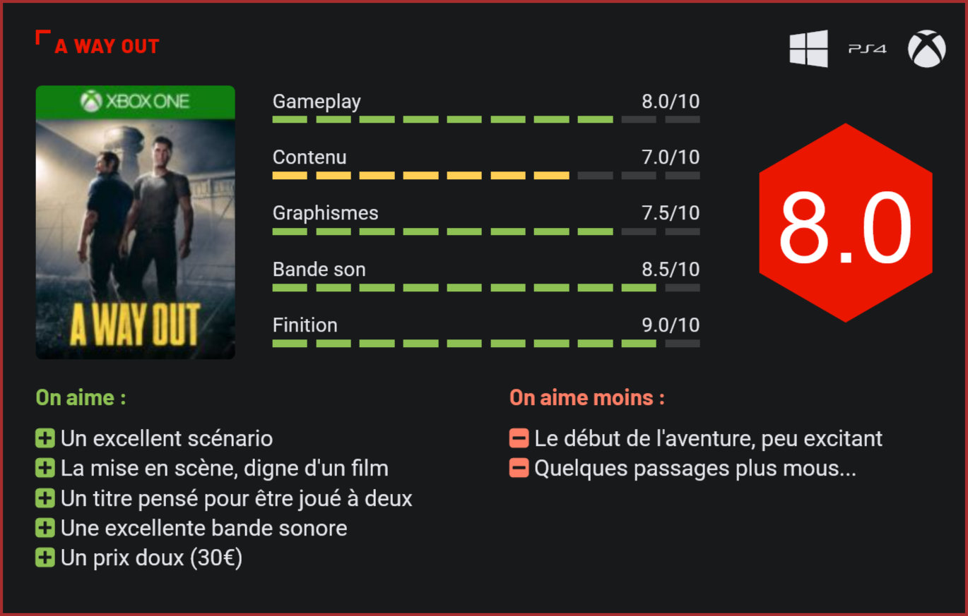 Imaginé par les créateurs de “Brothers: A Tale of Two Sons”, “A Way Out” est le second jeu à intégrer le programme EA Originals, qui met en avant de petites productions indépendantes. Second jeu dirigé par Josef Fares – le “papa” du hit Brothers: A Tale of Two Sons et réalisateur de formation, A Way Out est également le second jeu à intégrer le programme EA Originals, après Fé. Ambitieux, le titre reprend le concept de Brothers: A Tale of Two Sons en proposant une aventure se jouant exclusivement en coopération, tout en plongeant le joueur dans un scénario plus réaliste, mais aussi beaucoup plus sombre. Jouable en ligne ou en écran-splitté, A Way Out hérite de nombreux éléments propres au septième art, à commencer par sa mise en scène digne d’une grosse production hollywoodienne, ses dialogues soignés, son sens du timing et le cadrage qui se focalise parfaitement sur l’action. Au début de l’aventure, les deux joueurs remarqueront ainsi que les personnages qu’ils incarnent apparaissent de part et d’autre de l’écran, dans deux cadres séparés. Ces deux cadres fusionneront – occasionnellement -, s’agrandiront ou se réduiront, selon les occasions et l’importance que prendra un personnage dans la narration. Brillamment construit, A Way Out rappelle à chaque instant qu’il est avant tout un titre qui a été pensé pour être joué à deux. Au début de l’aventure, les joueurs devront choisir le personnage qui leur correspond le mieux. Ils auront le choix entre deux profils, Léo et Vincent, deux personnages qui se sont retrouvés malgré eux en taule et tenteront par tous les moyens de quitter la prison. Pas de suspens ici puisque l’aventure dirige naturellement le joueur vers cette escapade. Les deux premières heures de jeu permettront aux joueurs de découvrir les mécanismes du jeu avant de démarrer la véritable aventure. Car en dépit des apparences, le passage par la case prison ne vous occupera que deux petites heures seulement – après quoi l’aventure réservera son lot de surprises et courses-poursuites effrénées. Notons d’ailleurs que si une bonne partie du gameplay repose sur l’exploration et la plate-forme, le joueur sera également amené à prendre part à des gunfights, à conduire différents véhicules et à affronter ses ennemis au corps à corps. A Way Out offre une diversité de gameplay proprement impressionnante. Car outre creuser un trou derrière le siège des W.C., défendre sa réputation face aux bras lourds de la prison et construire son plan d’évasion, le joueur pourra également prendre part à de nombreuses activités secondaires – des haltères au baseball en passant par le Puissance 4 et le jeu de fléchettes. Il existe dans ce jeu des centaines de façons de passer son temps sans progresser dans l’aventure, et c’est bien là ce qui fait tout son charme. En outre, on remarquera que toutes les séquences de jeu sont parfaitement maîtrisées et procurent de solides sensations, en ce compris la descente en rafting et les courses poursuites motorisées. Bourré de références, le jeu d’Hazelight mélange brillamment les genres pour nous offrir une expérience véritablement inédite. Et si certains lui reprocheront un rythme qui a tendance à parfois fortement ralentir, et un début d’aventure pas très excitant, le jeu d’Hazelight n’en reste pas moins un joli tour de force, et une formidable aventure à vivre entre amis. Alors certes, le jeu n’est pas bien long – comptez 5 à 6 heures en ligne droite -, mais pour 30€, on a droit à une expérience qui mérite largement le détour et offre enfin quelque chose de rafraichissant au joueur. Passionnant de bout en bout, A Way Out séduit surtout par son sens de la mise en scène et sa réalisation technique, très impressionnante pour une petite production. Car à défaut d’être une claque, A Way Out est un titre beau, très beau même, avec un character design soigné, une mise en scène d’exception, des décors à couper le souffle et une animation exceptionnelle. Si tous les niveaux ne se valent pas, on attribuera toutefois une médaille aux niveaux se déroulant en extérieur, qui sont l’occasion de découvrir des décors parfois très poétiques. L’excellente bande-sonore du jeu (des bruitages aux morceaux) ne fait que renforcer l’immersion dans cet univers sombre, créé par un directeur qui maîtrise parfaitement toutes les ficelles du métier. On notera d’ailleurs que sur le plan narratif, A Way Out ne déçoit pas avec un scénario qui nous tient en haleine de bout en bout, et un final absolument grandiose – et, une fois n’est pas coutume, totalement inattendu. Conclusion Franche réussite à tous les niveaux, A Way Out est un titre qui a été entièrement pensé pour être joué en multijoueur et procure des sensations totalement inédit. Véritable bouffée d’air frais pour les joueurs en manque de sensations fortes, le titre d’Hazelight propose une aventure haletante dans la peau de deux taulards en fuite. S’inspirant du septième art, le jeu d’Hazelight séduit pas sa réalisation, la diversité des séquences de jeu et son sens de la mise en scène. Si on lui reprochera quelques passages plus mous, et un début d’aventure qui pose les bases, difficile de ne pas être séduit par ce projet ambitieux, qui a le mérite de nous être proposé à moins de 30€…