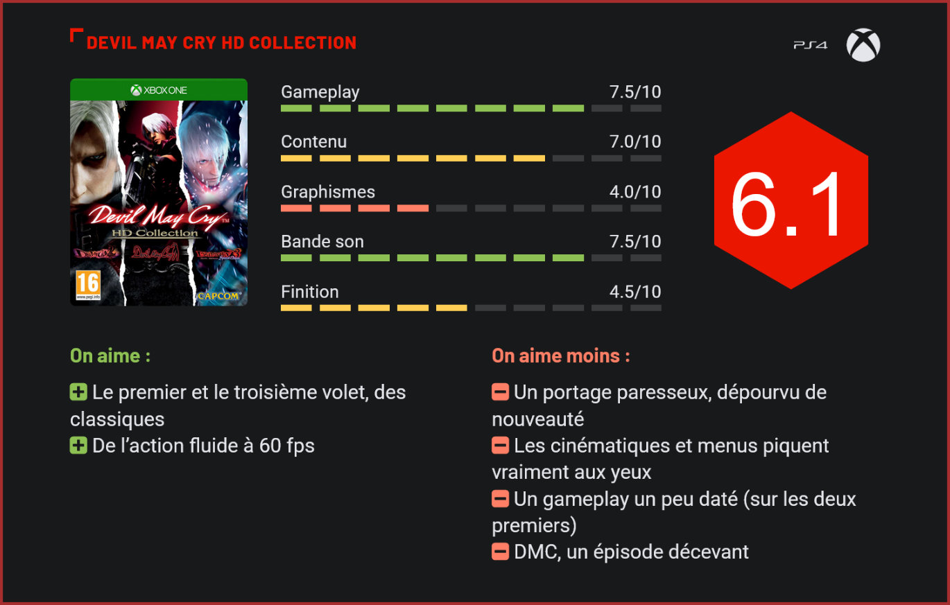 Tout comme il l’avait fait en 2012, Capcom ressort une compilation des trois premières aventures de Dante. Une collection cette fois pensée pour le PC, la Playstation 4 et la Xbox One, avec une finition HD et un affichage 1080p/60 fps. Back to basics. Pour ceux qui ignorent ce qu’est Devil May Cry, un petit récapitulatif s’impose. Il s’agit d’une série de beat’em all entamée en 2001 sur Playstation 2 mettant en scène Dante, un chasseur de démons incroyablement poseur qui gère sa petite affaire en tant que détective privé. Ce fils du légendaire Sparda, un démon qui sauva l’humanité en se retournant contre les siens il y a deux millénaires, est invité par Trish à affronter des hordes de démons et à détruire l’Underworld pour sauver une fois de plus l’humanité. Équipé d’une épée et d’une arme à feu à chaque main, Dante tranche à tout va et traverse les divers titres de la saga (quatre opus principaux et un reboot sorti en 2013) avec une classe et une désinvolture folle. Plus de fluidité en guise de nouveauté A l’image de la compilation sortie en 2012 sur PS3 et Xbox 360, ce sont ici les trois premiers épisodes qui sont proposés au joueur pour une trentaine d’euros. Un montant un chouia excessif, même pour trois classiques du genre, dans la mesure où il s’agit ici presque exactement de la même collection sortie à l’époque. Seule et unique nouveauté : le passage au 1080p/60 fps. Les jeux gagnent ainsi en fluidité et promettent une bonne dose d’action sans saccades sur console current gen. Et c’est tout ! Capcom s’est en effet reposé sur ses lauriers et, outre le fait qu’il n’ait ajouté aucun bonus, il n’a pas non plus corrigé les défauts déjà présents à l’époque. Ainsi, cette HD Collection affiche des menus et des cinématiques en 4:3 identiques à ceux de l’époque, qui font bien pâle figure sur un écran UHD. Attention aux yeux, ça pique ! Les menus sont illisibles, et les cut scenes et sous-titres sont d’époque, c’est-à-dire ultra pixelisés. In game, les textures n’ont pas non plus été retravaillées et restent floues, surtout lorsque l’on passe à des angles de vue plus rapprochés. Toujours de grands classiques du beat’em all Seuls les joueurs voulant (re)découvrir les origines de la saga sur leur console actuelle seront peut-être attiré par cette compilation qui comporte tout de même un mètre-étalon du beat’em all et un excellent titre d’action au gameplay nerveux et varié. Sorti en 2001 sur Playstation 2, le premier Devil May Cry pose les bases de la série tout en étant un petit classique du beat’em all à l’ambiance gothique marquée et aux divers éléments inspirés de l’univers de Resident Evil (le jeu devait être à l’origine le quatrième épisode chronologique de la série). Si le second volet sorti en 2003 est tout à fait dispensable, étant aussi terne et vide qu’un puit sans fond face aux deux autres jeux, le troisième opus est, quant à lui, un pur moment d’action spectaculaire. Son gameplay nerveux et varié (grâce au système des styles) en faisait un excellent beat’em all en 2005 et c’est toujours le cas aujourd’hui. Son gameplay n’a pas pris trop de rides et ses boss spectaculaires donneront du fil à retordre aux plus aguerris. Par contre le système de ciblage et le gameplay des deux premiers jeux ont eux pris du plomb dans l’aile et paraissent aujourd’hui un peu désuet, tout comme les angles de caméra fixes imposés, hérités des premiers Resident Evil. Conclusion Presque rien n’a changé depuis la sortie de cette compilation en 2012. Outre l’apport du 1080p/60fps qui apportent une belle fluidité, ce portage est identique et les cinématiques de l’époque sont toujours en basse résolution. Aucun ajout n’a été effectué et l’on se demande bien pourquoi Capcom a décidé de ressortir cette collection en l’état, sans (presque) rien retoucher. Reste la qualité intrinsèque des jeux (surtout le premier et le troisième volet), qui demeurent des classiques du beat them all.