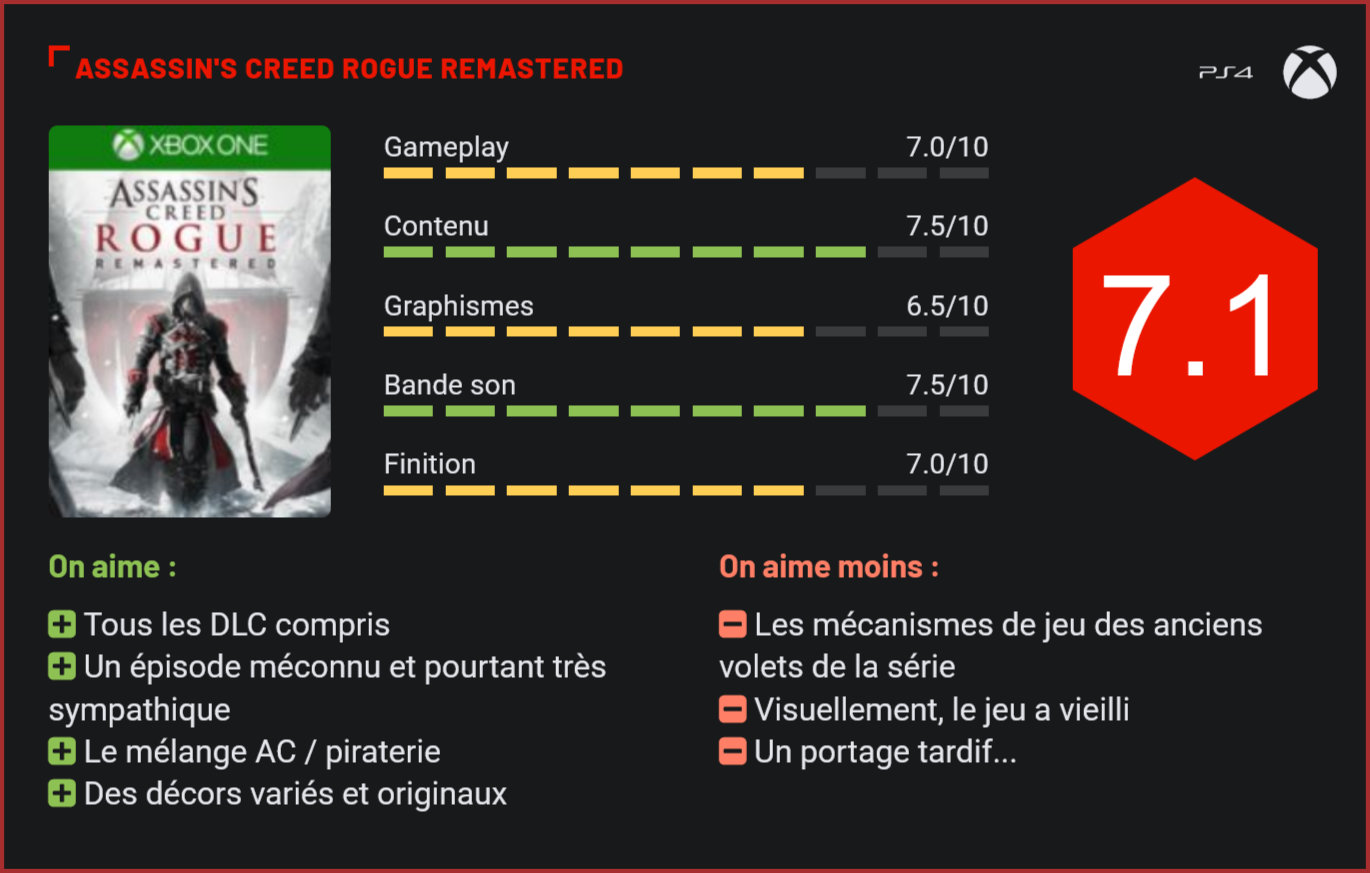 Passé complètement inaperçu au moment de sa sortie, Assassin’s Creed : Rogue a aujourd’hui droit à un remaster sur les consoles de dernière génération. Ce spin-off, méconnu du grand public, avait commis l’erreur de sortir en fin de cycle de vie de la précédente génération de consoles… Après l’excellent Assassin’s Creed Origins, et en attendant le prochain volet de la série, Ubisoft nous livre un remaster du spin-off de la franchise, le fameux Assasin’s Creed Rogue, qui avait commis l’erreur de sortir en fin de cycle de vie de la précédente génération de consoles. Méconnu du grand public pour cette raison, cet épisode avait même été volontairement occulté par les fans de la série, qui avaient préféré se diriger vers l’excellent Assassin’s Creed Black Flag, porté à l’époque sur les consoles “new-gen”. S’il arrive tard, le remaster d’Assassin’s Creed Rogue est toutefois une bonne chose pour les fans, qui étaient nombreux à être passés à côté de ce volet. Car en dépit de son statut de mal-aimé, Rogue n’en reste pas moins un titre très plaisant à parcourir. Tout d’abord, parce que ce volet contraste radicalement avec “Origins” en nous ramenant à une période plus contemporaine, et dans des décors aux antipodes des oasis d’Origins puisque le joueur naviguera dans les eaux glacées de l’Atlantique nord. Ensuite, parce qu’en dépit de son statut de spin-off, Rogue reprend le meilleur des trois précédents volets de la série, en nous plongeant dans des environnements vastes inspirés d’Assassin’s Creed 3, avec un gameplay qui se rapproche lui de celui de Black Flag, le joueur prenant régulièrement les commandes d’un galion pour partir combattre les forces britanniques sur l’océan. Les mécanismes de jeu sont donc bien rôdés et les joueurs qui ont bouclé Black Flag et Assassin’s Creed 3 ne devraient pas être bousculés. Tout au plus regrettera-t-on ces séquences de jeu dans le présent qui n’apportent strictement rien au jeu si ce n’est quelques raccourcis narratifs. Dans la peau de Shay Patrick Cormac, le joueur devra évoluer dans des environnements semi-ouverts, sur la terre ferme, lors de séquences d’infiltration et d’assassinats principalement, mais aussi sur la mer à bord de son galion. Très riche, le gameplay d’Assassin’s Creed Rogue nécessitera une longue période d’apprentissage de la part du joueur, qui devra enregistrer les mécanismes de jeu avant de vraiment prendre son pied. Sur mer, il sera question de combats acharnés, de commerce, de captures de galions adverses et de longs voyages d’une destination à l’autre. La partie navale représente véritablement l’épine dorsale du jeu. Outre le plaisir de naviguer sur une mer houleuse, c’est surtout le charme des affrontements et des abordages qui donnent à Rogue son cachet unique. On regrettera à l’inverse que le scénario du jeu ne soit pas forcément bien ficelé et que le titre reste au demeurant dans la plus grande tradition des précédents volets de la franchise… Autrement dit, si vous avez aimé Black Flag, vous adorerez sans doute Rogue. Si les mécanismes de jeu des anciens volets de la franchise vous repoussent en revanche, inutile de vous lancer dans cet épisode. Car en dehors de son univers graphique radicalement différent des précédents épisodes de la franchise, Rogue n’a que très peu d’arguments à faire valoir auprès des fans de la série. Le jeu est plaisant à parcourir mais n’est au demeurant que le fruit d’un inceste entre AC3 et Black Flag. Pourquoi dès lors nous le resservir aujourd’hui? Probablement parce qu’Origins s’écartait suffisamment des principes de la franchise pour oser nous resservir le remaster d’un épisode passé inaperçu, qui conserve le gameplay des précédents volets. En nous glissant le remaster de Rogue entre deux volets plus classiques, Ubisoft aurait frôlé l’overdose. S’il arrive tard, ce remaster de Rogue a malgré tout bien choisi son moment pour venir toquer à notre porte. On notera par ailleurs qu’en dépit de son âge avancé, Rogue n’a pas si mal vieilli que ça, d’autant plus que l’affichage 4K est de rigueur et que le jeu a subi un léger lifting qui lui va plutôt bien. Autres atouts de cette réédition : un prix doux (30€) et un contenu additionnel présent dans le jeu de base. Deux nouvelles aventures sont au programme, La Quête de l’Armure de Sin Gunn et Le Siège de Fort Sable, et les joueurs qui n’avaient pas craqué pour les DLC à l’époque pourront également profiter d’équipements qui n’avaient pas été intégrés dans le jeu de base. Ubisoft a également glissé un petit clin d’oeil à Origins en permettant aux joueurs de s’équiper de la tenue de Bayek, le personnage principal d’Origins. Conclusion En dépit de son âge avancé, ce portage (tardif) d’Assassin’s Creed Rogue sur les consoles de dernière génération n’en reste pas moins une bonne idée de la part d’Ubisoft, qui nous ressert un épisode méconnu de la franchise qui mêlait brillamment le gameplay de Black Flag et d’Assassin’s Creed 3. Si les mécanismes de jeu ont vieilli et le mélange de piraterie et d’infiltration ne plaira pas à tout le monde, le jeu est proposé à un prix relativement doux, comprend l’intégralité des DLC et a le mérite de nous faire découvrir un univers graphique différent en nous plongeant dans l’Atlantique nord.