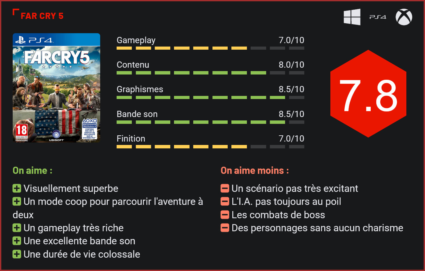 Après avoir donné une direction radicalement différente à sa franchise avec Far Cry Primal, Ubisoft tente à nouveau une nouvelle approche avec le cinquième volet de la franchise, qui abandonne les contrées exotiques pour nous emmener à la découverte du Montana… Après un troisième volet qui avait littéralement redonné vie à la franchise, Ubisoft avait osé s’écarter des sentiers battus pour nous livrer plusieurs spin-off de sa franchise, avec tout d’abord le sympathique Blood Dragon puis l’épisode Primal, qui plongeait le joueur en pleine préhistoire. Avec Far Cry 5, Ubisoft tente une approche différente en se rapprochant des troisième et quatrième volet pour ce qui est du gameplay, tout en nous emmenant dans une destination qu’on a pas forcément l’habitude d’explorer dans un jeu vidéo : le Montana et ses campagnes colorées. Et cette fois, plus narcotrafiquants puisque le joueur devra affronter une secte de fanatiques religieux prêts à tout pour imposer leur culte à la population locale. Dans la peau d’un Marshall fédéral, le joueur devra donc venir remettre de l’ordre chez tout ce beau monde, pas la force des armes. Après une courte séquence d’introduction, qui sera l’occasion de faire connaissance avec le leader de la secte, le bien nommé Joseph Seed et toute sa clique, le joueur découvrira les mécanismes de base du jeu en explorant une petite île aux mains des fanatiques. Proche de Far Cry 4, le gameplay de Far Cry 5 reste relativement exigeant mais offre au joueur une large palette de possibilités. Quelques balles suffisent à mettre le joueur au tapis. C’est la raison pour laquelle avant d’attaquer un camp ennemi, il faut préalablement penser à une stratégie en privilégiant, dans le domaine du possible, l’infiltration au choc frontal. Ce qui fait aujourd’hui encore la richesse de Far Cry, c’est sa capacité à proposer au joueur le choix de l’approche pour chaque mission du jeu. Le joueur peut ainsi choisir de ramper dans les hautes herbes, s’infiltrer dans le dos d’un ennemi, l’étrangler, avant de dégainer ses armes pour massacrer ses ennemis, foncer dans le tas d’entrée de jeu avec un véhicule dérobé plus tôt, les canarder depuis une position dominante, opter au contraire pour le sniping ou mélanger les genres. Certaines missions peuvent ainsi être entièrement bouclées de manière furtive. Et, bonne nouvelle, les points de sauvegarde sont placés de façon très judicieuse, avant chaque assaut. Pas de frustration donc avec le die & retry. Entièrement en monde ouvert, le jeu laisse le choix au joueur de la prochaine mission, avec une progression non-linéaire. Comme dans les précédents opus, les missions secondaires font partie intégrante de l’aventure et il faudra y consacrer une partie importante de son temps pour progresser, dans la mesure où la progression sera grandement facilitée par la capture de lieux stratégiques et le renforcement de la résistance – en lutte contre la secte religieuse. Si l’aventure et les missions sont répétitives par nature – le jeu faisant la part belle aux captures de lieux & courses-poursuites en véhicule -, Far Cry 5 parvient à garder l’attention du joueur en misant sur la richesse de son gameplay, la variété des décors et surtout les nombreux éléments imprévisibles qui se produisent en cours de jeu. Vivant, l’univers de Far Cry 5 regorge d’animaux sauvages qui n’hésiteront pas à interférer avec vos missions. Il n’est ainsi pas rare de voir un ours se joindre à une gunfight, massacrant sur son passage plusieurs membres de la secte, avant de vous courser sur plusieurs dizaines de mètres. Loups, pumas, ours, cerfs et marmottes font ici partie intégrante du décor. Notons d’ailleurs qu’il sera possible de partir à la chasse pour récupérer leur viande et la vendre aux acheteurs locaux… Plus intéressant encore, il sera possible de se faire épauler par un allié durant les missions, voire de participer à de véritables assauts avec une dizaine d’unités. Le jeu parvient ainsi à ajouter une dose de stratégie dans les combats de groupe. Ajoutons à l’équation la présence d’un compagnon canin qui vous sera très utile pour récupérer les armes sur le terrain, et vous comprendrez que Far Cry 5 a décidément beaucoup de choses à vous offrir. Alors certes, les mécanismes n’ont pratiquement pas évolués depuis deux épisodes déjà, et le scénario du jeu n’est pas forcément des plus prenants. Les personnages principaux rencontrés n’ont aucun charisme et les quêtes annexes sont maladroitement scénarisées. Mais en dépit de ses petits défauts, Far Cry 5 reste un titre très agréable à parcourir ne serait-ce que pour l’incroyable liberté d’action qu’il octroie au joueur. On notera par ailleurs qu’Ubisoft a fait le juste choix de supprimer plusieurs mécanismes de jeu qui n’étaient pas forcément appréciés des joueurs. Exit ainsi la chasse aux tours radio – qui était devenue quasi une obsession chez Ubisoft, depuis Assassin’s Creed – et le craft, indispensable à la progression dans les précédents épisodes. Etonnamment, Ubisoft n’a en revanche toujours pas corrigé le problème des bugs – très présents dans cet opus encore une fois – et de l’I.A., qui globalement est plutôt réactive mais réagit parfois de façon totalement chaotique à vos actions. Les combats de boss eux aussi n’ont pas évolué et restent l’un des talons d’Achille de la franchise. Du côté des nouveautés introduites, on appréciera principalement la présence d’un mode coop qui permet de parcourir le Montana à deux pour délivrer les locaux de la secte. Amusant, à défaut d’être indispensable, le jeu se prêtant très bien à la progression en solo. Dans le même ordre d’esprit, on appréciera la possibilité de pouvoir bouter le feu aux décors pour intégrer cet élémen