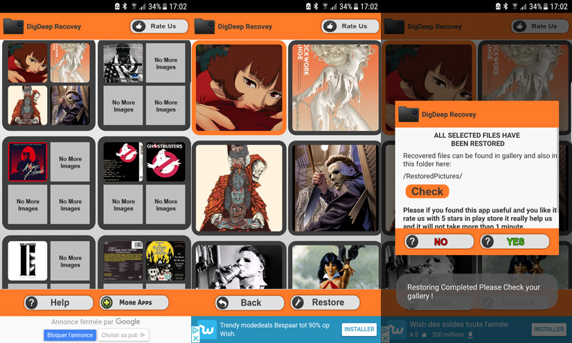 Vous avez effacé par erreur des photos sur votre smartphone Android et vous souhaitez les récupérer? Pas de panique, Geeko vous donne quelques astuces pour récupérer vos précieux clichés pas si perdus que cela… Si vous agissez rapidement, vos chances de récupérer vos photos seront décuplées, alors n’attendez pas trop longtemps avant de lancer l’un des processus suivants ! Utiliser un logiciel Plusieurs logiciels conçus pour récupérer vos photos supprimées existent. Parmi les utilitaires gratuits Recuva, et 7-Data recovery sont parmi les plus efficaces et fonctionnent de façon assez similaire. Après avoir téléchargé et installé le logiciel en question, connectez votre smartphone à votre ordinateur et lancez le programme. Sélectionnez votre appareil dans la liste et effectuez le scan. Une fois celui-ci terminé, sélectionnez le fichier et cliquez sur “Recover”. Vous pouvez également tester EaseUS recovery (sa version d’essai est gratuite). Cet utilitaire est très bien conçu et vous explique pas à pas les manipulations à effectuer. Vous devrez néanmoins au préalable activer les options de développement de votre smartphone (voir article dédié). Utiliser une application Il y a de nombreuses applications dans le Play Store qui vous aideront à retrouver facilement vos photos. DigDeep ou, en français, “Récupérer images supprimées” (on ne peut pas faire plus explicite!) est l’une d’elles. Une fois l’app téléchargée, il suffit de la lancer pour qu’un scan se lance. Des dossiers avec vos photos apparaissent ensuite. Il suffit alors d’entrer dans l’un d’eux, de sélectionner les images à récupérer, d’appuyer sur “Restore” et ces dernières réapparaîtront dans vos photos récentes. Ultra simple! Tout comme DigDeep, DiskDigger est aussi disponible en version gratuite ou premium (payante). En le lançant, choisissez “Basic photo scan” (l’autre option demande un rootage), l’application recherche alors directement les photos et les affiche au fur et à mesure. Après quelques minutes de scan, vous pourrez simplement appuyer sur la ou les images à restaurer et choisir où les récupérer (par mail, sur Google Drive, dans un dossier spécifique sur votre smartphone ou encore sur un serveur FTP). Comme spécifié plus haut, ne vous attendez pas à retrouver des photos effacées depuis plusieurs jours ou semaines. Plus vous agirez vite, mieux ce sera ! Pensez à sauvegarder sur Google Photos Si vous utilisez Google Photos, vous pouvez dans les paramètres en haut à gauche sélectionner un compte Gmail de sauvegarde. Une fois cela fait, vous pourrez simplement vous rendre dans la corbeille pour restaurer les photos souhaitées (d’abord appuyer sur “Restaurer” puis sélectionner les images. Et puisqu’il vaut mieux prévenir que guérir, n’hésitez pas à l’avenir à sauver vos photos et images sur le cloud ou un service type Dropbox. Ça vous sauvera la mise la prochaine fois !