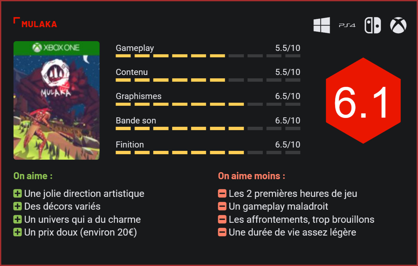 Développé par un petit studio indépendant, Mulaka est un jeu ambitieux qui nous propose de découvrir la culture indigène Tarahumara à travers un jeu d’aventure qui s’inspire ouvertement de The Legend of Zelda. Sorti de nulle part, Mulaka est un jeu d’aventure aussi ambitieux qu’original qui propose surtout de partir à la découverte d’une culture méconnue en Occident. Les développeurs de Lienzo ont en effet choisi de porter en jeu vidéo les mythes et légendes de la culture indigène Tarahumara, originaire du Nord du Mexique. Entièrement en cel-shading, le jeu du petit studio mexicain propose une expérience qui s’inspire ouvertement de The Legend of Zelda, tout en plongeant le joueur dans un univers qui sort des sentiers battus. Si l’idée était très intéressante sur le papier, la réalisation déçoit toutefois. Pas sur le plan esthétique mais davantage au niveau de la progression dans le jeu. Sans doute trop ambitieux pour un petit studio de développement, Mulaka souffre d’un rythme de jeu saccadé et d’une narration mal pensée. Les deux premières heures de jeu sont un supplice. Passé l’introduction, le constat a toutefois tendance à s’améliorer… S’il ne s’agit pas d’un open-world à proprement parler, Mulaka propose toutefois des zones de jeu assez larges à visiter. Découpé en niveaux, le jeu propose une progression relativement linéaire, mêlant séquences de combat contre diverses créatures et boss, d’exploration et de plates-formes. Peu précise, la prise en main fait réellement défaut et handicape sérieusement le joueur, notamment durant les phases de plates-formes où la moindre erreur peut conduire à la mort. Dans le même ordre d’idée, les affrontements ont tendance à être beaucoup trop brouillons. Les décors variés (et superbes) du jeu, son atmosphère unique, son univers si particulier, les créatures rencontrées durant l’aventure pousseront toutefois le joueur à poursuivre l’aventure et à braver ainsi les défauts du titre. Après quelques heures de jeu, le joueur débloquera également de nouvelles capacités pour son héros. Il lui sera notamment possible de se transformer en oiseau de proie et de s’envoler. Une originalité qui permet à Mulaka de se démarquer des autres Zelda-likes. Là aussi, on notera toutefois que le gameplay demeure relativement limité puisque pour prendre de la hauteur, le joueur devra impérativement passer par des points de passage prédéfinis – en l’occurrence des courants d’air. Assez paradoxalement, s’il est possible de voler, notre personnage ne sait pas nager. Chaque chute dans l’eau donnera donc lieu à une mort instantanée… Visuellement superbe, Mulaka tire sa richesse de son univers, parfaitement représente à travers des graphismes en cel-shading. Certes, la technologie sert ici de cache-misère (le jeu tournant aussi bien sur Xbox que PS4 et Switch), mais le rendu est étonnamment bon et la direction artistique brillante. Les décors sont variés et offrent des points de vue parfois à couper le souffle, les animations sont bonnes et le design des créatures est l’un des gros plus de ce titre, qui explore brillamment la mythologie locale. Côté bande son, le joueur est également joliment servi par des morceaux en accord avec l’univers du jeu, des bruitages réussis mais pas de traduction en français. Dommage pour les anglophobes. Proposé à un prix somme toute très correct – environ 20€ -, Mulaka n’offre toutefois qu’une durée de vie relativement courte. Il ne vous faudra pas plus de quelques heures pour boucler les huit niveaux du jeu. Conclusion Joliment réalisé, Mulaka est un Zelda-like à l’univers riche, qui propose au joueur de découvrir une culture méconnue de l’Amérique centrale. Trop ambitieux pour le petit studio mexicain, le jeu souffre de gros défauts de prise en main, d’une durée de vie assez légère et d’une progression trop linéaire. Pour un peu moins de 20€, Mulaka n’en reste pas moins un très bon divertissement qui séduira avant tout les passionnés d’Histoire et de culture.
