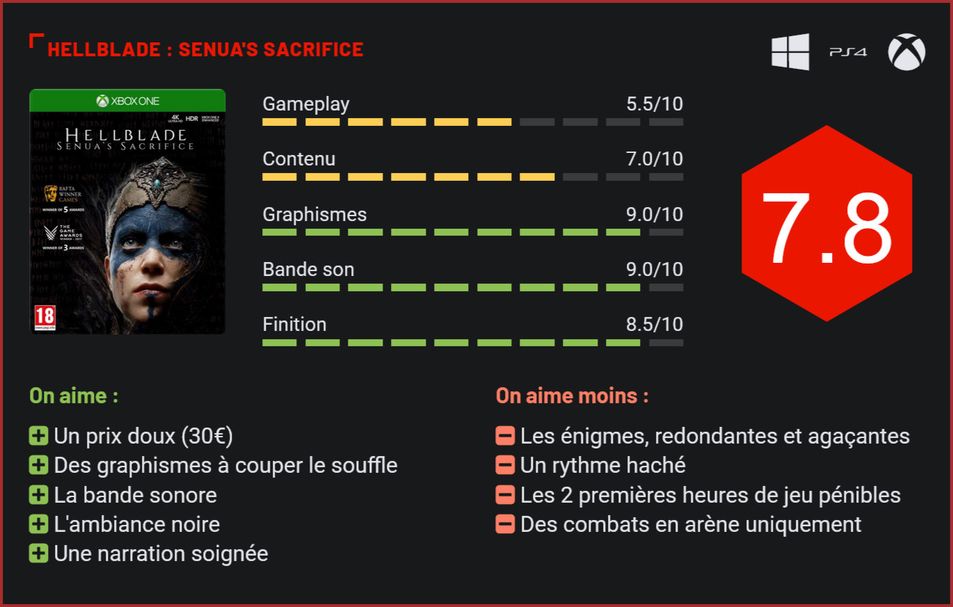 Enorme surprise au moment de sa sortie sur PS4, Hellblade Senua’s Sacrifice débarque près d’un an plus tard sur la console de Microsoft dans une édition intégrale qui tire parfaitement parti des capacités de la Xbox One X… Très grosse surprise l’an dernier, Hellblade : Senua’s Sacrifice était à la fois une claque graphique qui montrait tout le potentiel de la PS4 Pro et un incroyable jeu indé, qui mélangeait brillamment les genres tout en faisant découvrir la mythologie nordique aux joueurs. Alors qu’on pensait le titre exclusif à la PS4 (et au PC), Ninja Theory a finalement annoncé en début d’année sa sortie sur Xbox One. Une bonne surprise pour les gamers qui n’avaient pas eu la chance de mettre les mains sur cet excellent jeu d’aventure… Car oui, si le gameplay de Hellblade ne séduira pas tous les joueurs et son format narratif le destine à une certaine élite, il s’agit sans aucun doute de l’un des meilleurs titres indés que nous ayons pu approcher ces dernières années. Tout d’abord, parce qu’il se destine à un public mature, avec ses séquences parfois très dures à avaler, psychologiquement, sa violence extrême et la poésie de ses dialogues. Difficile toutefois de plonger d’entrée dans son scénario, à la fois si simple et si complexe. Si simple parce qu’au final il ne décrit que le voyage d’une jeune femme dans le monde d’Hellheim, l’enfer viking, à la recherche de la déesse de la mort, dans une quête qui servira à sauver uniquement son cher et tendre, massacré par les vikings. Complexe car le jeu est davantage une allégorie qu’une histoire – l’aventure prend en grande partie place dans la tête de la jeune Senua, qui a souffert des affres de la guerre et souffre indirectement d’un dédoublement de la personnalité. Symbolique, le voyage initiatique de la jeune Senua n’en reste pas moins plaisant et singulièrement différent de ce qu’on a l’habitude de voir dans les jeux à l’heure actuelle… Difficile d’ailleurs également de définir Hellblade, un jeu qui mélange différents genres de façon brillante. Certes, le début de l’aventure frustrera plus d’un joueur. Les deux premières heures de jeu sont mal rythmées, l’intérêt est difficile à saisir et on a étrangement la sensation de se retrouver dans un puzzle-game, mais cette première impression disparaîtra aussitôt les portes d’Hellheim franchies. Le jeu prend alors une toute allure, mêlant brillamment exploration dans des décors absolument superbes, combats très techniques en arène, affrontements de boss absolument dantesques, énigmes et séquences de courses-poursuites. La marge de progression est également très importante. Les premiers affrontements sembleront ainsi d’une facilité déconcertante. Deux coups pour frapper, un pour parer, un autre pour faire une roulade… et c’est à peu près tout. Le gameplay d’Hellblade est rudimentaire pour un hack & slash. Dans la pratique toutefois, le titre est beaucoup plus complexe que d’apparence. Le timing joue en effet un rôle majeur dans Hellblade. Lorsque le joueur affrontera 3 ou 4 ennemis à la fois, il devra veiller à suivre du regard leurs déplacements, établir une stratégie pour écarter l’un d’eux du groupe et l’affronter pour ensuite passer au suivant, et veiller constamment à éviter de lever sa garde au mauvais moment. Hellblade est un titre exigeant. D’ailleurs, les développeurs ont été vicieux au moins d’ajouter une caractéristique inédite à leur jeu. Lorsque le joueur meurt, il a le droit de recommencer la séquence de jeu, mais son bras se putréfiera progressivement. A force de mourir, le bras de Senua se transformera pour ne plus ressembler qu’à un morceau de chaire en putréfaction. Si l’intégralité du bras est putréfié, la partie s’effacera et le joueur devra tout recommencer depuis le début… En mettant les affrontements en facile et en ne fonçant pas trop tête baissée dans les combats, il restera toutefois possible de voir le bout de l’aventure même pour les joueurs qui ne sont pas habitués à ce style de jeu. Si les affrontements sont suffisamment nerveux pour tenir le joueur scotché à son pad, certaines séquences de jeu viennent maladroitement déséquilibrer la progression. Il s’agit en l’occurrence de ces séquences où le joueur devra rechercher des “runes” dans le décor – concrètement, il s’agira de rechercher des formes en superposant plusieurs éléments du décor depuis plusieurs angles de vues, dans des environnements de taille relativement modeste. Des séquences de jeu qui viennent fortement ralentir la progression et ne présentent pratiquement aucun intérêt si ce n’est de rallonger artificiellement la durée de vie du jeu. Hors, au début de l’aventure, elles représenteront à elles seules environ 70% du gameplay avec l’exploration… La bonne nouvelle, c’est que dès le cap des 2 heures de jeu passé, les choses s’accélèrent, les combats s’intensifient et surtout les affrontements avec les boss sont de plus en plus costauds. Dantesques, les affrontements contre les boss représentent des passages particulièrement spectaculaires et jouissifs qui justifient presqu’à eux seuls l’achat d’Hellblade. Costaud, le jeu propose une durée de vie de 8 à 12 heures, selon la difficulté choisie et votre capacité à progresser rapidement. Poignant, le récit en laissera plus d’un admiratif. Les autres, insensibles aux charmes de l’histoire, se tourneront vers les affrontements nerveux du jeu, qui promettent des heures de plaisir intense. Alors certes, on pourra reprocher à Hellblade ses énigmes répétitives, son rythme haché et le fait que les affrontements se déroulent uniquement en arène. Mais globalement, pour un titre vendu seulement 30€, Hellblade est un jeu d’une rare qualité, qui parvient à proposer une expérience de jeu radicaleme