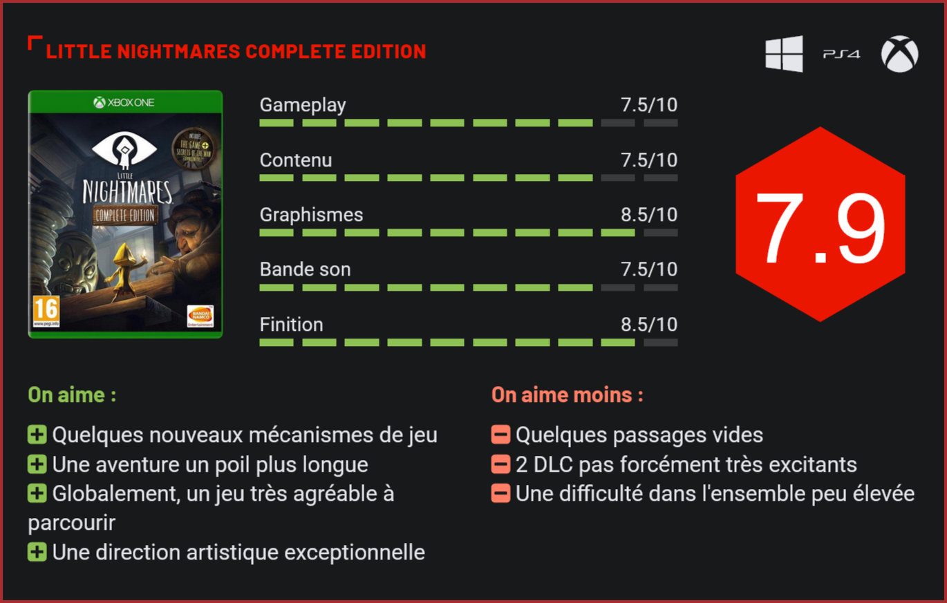 Pas passez inaperçu au moment de sa sortie, le séduisant Little Nightmares s’offre une édition intégrale qui rassemble l’intégralité des DLC sortis après le jeu. L’occasion de se replonger dans son univers atypique… Rappelez-vous, en avril 2017, Namco-Bandai sortait un petit jeu indé baptisé Little Nightmares. Enorme succès en dépit de la maigre communication autour de sa sortie, le jeu avait eu droit à plusieurs DLC – désormais rassemblés dans une édition définitive baptisée la “Complete Edition”. Au programme de cette belle aventure, l’intégralité du contenu du jeu d’origine et pas moins de 3 DLC. Décevante, la première extension baptisée “Secret of the Maws” se démarquait du jeu d’origine en proposant au joueur d’incarner cette fois un petit garçon dans l’univers sombre et froid de Little Nightmares. Courte, pas très excitante et n’introduisant aucune nouveauté majeure, l’extension Secret of the Maws n’était pas franchement ce qu’on pouvait appeler une bonne introduction au contenu additionnel. D’une part, parce qu’elle se contentait de recopier le contenu du jeu originel sans introduire aucune nouveauté, d’autre part parce que l’aventure était horriblement courte – 30 mins top chrono – et aucune explication n’était amenée pour justifier la présence du jeune garçon dans le DLC. Pour autant, la (courte) balade n’en demeurait pas moins sympathique. Namco-Bandai avait alors tiré des conclusions de son échec et revu sa copie pour le prochain DLC, baptisé The Hideaway. De nouveau dans la peau d’un jeune garçon, le jeu propose une aventure cette fois totalement inédite dans des décors eux aussi inédits, et avec cette fois quelques liens avec le jeu originel. Certes, le scénario reste très pauvre, mais le DLC a cette fois le mérite d’ajouter un peu plus de profondeur à l’univers du jeu. La grande nouveauté du second DLC, c’est bien sûr la présence d’un nouveau mécanisme de jeu. Les Mômes, ces étranges créatures croisées dès le premier niveau du jeu, interagissent cette fois avec le joueur, lui permettant de progresser à travers les niveaux. Le DLC n’a certes rien de révolutionnaire, mais il propose une expérience de jeu plus riche que son ancêtre et surtout deux fois plus longue, sa durée de vie avoisinant l’heure de jeu. Plus séduisant encore, “La résidence”, le troisième et dernier DLC du jeu reprend le scénario exactement là où nous l’avions lâché avec The Hideaway. Beaucou plus angoissant que ses prédécesseurs, “La résidence” apporte quelques précisions sur le plan narratif et offre une aventure beaucoup plus riche en sensations fortes, avec des passages tendus. Outre la dame en noir, qui représente une menace permanente dans ce DLC, le joueur devra y affronter des ombres à l’aide de sa lampe torche. Finalement, difficile d’être pleinement satisfait par cette édition complète du jeu. L’opus originel est toujours aussi bon mais la qualité des 3 DLC qui sont livrés avec est variable, et si le scénario se tient finalement plutôt bien, l’expérience de jeu qui nous est ici proposée n’est finalement que la continuité de ce qu’on avait déjà débuté. En d’autres termes, si vous n’aviez pas craqué pour le jeu d’origine mais aviez été séduit par ses mécanismes de jeu et son esthétique, foncez. Dans le cas contraire, il est fort peu probable que cette édition ultime vous séduira davantage que le jeu d’origine… Conclusion Si vous étiez passé à côté du sympathique Little Nightmares au moment de sa sortie, cette “Complete Edition” vous permettra sans doute de rattraper enfin cette erreur en vous plongeant dans l’univers fantastique de ce jeu d’aventure et de plates-formes aussi sombre qu’inquiétant. Certes, les DLC n’apportent aucune révolution au niveau du gameplay, mais ils permettent de prolonger de quelques heures le plaisir et d’explorer de nouveaux environnements.