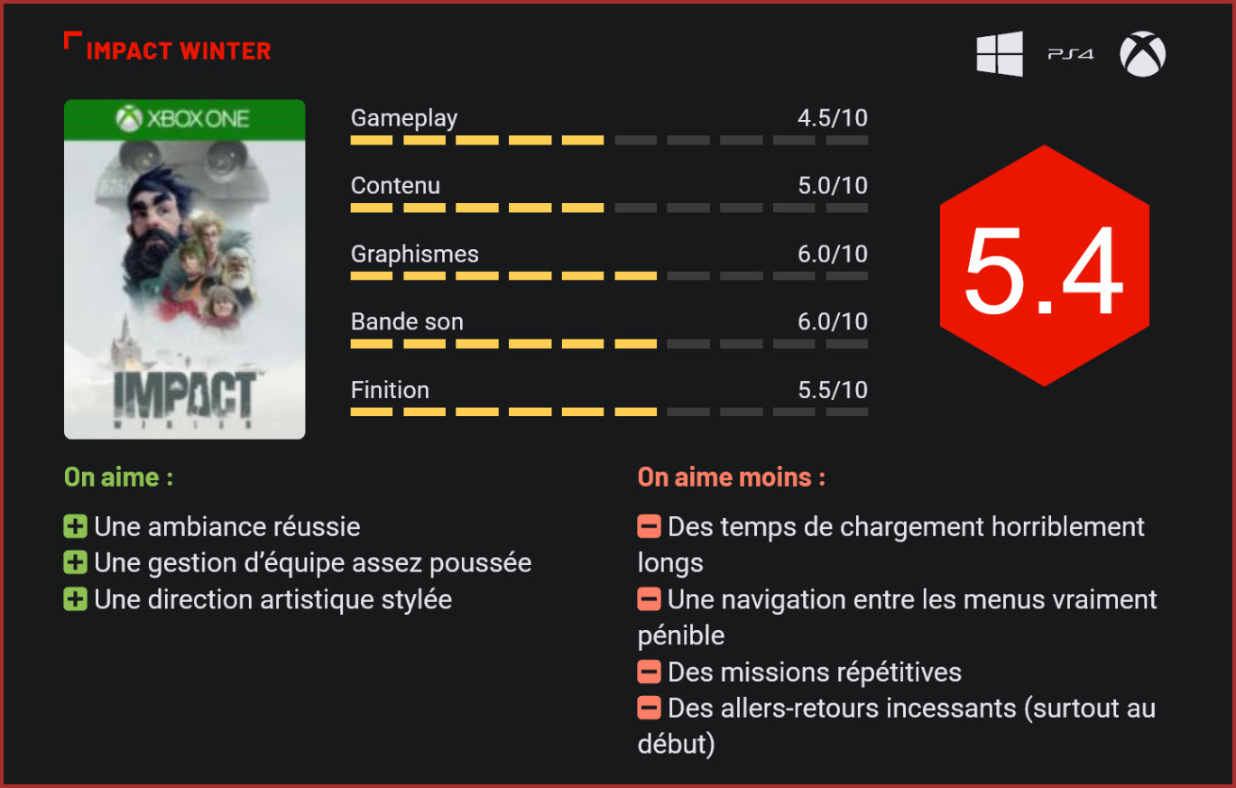 Sorti il y a presque un an sur PC, ce jeu indépendant signé Mojo Bones et édité par Bandai Namco tente de nouveau sa chance sur PS4 et Xbox One. Au programme : survie, gestion de groupe et apocalypse glaciaire. La chute d’un astéroïde a dévasté le monde, désormais plongé dans un climat glacial. Les infrastructures sont enfouies sous de gigantesques couches de neige et le blizzard menace. Dans la peau de Jacob Solomon, le chef d’un petit groupe de survivants ayant choisi les ruines d’une église en guise d’abri, vous allez devoir veiller sur vos proches et les maintenir en vie jusqu’à l’arrivée des secours prévue dans exactement 30 jours… Les survivants Dès lors, votre objectif sera de faire diminuer ce chrono de sauvetage en montant en expérience, ou, autrement dit, en apprenant comment survivre et en faisant évoluer vos conditions de (sur)vie. Les missions qui vous seront demandées consistent principalement à partir à la recherche de diverses ressources dissimulées dans les bâtiments presque entièrement recouverts de neige, les véhicules abandonnés et autres endroits qui entourent le camp. Votre survie et celle de votre groupe, composé de 4 autres personnes, est donc entre vos mains. Heureusement, les autres membres vous épaulent dans cette rude tâche grâce à leurs caractéristiques. Le policier à la retraite vous donnera de bons conseils pour survivre à l’extérieur (campement, chasse, etc.), la mécano pourra améliorer les équipements présents dans l’église (créer une chaudière, par exemple), une dame plus âgée se montrera indispensable pour soigner les blessures et faire la cuisine et l’informaticien du groupe se chargera d’améliorer Ako-Light. Ce dernier est un robot qui vous accompagne lors de vos expéditions. Il est équipé d’une source de lumière, d’un radar, d’une foreuse et d’autres fonctionnalités pratiques. C’est également lui qui émet le signal de détresse salvateur. Plus vous accomplirez de missions, plus vous gagnerez de l’expérience, et plus Ako-Light se perfectionnera. Tous ces gains font également diminuer le fameux chrono de sauvetage. Un jeu très rationné Le temps est donc au cœur du titre, mais il faudra également veiller à maintenir le bon équilibre entre les différentes jauges des personnages. Chacun (dont votre avatar) possède six besoins à satisfaire tout au long de l’aventure : santé, énergie, faim, soif, température et moral. Négligez la plupart d’entre eux et c’est la mort assurée. Il faut donc constamment surveiller ces jauges, alimenter le feu de camp et rationner les vivres pour que chacun ait de quoi tenir. Sur le fond c’est intéressant mais dans les faits, c’est terriblement frustrant. Il faut tenter d’assigner les bonnes rations et les bons rôles à chacun pour éviter de devoir revenir sur ses pas pour sauver une situation. Les distances entre l’abri et les lieux à fouiller sont parfois énormes, et vu que vous vous déplacez lentement dans la neige (pas de déplacement rapide), vous ne pourrez pas rentrer au bercail rapidement. Patience est donc de mise… A cela s’ajoute des rôles (qui se débloquent au fil de l’aventure) à assigner aux personnages, ce qui leur permet d’effectuer une action qui s’accompagne d’un bonus et d’un malus. « Sommeil lourd » augmente ainsi le moral mais l’énergie remonte moins vite, « Travail de précision » élimine les blessure lors du bricolage mais en augmente son temps, « Cuisine » procure les mêmes vertus aux aliments crus et cuits mais fait se consumer le feu plus rapidement, etc. Histoire d’allers et retours Il y a donc beaucoup de choses à gérer et surveiller dans Impact Winter (on peut également ajouter l’invasion de pillards ou la collecte d’objets pour le compte de nomades). Tout cela passe par des menus et sous-menus sous forme d’onglets malheureusement peu ergonomiques. Ceux-ci manquent de clarté et sont réellement pénibles à gérer (l’attribution des boutons pour y naviguer étant très mal pensée), ce qui est un comble pour un jeu de gestion/survie ! Tant que l’on est dans les points qui fâchent, signalons également la lassitude qui survient assez rapidement lors des expéditions. Non seulement, les missions vous demandent presque à chaque fois d’aller trouver du matériel et des vivres, mais en plus, l’inventaire, limité en début de partie, vous impose de faire d’innombrables allers-retours entre l’église et les différents lieux à explorer. Les choses deviennent un peu plus « agréables » par la suite au fil des améliorations, mais sur le fond, rien ne change vraiment. Dommage. Cette rigidité des menus et cette trop grande répétitivité dans les missions finissent par lasser le joueur qui se retrouve à toujours effectuer les mêmes actions. Cela, en plus de la présence de nombreux temps de chargement horriblement longs, casse franchement l’aspect survie et l’atmosphère de désespoir qu’Impact Winter parvient pourtant à instaurer par moments. Sa direction artistique est en effet assez soignée (jolis effets de lumière) et sa bande-son, qui n’est pas sans rappeler certains accords du film The Thing de John Carpenter, participent à cette réussite atmosphérique. Conclusion Impact Winter avait dans les grandes lignes le potentiel pour être un agréable jeu de survie mais sa trop grande répétitivité et son manque d’ergonomie au sein des menus rendent l’aventure un peu rébarbative. C’est vraiment dommage car le titre de Mojo Bones comporte des aspects assez poussés et intéressants quant à la gestion d’équipe et une véritable atmosphère, ponctuellement prenante.