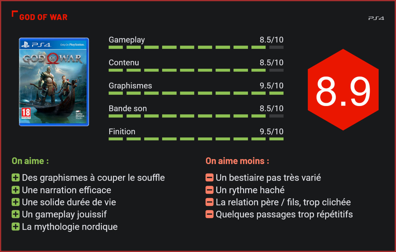 Attendu au tournant, le nouveau God of War ne déçoit pas. Mais est-il vraiment aussi bon que la presse le prétend? En développement depuis des années, ce véritable reboot de la franchise – qui ne se nomme d’ailleurs pas “God of War 4” – s’annonçait comme l’un des plus gros blockbusters de cette année, mais également comme une belle exclusivité pour le catalogue de la PS4. Tirant parfaitement parti des capacités de la PS4 Pro, le jeu du studio Santa Monica se veut avant tout une joli démonstration technique pour la machine de Sony, destinée à faire écouler par palettes entières le modèle “Pro de la machine”. Et, nouvelle génération de console oblige, Sony n’a pas hésité à repartir d’une feuille blanche pour cet épisode, dont l’action se déroule huit ans plus tard, sur les terres de Midgard. Exit la Grèce antique donc et place à un univers qui rapproche davantage God of War de l’excellent Hellblade : Senua’s Revenge. Plus posé, le scénario du jeu se rapproche ici de celui-ci d’un gros blockbuster hollywoodien. Dès le début de l’aventure, le cadre est posé : Kratos vient de perdre sa chère et tendre, et lors d’une partie de chasse avec son fils, il se fait attaquer par un groupe de créatures abominables, issues des contes & légendes vikings. Le décor est posé et très vite, le joueur se laisse enchanter par le cadre merveilleux de cet épisode qui promet un beau voyage dans les contrées enneigées. L’originalité de cet opus vient du fait que Kratos n’est pas seul cette fois puisqu’il est accompagné de son fils, qu’il formera tout au long de son périple. Si le concept est très intéressant sur le papier, et permet l’introduction de plusieurs nouveaux mécanismes de jeu – Kratos pouvant notamment demander à son fils d’attirer l’attention d’un ennemi en décochant plusieurs flèches dans sa direction, pour le prendre ensuite à revers -, on regrettera toutefois que la relation père-fils qui est dépeinte dans le jeu reste très cliché. Pour autant, God of War reste un voyage narratif très agréable à suivre, notamment de par sa mise en scène, pensée sous la forme d’un très long plan-séquence. Forcément, tout n’est parfait, et on regrettera notamment quelques problèmes de rythme avec des passages trop soutenus et d’autres au contraire qui décrocheront quelques bâillements chez le joueur. La créativité des développeurs n’en reste pas moins impressionnante et témoigne d’un réel rapprochement entre le septième art et le jeu vidéo. Car plus que jamais, God of War sur PS4 se rapproche d’un bon gros blockbuster américain. Les développeurs ont d’ailleurs procédé à de nombreux changements au niveau du gameplay au cours des cinq années de développement qui ont été données à ce nouvel épisode. La caméra passe ainsi à la troisième personne, offrant au joueur une meilleure immersion dans les combats mais également plus de précision dans les actions. S’il reste beaucoup moins technique qu’un beat them all traditionnel, God of War n’en reste pas moins un excellent divertissement et surprendra par ailleurs les joueurs de par l’impressionnante montée en puissance de Kratos, qui découvrira au fil de l’aventure de nouveaux pouvoirs et armes, toujours plus puissants. Car oui, God of War est un titre plus technique qu’il n’y paraît au premier regard. Pour vaincre ses adversaires, et les titanesques boss, le joueur devra user de toutes les subtilités du gameplay, apprendre à utiliser le talent de distraction de son fils, et enchainer les combos efficacement. Là où les développeurs marquent des points, c’est justement dans le fait que God of War n’enchaine pas les arènes de combats à un rythme effréné. Le jeu prend le temps de se poser, entre deux affrontements, en surprenant le joueur avec quelques énigmes – qui restent très faciles à résoudre -, des objets à récupérer, des quêtes annexes et des décors plus vastes à explorer. Les combats de boss représentent bien sûr les moments les plus intenses du jeu. Mais ils ne sont finalement qu’une petite partie de ce que God of War a à proposer aux joueurs. Car oui, le périple s’annonce long, très long même pour un beat them all / jeu d’aventure puisqu’il faudra plus de 20 heures au joueur lambda pour finir God of War en ligne droite. Comptez beaucoup plus si vous êtes du genre à explorer le moindre recoin et à réaliser toutes les quêtes annexes. On regrettera toutefois que si le titre reste bien nerveux, le bestiaire ne soit finalement pas très varié par rapport aux anciens opus, et le design des créatures pas toujours très inspiré. Un peu plus de diversité et d’originalité n’aurait pas fait de mal au jeu. La mythologie nordique n’en reste pas moins très bien exploitée. Autre petit défaut du titre, commun à tous les titres appartenant au même genre : une certaine répétitivité ne tarde pas à pointer le bout de son nez malgré la créativité des développeurs. Ceci étant dit, les affrontements de boss ajoutent le piquant nécessaire pour relancer l’intérêt du joueur. Toutefois, ne nous voilons pas la face. Sans ses graphismes à couper le souffle, sa direction artistique et sa bande sonore très riche, God of War n’aurait probablement pas fait le même effet. Car oui, il s’agit là d’une très grosse claque graphique qui exploite pleinement le potentiel de la PS4 Pro avec ses effets visuels superbes et ses décors grandioses – et tourne d’ailleurs très bien aussi sur PS4 -. Et, à plus d’un titre d’ailleurs, le jeu se laisse agréablement déguster pour ce qu’il est : un magnifique défouloir, aux visuels somptueux. Difficile d’y voir le jeu de l’année, tant au final God of War n’introduit rien de vraiment neuf, mais à plus d’un titre, il s’agit là d’un incontournable sur la console de Sony. Conclusion S’il souff