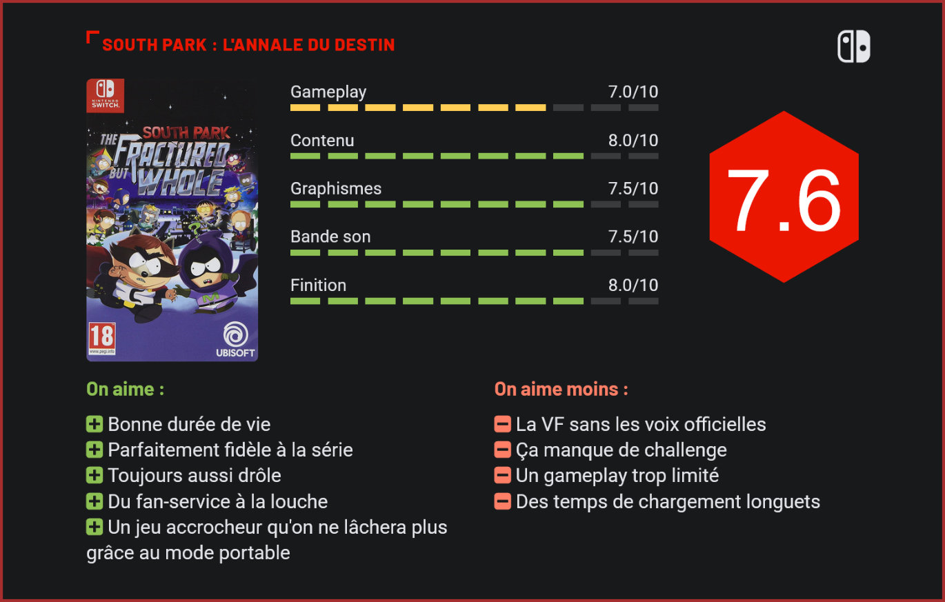 Suite directe du Bâton de la Vérité, L’Annale du Destin débarque sur Switch après être sorti en octobre dernier sur PC, PS4 et Xbox One. Rien ou presque ne bouge, et le titre reste toujours avant tout destiné aux fans de la série et aux amateurs d’humour irrévérencieux. Amis du bon goût et de la bienséance, vous pouvez donc une fois de plus passer votre chemin. South Park : L’Annale du Destin n’apporte pas de grand bouleversement par rapport au Bâton de la Vérité, que ce soit sur le fond ou sur la forme (voir notre teste réalisé à l’époque). On a toujours cette agréable sensation de participer activement à un long épisode de la série (15 à 20h de jeu) tant la réalisation et le ton restent fidèles aux idées complétement barrées des créateurs Trey Parker et Matt Stone. Les gamins passent ici presque sans transition de l’univers du Seigneur des anneaux à celui des super-héros, toujours sous l’influence de Cartman qui veut, dans le costume du Coon, retrouver un chat perdu et éradiquer le crime des rues de South Park. L’occasion parfaite pour pasticher à loisir les productions Marvel et DC ! Côté gameplay, L’Annale du Destin est un peu plus riche en contenu avec des affrontements davantage tactiques qui poussent le joueur à exploiter une toute nouvelle grille de déplacement sur le champ de bataille. La création d’équipes complémentaires pour vaincre ses adversaires est également de mise. Même s’ils sont très amusants, les combats restent toutefois assez répétitifs et pas suffisamment techniques pour accrocher les mordus de jeux de rôle. Souvent trop facile, le jeu n’est finalement souvent qu’un prétexte à une succession de gags destinés à faire éclater de rire les fans de la série…et cela fonctionne à merveille ! Ces derniers ont une fois de plus de quoi se rassasier en blagues de mauvais goût et en moments épiques grotesques. La liberté de ton de South Park demeure inaltérable et cela apporte un peu de « fraicheur » au sein de l’industrie vidéoludique. Il est donc d’autant plus satisfaisant de voir débouler pareil titre sur une console de Nintendo, habituellement habitué aux titres mignons et destinés à toute la famille. Heureusement les choses changent avec le succès de la Switch et les jeux aux tons plus adultes sont désormais nombreux sur celle-ci. Pourquoi donc changer une formule qui marche ? South Park : L’Annale du Destin est donc quasi identique sur Switch que sur les versions PC, PS4 et Xbox One sorties en octobre 2017. Le matériau d’origine présentant des graphismes simples et une animation épurée, le rendu visuel est pour ainsi dire identique. On remarquera simplement une image un peu plus floue et étirée en mode téléviseur qu’en mode tablette, sans pour autant que cela soit dommageable. Côté prise en main, ça fonctionne très bien et de façon intuitive à l’aide des joy-cons. Il est également possible en mode portable d’interagir directement sur l’écran tactile mais cela reste franchement dispensable. Enfin, nous avons constaté des temps de chargement souvent longuets (plus que sur les autres supports), ce qui a tendance à briser un peu l’immersion. A noter que les DLC ne sont pas inclus dans cette version, mais disponibles à l’achat individuellement ou en pack dans le pass saisonnier. Les DLC “Le deck du danger” et “Une nuit à la Casa Bonita” sont d’ores et déjà disponibles tandis que le troisième DLC principal, “Tout Croustillant”, sera disponible dès sa sortie à venir dans le courant de l’année. Conclusion La version Switch de South Park : L’Annale du Destin est une fois plus à réserver aux fans de la série, et qui plus est à ceux qui voudraient emporter le jeu n’importe où avec eux. Les qualités et les défauts du titre original sont les mêmes, avec d’un côté un gameplay trop limité et une trop grande facilité, mais de l’autre une liberté de ton jouissive et des gags souvent très drôles. L’impression de vivre un long épisode de la série est prégnante et risque de ne pas vous lâcher. D’où l’intérêt de pouvoir désormais l’emporter partout avec soi !