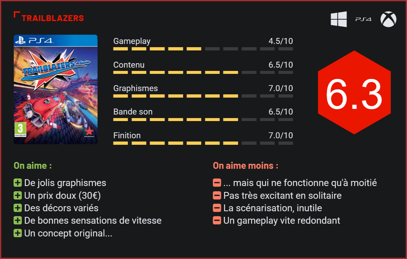 Développé par un petit studio indépendant, Trailblazers est un jeu de course futuriste atypique qui joue la carte de la coopération pour se démarquer. Sorti de nulle part, Trailblazers est un nouveau rival pour Reddout et le sympathique RMX, qui se démarque des autres jeux de course futuriste par son design cartoonesque et son concept qui lorgne allègrement du côté de Splatoon. Car s’il est toujours question de conduire des bolides capables d’atteindre plusieurs centaines de km/h, Trailblazers se base principalement sur la coopération. Dans le jeu de Rising Star, le joueur affronte en équipe un crew adverse. Chaque membre de l’équipe peut repeindre la piste de la couleur de son équipe. En passant sur cette peinture, le joueur peut bénéficier d’un joli boost de vitesse, et accumuler les performances. Il bénéficie à l’inverse d’un malus lorsqu’il passe sur la couleur déposée par l’équipe adverse. Amusant, le concept montre toutefois vite ses limites puisqu’à huit joueurs, l’action a tendance à devenir vite très confuse. Le niveau de difficulté est d’ailleurs plutôt élevé pour un jeu du genre. Plus technique qu’il n’y paraît, Trailblazers est un titre relativement fun, mais dont le concept reste très limité. Car si asperger une carte complète de peinture pour remporter la partie dans un Splatoon prend son sens, réaliser la même chose dans un jeu de course pour bénéficier d’accélérations est un concept qui semble tout de suite plus étrange et qui ne fonctionne qu’à moitié. Très vite, on regrette de ne pas pouvoir exploiter à son plein potentiel le jeu, et on se dit que tout compte fait, Trailblazers aurait pu être meilleur sans intégrer cette idée. Car tous les ingrédients d’un bon jeu de course futuriste sont là : les sensations de vitesse sont bonnes, les décors sont beaux et variés, les tracés sont intelligemment pensés et visuellement le jeu se défend plutôt bien. Tout au plus regrettera-t-on un mode solo mou du genoux, qui fait davantage office de didacticiel que de mode carrière, et une scénarisation dont on se serait bien passée, avec des dialogues creux et des animations d’un autre âge. Bourré de bonnes idées, Trailblazers est donc victime de sa propre originalité et d’un concept qui ne décolle jamais. Regrettable, quand on sait que les bases du jeu sont bonnes et qu’on prend même un certain plaisir à parcourir les défis. L’un dans l’autre, le titre tirera toute sa richesse de son multijoueur – toutefois, difficile d’imaginer Trailblazers connaître un énorme succès et construire une gigantesque communauté. Pour un jeu à 30€, Trailblazers se défend donc plutôt bien, mais son concept très particulier risque malheureusement de lui jouer de mauvais tours – les amoureux de jeux de course futuristes préférant le style d’un RMX ou d’un Reddout, les autres jetant un coup d’œil étonné à ce titre atypique… Conclusion En dépit de son prix et de sa plastique généreuse, Trailblazers ne parvient pas tout à fait à séduire, la faute à un gameplay sans doute trop original, qui ne fonctionne qu’à moitié. Trop répétitif, le jeu souffre également d’un mode solo peu excitant et d’une mise en scène d’un autre âge. Dommage, d’autant plus que les sensations de vitesse étaient plutôt bonnes, le concept original et les décors variés. Entre deux parties de RMX, les amoureux de jeux de course futuristes pourraient toutefois y trouver un certain réconfort – à condition d’y jouer entre potes.