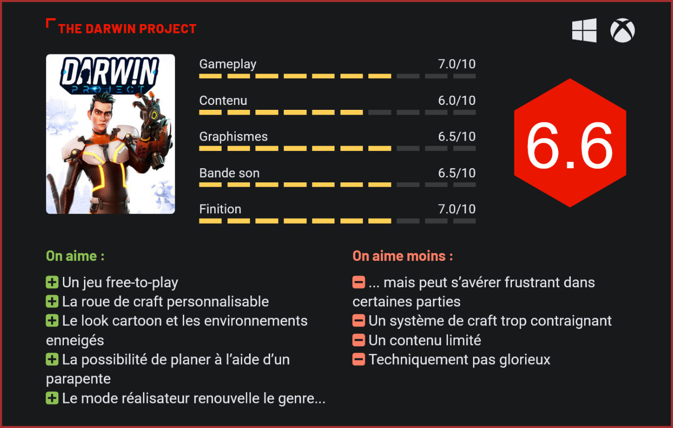 Des pièges, de la traque et de la neige, voilà qui résume parfaitement ce nouveau jeu de battle royale venu du Canada, qui se démarque avec des idées novatrices. Lancé en accès anticipé depuis le mois de mars, le jeu de Scavengers Studio a depuis changé de modèle et passe au free-to-play. Les joueurs ayant déboursé les 14.99€ pour l’accès anticipé recevront un pack de skins et des objets légendaires. Si le studio montréalais a dû changer son fusil d’épaule pour faire face à la sévère concurrence des battle royale, le titre n’est cependant pas dénoué de qualités. Le jeu se déroule dans un futur à l’ambiance post-apocalyptique, une ère glaciaire est sur le point de frapper et les autorités mettent en place le projet Darwin. Entre expérience scientifique et divertissement télévisuel, les candidats devront survivre dans le grand froid et lutter contre les autres candidats pour s’assurer la victoire. Un battle royale donc, mais avec des petites différences qui rafraichissent le concept. Premièrement, à l’heure où les ténors du genre proposent des batailles avec plusieurs dizaines de joueurs présents dans l’arène, Darwin Project prend le parti de limiter les candidats à 10. L’idée est de diminuer grandement la taille de la carte, et ainsi de limiter les temps morts. Il est possible de jouer en solo ou en équipe (2×5). Un jeu au look agréable. Comme tout battle royale qui se respecte, vous débutez la partie isolé dans un coin de la carte, avec pour seules armes une hache et un arc à flèches. À partir de là, il faudra traquer et tuer les neuf autres combattants. S’il n’y a que deux armes, vous aurez accès à toute une panoplie de compétences et de pièges pour tuer vos adversaires avec créativité. Il faudra donc faire un choix entre prendre la peine de ramasser des ressources et crafter des objets qui vous rendront plus puissant, mais toutes ces actions vous exposeront et permettront aux adversaires de vous pister. Un système de craft qui rappelle Fortnite, mais avec petite innovation : la roue de craft est personnalisable. Avant chaque partie, il est possible de choisir les différents types de flèches, de pièges, de compétences et de pouvoirs qui vous serviront durant la bataille. Ces choix permettent à chaque utilisateur de générer sa propre stratégie et de ne pas tomber toujours sur le même style d’adversaire. Le système de craft est varié. Comme l’introduction du jeu l’explique, le projet Darwin est en fait une émission de télé-réalité. Un onzième joueur abandonnera les armes et endossera la casquette de réalisateur. Celui-ci contrôlera divers éléments pour orienter la partie pour que celle-ci soit la plus sensationnelle. Le réalisateur peut se déplacer directement sur toute la carte et peut voir tous les joueurs. En fait, il s’agit du maître du jeu, c’est lui qui va décider quelle zone est supprimée, quel joueur va être soigné, etc. Il pourra aussi déposer des colis avec des pouvoirs spéciaux sur la carte. Le mode réalisateur est le principal atout de Darwin Project, tout va se baser sur les actions de ce joueur. Celui ayant même la possibilité d’envoyer une bombe nucléaire, tuant ainsi tous les joueurs présents dans une zone. Si le mode réalisateur est innovant, il peut se montrer tout aussi frustrant : le concept forçant le réalisateur à “avoir ses favoris”. Il a par exemple la possibilité d’aider des joueurs en leur donnant des indices, mais il a également la possibilité de les nuire en leur mentant. Ainsi, les joueurs frustrés peuvent aussi donner une mauvaise note au réalisateur sans réelle justification. La plus grosse innovation du jeu est donc aussi son plus gros défaut. Qui dit émission de télé-réalité, dit spectateur. Les joueurs devront offrir un spectacle de qualité aux spectateurs de la plateforme de streaming Twitch. En effet, grâce à une extension Twitch, les spectateurs ont la possibilité d’interagir avec le réalisateur de la partie. Sous la forme de vote, les utilisateurs Twitch choisissent de soigner un joueur ou au contraire de lui mettre une cible sur le dos, influençant directement le cours de la partie. Le froid est un ennemi de plus. Pour les graphismes, le jeu utilise le moteur Unreal Engine, il tournera donc sur une machine modeste. Les graphismes sont mignons, les développeurs ayant misé sur un look cartoon. Le design assez simple et enfantin du jeu ne plaira pas à tout le monde, mais il a le mérite de rendre l’action plus claire. Comme l’histoire prend place dans le Grand Nord canadien, les environnements font la part belle aux forêts et aux reliefs montagneux. Au niveau des combats, ceux-ci sont nerveux, mais l’arc à flèche demande un certain temps d’adaptation. Après quelques heures de jeu, on se rend finalement vite compte que les duels se transforment souvent en concours de sauts maladroits pendant lesquels les joueurs s’envoient des flèches. Les nombreux objets et améliorations que permet le système de craft sont bien souvent sous-utilisés par les joueurs. La faute au système de craft un peu trop contraignant et à une récolte des ressources un peu trop longue. Noyé dans la masse de jeux du genre battle royale, Darwin Project sort du lot et mérite qu’on s’y intéresse. Le jeu commence à attirer du monde, surtout depuis son passage à la formule free-to-play. Un succès qui se voit également sur la plateforme Twitch. Conclusion Malgré quelques défauts, Darwin Project remplit tout à fait sa mission et se distingue de la masse de jeux battle royale. Le jeu est beau, fun et facile à prendre en main, mais c’est surtout l’interaction entre les joueurs, le réalisateur et les spectateurs sur Twitch qui apportent un vrai plus. On rappelle que le jeu est free-to-play et que les développeurs apportent encore régulièrement des améliorations. Enfin, il faut souligner le fait qu