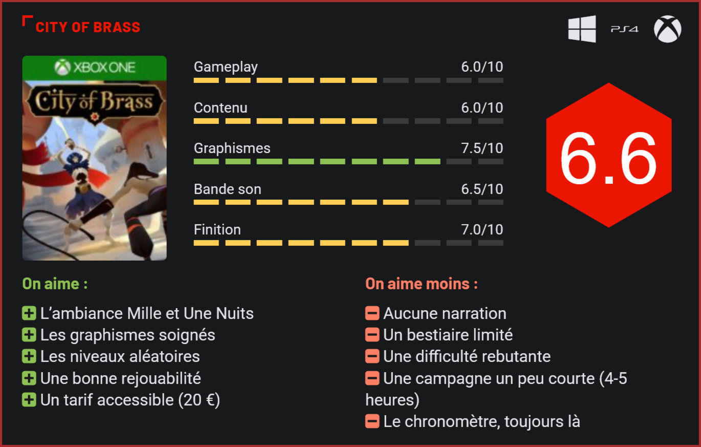 Développé par le studio australien Uppercut Games fondé par d’anciens membres d’Irrational Games (Bioshock 1 & 2), City of Brass est sorti de sa phase “Early access” sur Steam pour voir officiellement le jour sur PC, PS4 et Xbx One. Son univers des Mille et une Nuits cuisiné à la sauce rogue-like tient-il du génie ? Réponse sans plus tarder. City of Brass place le joueur dans la peau d’un voleur armé d’un sabre et d’un fouet qui va devoir se frayer un chemin dans une cité maudite où les habitants ont été transformés en squelettes, génies et autres djinns. Comme tout bon voleur qui se respecte, votre but est d’amasser un maximum de trésors et de lever au passage la malédiction qui frappe cette cité du Moyen-Orient. C’est en tous cas ce que nous évoque entre les lignes le très succinct didacticiel du jeu, City of Brass étant dénué de toute autre forme de narration. Et on recommence encore et encore… Le titre s’apparente dès lors à un plus ou moins long run durant lequel le joueur conserve son équipement, mais aussi ses points de vie. Chaque mort est donc synonyme de « retour à la case départ » mais, heureusement, lorsqu’un boss est éliminé il est possible de se téléporter au niveau qui suit (via un portail situé à l’entrée de la cité). Pour faciliter ou corser l’aventure, des bénédictions ou fardeaux peuvent être activés en début de partie. Diminuer le nombre de pièges, augmenter le nombre de cœur, supprimer la limite de temps imposée par le sablier, autant de « réglages » qui s’avéreront indispensables pour explorer de façon un peu plus sereine les murs de cette vieille cité qui va vous donner bien du fil à retordre. Les ennemis sont en effet particulièrement offensifs et les pièges suffisamment retors pour vous faire enrager dès les premières tentatives. Mais une fois les mécanismes maîtrisés et la bonne stratégie adoptée (y aller de front sera la plupart du temps punitif), on se laisse prendre par le challenge proposé par City of Brass et la frustration fait dès lors place à la persévérance. Un gameplay qui fouette Simple et efficace, le gameplay manque toutefois de profondeur pour provoquer de grandes sensations. Globalement, il n’y a qu’un seul type d’attaque pour le fouet comme pour le sabre. Pas de coup circulaire avec le fouet ni de parade à l’horizon. Dommage. Les combats ne sont dès lors pas très excitants, même si il est possible d’étourdir ou de faire tomber les ennemis en visant leur tête ou leurs pieds à l’aide du fouet. Pour compenser cette monotonie, les gars d’Uppercut Games misent tout sur le décor et les nombreux pièges qu’il contient. Gouffres, barrières de piques, brasiers, il est possible de pousser ou de tirer les ennemis vers ceux-ci pour les éliminer. Sympathique, d’autant que chaque niveau est créé de manière procédurale, ce qui offre des possibilités différentes à chaque run. L’équipement, très limité, peut être amélioré en achetant certains bonus auprès de marchands régulièrement présents dans les niveaux. Seul hic, on ne sait jamais vraiment ce que l’on achète avant de l’avoir essayé (et donc d’avoir dépensé son or durement gagné) ! Fouet enflammé, fouet de glace, squelette fantôme qui se bat à vos côtés, ces améliorations, sans être indispensables, élargissent sensiblement les possibilités. On aurait souhaité un jeu plus complet Notons enfin que le joueur dispose de trois vœux à dépenser parcimonieusement durant la campagne. Ceux-ci permettent de convertir des génies maléfiques en tourelles de défense, d’avoir accès à des objets rares auprès des marchands ou encore de régénérer sa barre de vie auprès d’un génie de soin, ce qui est d’ailleurs l’un des rares moyens de récupérer de la vie de manière significative (des cœurs individuels sont parfois présents chez les marchands, mais cela est bien insuffisant). Une nouvelle preuve de la difficulté et du manque d’équilibrage de ce jeu qui, en l’état, laisse un arrière-goût amer de frustration. Un rééquilibrage ainsi que quelques ajouts ne feraient certainement pas de mal à ce titre que l’on sent pourtant conçu avec un réel amour pour le genre et qui possède en son cœur un beau potentiel. Tel qu’il est, et vendu une vingtaine d’euros, City of Brass s’en tire in extremis avec les honneurs, mais semble avant tout prédestiné aux amateurs de rogue-like et aux speedrunners en manque de challenge. Conclusion City of Brass devrait ravir les amateurs de rogue-like en quête de challenge. Simple mais efficace, son atmosphère des Mille et Une Nuits finalement trop peu représentée dans le jeu vidéo en fait un titre qui séduit par son charme et son accessibilité, mais peut s’avérer aussi rapidement agaçant. Pour le dompter, il faudra s’y plonger et y passer des heures. Mais une fois maîtrisé, il procure de bonnes petites sensations et offre surtout une bonne rejouabilité grâce à ses niveaux générés aléatoirement. Pour autant, et malgré son prix de vente relativement bas (20€), difficile de le conseiller au grand public tant au premier contact le jeune peine à séduire avec son absence totale de narration, son bestiaire limité, ses coups fort peu variés, et sa campagne qui manque de piquant.