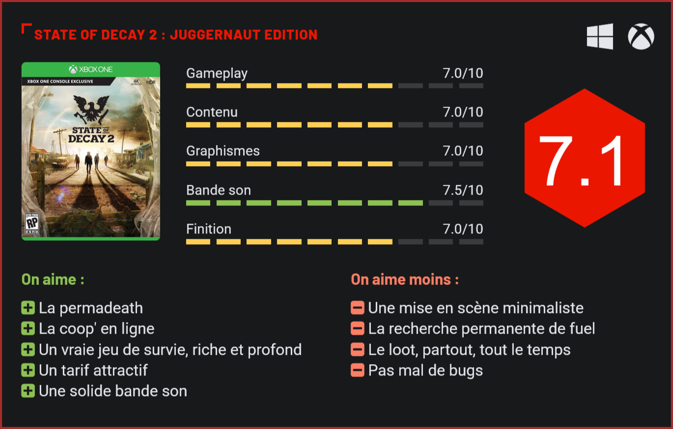 Jolie surprise à l’époque, State of Decay avait entrouvert les portes pour une nouvelle franchise qui aurait pu rapporter gros à Microsoft. Après un lancement désastreux, sa suite est parvenue à s’imposer comme un très bon jeu de survie. Rappelez-vous, en 2013, un petit studio indépendant livrait un jeu indé ambitieux qui proposait aux joueurs de tenter de survivre à une invasion de zombies en établissant leur propre colonie. Le projet avait à l’époque attiré l’attention de Microsoft, qui l’avait pris sous son aile jusqu’à la sortie du jeu, au format numérique. Joli succès commercial, le premier volet avait poussé Microsoft à supporter le développement d’une réédition du jeu sur Xbox One, et d’une suite, plus ambitieuse, qui sortirait au format physique cette fois. Reprenant dans les grandes lignes le concept de son ancêtre, State of Decay 2 joue essentiellement la carte du multijoueur pour tirer son épingle du jeu. Le jeu se rapproche d’un Walking Dead dans son concept puisqu’il propose au joueur de prendre la direction d’un petit groupe de survivants dans un univers post-apocalyptique. Face à des hordes de zombies, il faudra établir une colonie, sécuriser un périmètre et organiser des missions pour chercher denrées, matériaux et survivants et ainsi agrandir ainsi sa colonie. Ne vous attendez toutefois pas à un jeu narratif dans la veine d’un Last of Us puisque State of Decay 2 est un jeu bac-à-sable, qui se rapproche davantage d’un GTA que d’un jeu d’aventure. En début de partie, le joueur devra choisir un couple de héros, qui présentent tous des particularités différentes, apprendre les rudiments du gameplay à travers un bref tutoriel, puis choisir sa carte de jeu – chacune d’elle proposant des environnements différents et un niveau de difficulté différent également. Malgré la présence d’un tutoriel, les débutants auront beaucoup de mal à comprendre les rudiments du métier. State of Decay est un jeu dans lequel il n’est pas évident de se plonger mais qui propose toutefois une expérience de jeu intense et surtout très immersive. Ceux qui adhéreront à son concept y passeront des heures et des heures… Car State of Decay 2 n’est pas un bête shooter. Certes, le jeu propose son lot de gunfights, mais c’est bien l’aspect survie qui est principalement mis en avant. Il faudra looter beaucoup pour survivre – faire du stock de matériel, d’armes et de denrées, gérer sa petite colonie en créant de nouvelles infrastructures avec les matériaux collectés, l’agrandir, recruter de nouveaux membres, et s’assurer que tout ce beau monde est en bonne santé. Sans quoi, certains survivants risquent de vous quitter… Après avoir appris les rudiments de la survie, le joueur partira en mission pour récupérer différents équipements. Le scavenging est une partie importante du gameplay, et le joueur devra fouiller le moindre recoin pour récupérer des matières premières. Un concept amusant quelques heures mais qui montre vite ses limites. Car en dehors de ça, et des missions de sauvetage de survivants, le jeu ne propose pas grand chose à se mettre sous la dent. Il manque cruellement de narration. Les missions ont également tendance à toutes se ressembler. Quelques petites idées permettent toutefois d’ajouter un peu de piquant à la partie, notamment la fameuse “peste rouge”, une maladie que votre joueur pourra contracté une fois mordu par une créature infectée – heureusement, elles ne courent pas les rues! -, et qui nécessitera l’usage d’un sérum pour être soignée, sans quoi votre joueur quittera définitivement ce monde. Une permadeath amusante, qui ajoute un certain enjeu. Les mécanismes du jeu sont bien huilés. Pour survivre face à cet apocalypse zombie, le joueur pourra compter sur ses coéquipiers, son armement, ses statistiques (à améliorer!), des véhicules et sa faculté à gérer le danger, car oui, State of Decay 2 peut être très exigeant. Lorsqu’un personnage est infecté, que la colonie est à cours de ressources et que vos alliés sont attaqués, il devient vite nécessaire de faire un choix, et des dommages collatéraux surviennent quasi systématiquement. En solo, le jeu est déjà assez amusant. Il montre toutefois un tout autre visage en coop, avec des amis. Partir en mission à quatre est beaucoup plus fendard qu’en solo. On notera au passage que les développeurs ont ajouté de multiples contenus après la sortie du jeu, dont un mode survie très sympathique. Le visage du jeu a également totalement changé. Si, à sa sortie, State of Decay 2 était un désastre, avec ses nombreux bugs, ses ralentissements, l’IA désastreuse des personnages et sa réalisation faiblarde, le titre s’est littéralement transfiguré à travers les mises à jour. La plupart des défauts techniques ont été corrigés et les développeurs ont même relevé de plusieurs crans la réalisation, en améliorant le rendu de nombreux éléments graphiques. Alors oui, State of Decay 2 a toujours ses petits défauts : des menus peu ergonomiques, quelques raccourcis absents, une réelle avarice au niveau des explications apportées au joueur, dne absence totale d’objectif sur le long terme, mais il se présente également comme l’un des jeux de survie les plus complets et les agréables à parcourir. Encore faudra-t-il passer le cap de 2 ou 3 premières heures de jeu et bien saisir les mécanismes de jeu. Conclusion Si à sa sortie, State of Decay 2 avait eu du mal à convaincre, les développeurs d’Undead Labs sont parvenus à totalement transfigurer leur jeu au fil des mises à jour, corrigeant les nombreux bugs et ajoutant quantité de contenus. Très clairement, State of Decay 2 est un titre qui ne s’adresse qu’à un public élitiste, amateurs de jeux de survie. Il n’en reste pas moins très riche et propose une expérience de jeu coopérative passionn