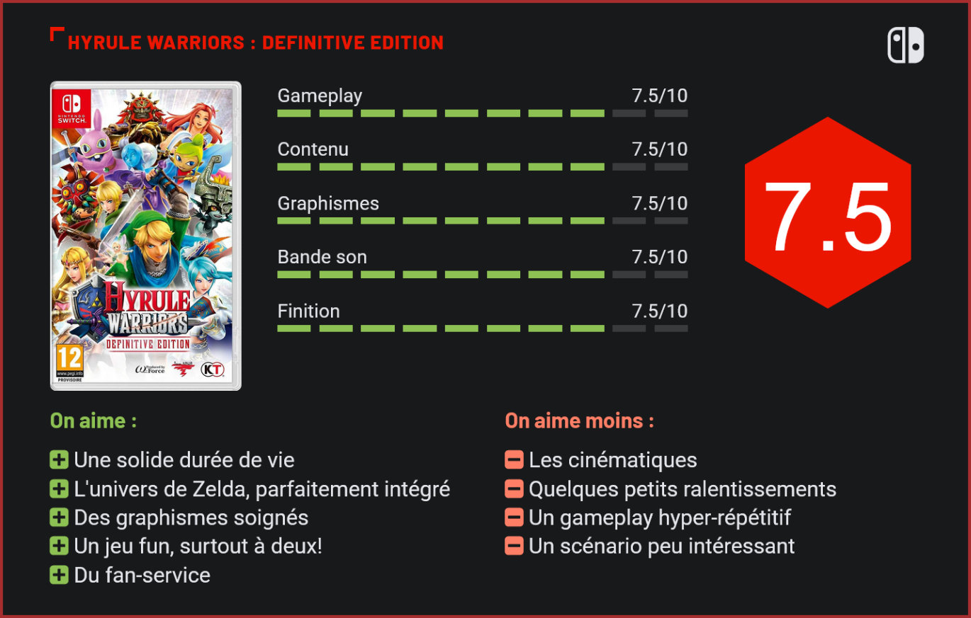 Sorti initialement sur WiiU, le sympathique Hyrule Warriors a droit lui aussi à un portage en bonne et due forme sur Switch, avec à la clé quelques jolies nouveautés… Après Bayonetta 2, Donkey Kong et en attendant Captain Toads, les propriétaires de la petite console hybride de Nintendo peuvent à présent découvrir le portage d’un autre jeu sorti initialement sur la WiiU. Une façon pour Nintendo d’agrandir le catalogue de jeux de sa console sans trop d’efforts tout en permettant à ceux qui n’avaient pas craqué pour sa console précédente de redécouvrir une partie de son catalogue… Car si la WiiU a fait un joli flop commercial, son catalogue de jeux méritait à plus d’un titre d’être revisité. Et, à plus d’un titre, Hyrule Warriors figurait tout en haut de la liste des titres méritant une refonte sur Switch. Le jeu d’Omega Force (Dynasty Warriors) est certes un musô tout ce qu’il y a de plus classique, mais n’en reste pas moins un très bon défouloir, et surtout une formidable opportunité pour les fans de Zelda de se replonger dans l’univers de la série en attendant un nouvel épisode de la franchise… Là où Omega Force marque des points, c’est dans le fait que le studio de développement est parvenu à parfaitement s’approprier l’univers de Zelda. Dans la pratique, Hyrule Warriors n’est donc pas un bête skin de Dynasty Warriors puisqu’il propose un scénario inédit, son lot de cinématiques, et adapte son gameplay à l’univers de Link. Beaucoup plus dynamique qu’un musô traditionnel, Hyrule Warriors conserve pourtant les mêmes ingrédients. Il sera ainsi question de se préparer à la bataille en étudiant le terrain sur la mini-carte stratégique en début de partie, avant de se lancer dans les combats. Comme dans Dynasty Warriors, il faudra massacrer des centaines d’adversaires à grands renforts de coups spéciaux. Pour remporter la partie, il ne suffira toutefois pas de foncer dans le tas puisqu’il faudra réaliser différentes sous-missions en escortant par exemple des alliés qui vous ouvriront la voie, ou en éliminant un commandant adverse. Plus stratégique qu’il n’y paraît, le jeu d’Omega Force n’en reste pas moins très fun. S’il est possible d’y jouer seul – et de switcher d’un personnage à l’autre en appuyant sur l’une des flèches du pad -, c’est bien à deux joueurs, en coopération, que le titre montre toute sa richesse. En s’entraidant, les deux joueurs pourront progresser sur la map de façon séparée, et recomposer une armée pour affronter des boss titanesques. On notera par ailleurs que l’éditeur ne s’est pas contenté de porter son jeu sur Switch mais également corrigé certains de ses petits défauts. Ainsi, on note l’apparition d’un système de navigation rapide qui permet de se déplacer rapidement sur la carte. Egalement parmi les nouveautés : un système d’ordres qui permet de diriger ses alliés sur le champ de bataille. Rien de transcendant en soi, mais de quoi rendre la progression moins stressante… L’aventure solo promet tout de même près de 10h de jeu, et vous fera parcourir des paysages emblématiques d’Hyrule, du château de la princesse Zelda au désert Gerudo. Les décors, très joliment réalisés, rappelleront sans doute de bons souvenirs aux fans de la série. Riche en contenu, le jeu propose tout de même 29 personnages jouables dans cette réédition. Omega Force se montre d’ailleurs très généreux au niveau des modes de jeu avec quelques petites nouveautés avec notamment l’ajout des défis de boss, de challenges et le mode Ganon, qui vous placera dans la peau d’une créature gigantesque, amusant à défaut d’être incontournable. Bourré de clins d’oeil à la série de Nintendo, Hyrule Warriors parvient donc à tirer son épingle du jeu en travaillant son univers. Des poulets qui se transforment en véritables machines à tuer lorsqu’ils encaissant des dommages collatéraux à l’armement (évolutif) de vos personnages, en passant par les boss titanesques, les différentes tenues des personnages et surtout son très large casting de personnages qui disposent tous de leur propre palette de coups, Hyrule Warriors est un véritable ode à la série. Certes, on pourra lui reprocher son scénario guère passionnant, des cinématiques peu inspirées et une certaine répétitivité – liée au genre. Mais dans l’ensemble, Hyrule Warriors s’impose comme un excellent défouloir et assurément le meilleur spin-off de la série de Nintendo jamais sorti. Cette réédition sur Switch s’offre non seulement de nombreux contenus inédits mais également et surtout une jolie refonte graphique, avec des personnages beaucoup plus détaillés, des décors retravaillés et des effets spéciaux particulièrement impressionnants. Certes, on ne peut pas vraiment parler d’une claque graphique, mais pour un musô, Hyrule Warriors est plutôt impressionnant. D’autant plus qu’une fois dockée, la machine fait tourner pratiquement sans aucun ralentissement le jeu. En mode nomade, quelques petits ralentissements pourront se faire ressentir lorsque le joueur affrontera des armées d’ennemis, mais rien de très grave. Malgré son prix de vente, Hyrule Warriors mérite donc le détour, d’autant plus que sa durée de vie dépasse allègrement les 30h de jeu, et que le line-up de la petite console de Nintendo souffre encore du manque de support des éditeurs tiers. Un must absolu pour les fans de Zelda comme pour les fans de musô. Conclusion Plus qu’une simple réédition, Hyrule Warriors Definitive Edition est une véritable refonte intégrale du jeu sorti sur WiiU. Généreux, Omega Force nous livre quantité de contenus inédits (pas moins de 29 personnages sont au programme, et plusieurs modes de jeu inédits sont de la partie) et une jolie refonte graphique de ce qui restera pour un moment encore comme le meilleur spin-of