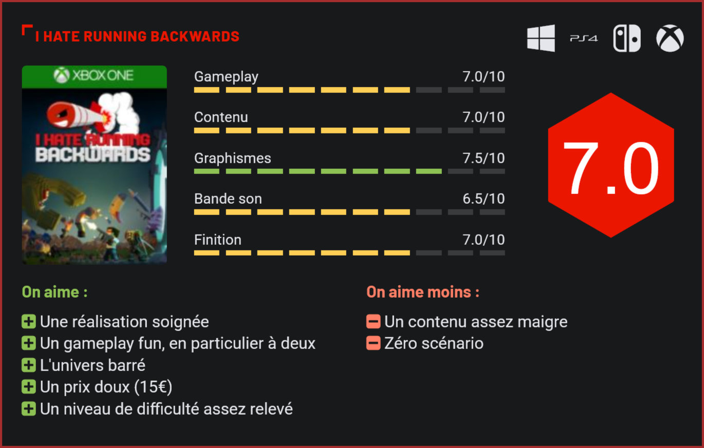 Développé par le petit studio indépendant Binx Interactive, I hate running backwards est un shoot them up old-school qui joue la carte de l’originalité en misant sur un casting décalé et un gameplay inversé. Explications. Habitué des productions sortant des sentiers battus, Devolver Digital a chapeauté la production d’un petit shoot them up complètement barré, jouant la carte nostalgique avec ses graphismes pixélisés, et réunissant un joli casting avec notamment des personnages tirés des franchises Serious Sam et Shadow Warrior. Un cocktail explosif qui débarque aujourd’hui sur PC, Xbox One, PS4, et plus tard sur Switch. Mais avant de poursuivre, il est important d’expliquer en quoi I hate running backwards diffère des autres shoot them up. Tout d’abord, comme son nom l’indique, le jeu propose une progression en marche arrière, le joueur devant courir en arrière tout en shootant les monstres qui apparaissent en bas de l’écran. Mêlant habilement des éléments propres aux shoot them up et aux Temple Run-likes, le titre de Binx Interactive fait plutôt mouche avec son gameplay nerveux et sa prise en main très accessible. Outre son gameplay inversé, le jeu de Binx présente également la particularité d’avoir été conçu avec un moteur procédural. Concrètement, chaque partie sera totalement différente puisque les niveaux sont générés par la machine et par “chargés tels quels”. Ce qui est en soi intéressant, même si dans la pratique, cela permet surtout aux développeurs de se décharger d’un véritable mode solo avec un mode “sans fin” généré de façon procédurale. Dommage tout de même car au final, pas d’élément narratif ni de sauvegarde en cours de partie. I hate running backwards est un jeu rétro dans la plus pure tradition du genre. Cet élément pourrait d’ailleurs freiner de nombreux joueurs, qui trouveront certes le concept du jeu accrocheur mais son système de progression agaçant. D’autant plus que le niveau de difficulté est plutôt élevé… La bonne nouvelle, c’est qu’au fur et à mesure de recommencer la partie, on intègre les mécanismes du jeu. Les power-ups sont nombreux et il faut pouvoir les utiliser à bon escient. Dans le même ordre idée, le jeu a tendance à être beaucoup plus fun à deux, en coopératif. Difficile toutefois d’être pleinement séduit par un titre certes accrocheur et plutôt fun, mais qui manque cruellement de profondeur et de modes de jeu. Tout au plus, les plus mordus pourront s’amuser à débloquer les nombreux bonus et personnages cachés en recommençant partie après partie… D’un autre côté, le titre parvient tout de même à tirer son épingle du jeu avec son esthétique soignée, ses décors colorés, surtout inspirés de Serious Sam, son large bestiaire, et sa bande sonore soignée. Rien de transcendant en soi, mais pour un petit shooter à 15€, I hate running backwards s’en sort plutôt bien, notre plus grand regret visant la maigreur relative du contenu qui nous est ici proposé. Car n’ayons pas peur de le dire, en dépit du fun qu’il procure, le jeu de Binx s’adresse à une certaine élite, un public de passionnés habitué aux shoot them up old school. Inutile donc de vous précipiter dessus si vous n’avez pas un minimum de bagage… Conclusion Sorti de l’esprit dérangé de Devolver Digital, I hate running backwards est un drôle de shoot them up, délicieusement old-school, qui ravira les amateurs de rétrogaming. Son univers pixélisé, son niveau de difficulté élevé et son gameplay sortant des sentiers battus en font presqu’un incontournable pour les amoureux du genre. Fun seul ou à deux, en coopératif, le jeu de Binx souffre toutefois d’un niveau de difficulté peut-être trop relevé pour le commun des mortels, d’un contenu très maigre masqué par son aspect procédural, et de l’absence totale d’un vrai mode solo. Un petit divertissement sympathique, à 15€, qui ne mérite donc pas tout à fait son prix.