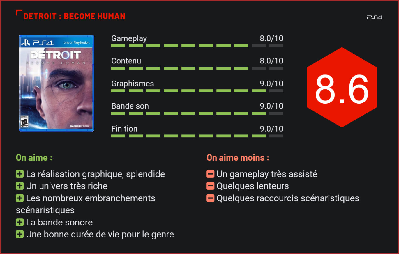 Attendu au tournant, le nouveau jeu de David Cage ne déçoit pas… Après Fahrenheit, Heavy Rain et Beyond Two Souls, le studio français Quantic Dream nous livre sa dernière création sur PS4. Attendu au tournant, Detroit Become Human faisait rêver les passionnés de science-fiction depuis plusieurs années, et s’était même transformé en une véritable arlésienne sur la plate-forme de Sony. Et, fort heureusement, le jeu de David Cage ne déçoit pas. Bien au contraire même puisqu’il s’agit ni plus ni moins que d’un chef d’œuvre de la science-fiction. Reprenant dans les grandes lignes l’univers d’I, Robot, Detroit propose une plongée dans un monde futuriste dans lequel les androïdes font désormais partie intégrante du paysage. Fidèle à ses habitudes, David Cage nous livre une œuvre à mi-chemin entre le jeu vidéo et le film d’animation, en laissant toutefois une plus grande part de liberté dans l’action que dans les précédents jeux de son studio. Plongé dans la ville de Detroit en l’an 2038, le joueur découvre une société radicalement différente de la nôtre, dans laquelle les robots – ou androïdes – ont progressivement remplacé les humains pour les tâches les plus ingrates. Dans cet univers parallèle, la ville de Detroit est devenue le coeur névralgique de Cyberlife, le premier producteur d’androïdes au monde. Autrefois désertée, la mégalopole s’est transformée en une ville avant-gardiste, dans laquelle les robots partagent le quotidien des êtres humains. Là où Quantic Dream marque des points, c’est justement dans le fait que le studio français ne s’est pas contenté de nous livrer un simple jeu de science-fiction, mais nous fait découvrir tous les enjeux de cette société, dans laquelle de nombreux humains se sont vus relégués au rôle de simples figurants, incapables de trouver un travail, démunis face aux multinationales, et surtout très en colère contre un système qui leur a tout volé. Autre point fort de Detroit, le jeu nous fait découvrir son scénario à travers plusieurs personnages centraux, qui se passent le flambeau d’un chapitre à l’autre, et nous permettent d’explorer plusieurs formes de narrations, de plusieurs points de vue. Seul élément commun à tous ces androïdes : ils se découvrent tous une personnalité qui les pousse à entrer en contradiction avec le code qui régit leur comportement. Solide, le scénario du jeu prend du temps à s’installer et explore surtout différentes lignes narratrices, mêlant habilement thriller, enquête criminelle et analyse sociétale. Beaucoup plus riche qu’il n’y paraît, le jeu évite donc brillamment le cliché du blockbuster bête et méchant. Si la qualité d’écriture n’est pas irréprochable – on regrette tout de même quelques clichés et raccourcis un peu trop faciles -, l’œuvre dans son ensemble n’en reste pas moins très convaincante et ouvre plusieurs pistes d’analyse. Car oui, l’univers qui nous est présenté dans Detroit pourrait très bien être le notre d’ici 30 ans. Quantic Dream a véritablement soigné ses détails et n’a pas hésité à aller très loin en multipliant les clins d’oeil. On notera d’ailleurs que même si le joueur contrôle des androïdes, les personnages qu’il incarnera durant l’aventure présentent tous un certain charisme, à l’inverse – malheureusement – de la plupart des humains rencontrés. Dans la pratique, ce qui impressionne le plus c’est le nombre de choix auxquels le joueur est confronté, et qui pourront lourdement influencer le scénario. Car dans Detroit, chaque choix a des conséquences, des dialogues aux actions, et le joueur pourra analyser chacune de ces décisions en fin de partie en naviguant à travers l’interface lui présentant les différents embranchements scénaristiques. Tout ceci offre au jeu de Quantic Dream une excellente rejouabilité, en plus de permettre au joueur de “personnaliser” son expérience. Et si une grosse partie des séquences de jeu impliquent des QTE et des dialogues, Detroit se révèle un tantinet plus ludique que les précédents projets du studio, en ajoutant par exemple des séquences d’enquête qui permettront de débloquer plusieurs embranchement scénaristiques. Certes, le rythme du jeu est relativement lent, mais le scénario est ponctué de quelques séquences d’action et de passages plus nerveux, durant lesquels les décisions des joueurs auront une importance capitale sur le scénario. On notera d’ailleurs qu’outre l’objectif “principal” de chaque mission – par exemple, sauver l’otage d’un androïde hors-de-contrôle -, le joueur devra également réaliser de nombreux objectifs secondaires pour faire progresser l’enquête, en améliorant par exemple ses relations avec son partenaire policier, ou en choisissant – ou non, de sauver une enfant. En plus de nous livrer une aventure inoubliable – et plutôt longue de surcroît -, Detroit Become Human peut également se targuer d’être une jolie vitrine technologique pour la PS4 avec ses graphismes à couper le souffle. Alors bien sûr, les environnements sont de taille très modeste, et il s’agit d’un jeu hybride, qui offre une maigre liberté d’action. Toutefois, la prestation n’en reste pas moins impressionnante, tant au niveau du game design que de la quantité de détails entraperçus. On sent que Quantic Dream a réalisé des efforts considérables pour plonger le joueur dans un univers qui lui paraisse le plus crédible possible. On notera par ailleurs qu’au niveau de la bande sonore également, Detroit Become Human frappe très fort, avec des doublages en anglais d’une très grande qualité, des sous-titres français efficaces, et des bruitages et musiques qui immergent parfaitement le joueur dans l’univers futuriste du jeu. Accessible, en dépit de sa complexité narrative et de son sujet très sérieux, long en d
