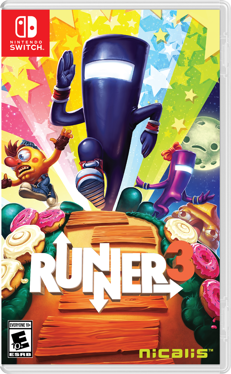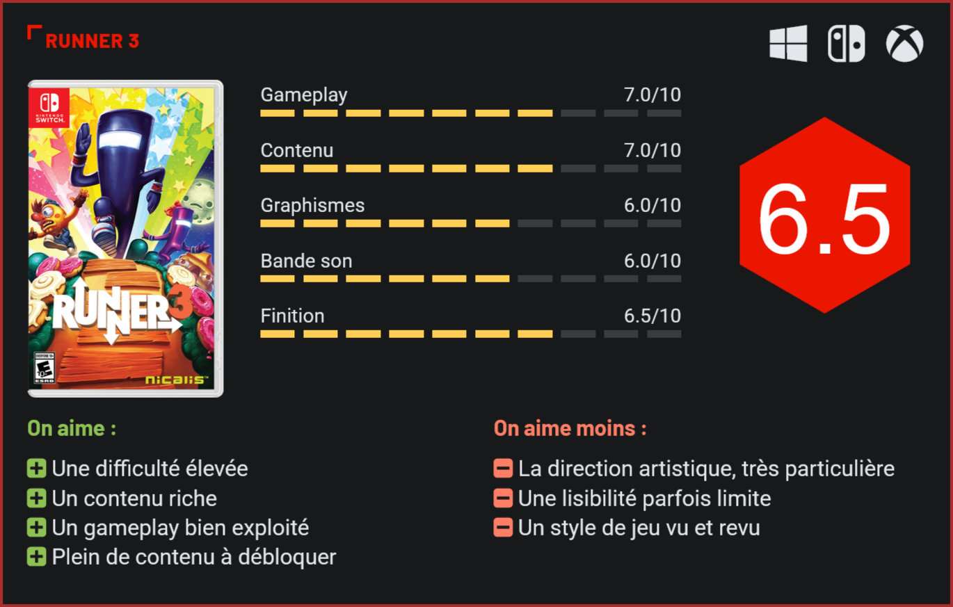 Suite directe de Bit. Trip Runner, Runner 3 tente de remettre au goût du jour un style de jeu qu’on pensait définitivement enterré. Véritable phénomène au moment de sa sortie, Bit. Trip Runner était parvenu à séduire le public avec son univers décalé et son gameplay simpliste. Huit ans plus tard, ses concepteurs tentent de remettre la recette au goût du jour avec Runner 3 sur PC, Xbox One, PS4 et Switch. Titre atypique, Runner 3 reprend pourtant une recette on ne peut plus classique puisqu’il s’agit d’un running-game dans la veine des Temple Run, à ceci près que la progression se fait ici de façon horizontale, de gauche à droite, et que le jeu est découpé en niveaux. Pas d’Endless Runner donc. Là où le jeu se démarque des autres “runners”, c’est au niveau de son univers coloré, barré et atypique. Les concepteurs de Runner 3 se sont lâchés, et cela se ressent dès les premières minutes de jeu. Dans la peau de Commander Video ou de sa compagne Commandgirl Video, il devra parcourir des niveaux semés d’embuches, en n’oubliant pas d’éviter précipices, plates-formes, cours d’eau, scies et autres pièges mortels en sautant au bon moment. Un concept simplissime qui se révèle toutefois très vite des plus coriaces! Car en dépit de son gameplay qui paraît au premier abord simpliste, se cache un jeu à la difficulté particulièrement élevée. Nombreux seront ceux qui devront retenter plusieurs fois le premier niveau, c’est dire! Pour progresser, le joueur devra s’accrocher, et bien maîtriser les différents éléments de gameplay. Car si le joueur ne doit pas contrôler la direction de son avatar, qui court de façon automatisée sur le “tracé” du niveau, il doit en revanche contrôler ses mouvements, des sauts aux glissades, en passant par les coups de pied, les doubles-sauts et les plongeons. Bien plus complexe qu’un Temple Run, Runner 3 exige une bonne dose de dextérité, et de self-control. Pour varier les plaisirs, les développeurs ont ajouté quelques séquences aux commandes de différents véhicules, qu’il faudra cette fois diriger au pad. Les niveaux étant bien longs et souvent dépourvus de checkpoint, il n’est pas rare de devoir s’y prendre à plusieurs reprises pour finir un tracé. La bonne nouvelle, c’est qu’en dépit de sa difficulté, le jeu reste très accrocheur. Son univers graphique très particulier, avec ses univers remplis de bonbons et de friandises, accroche immédiatement le regard, et les commentaires moqueurs du présentateur montrent que les développeurs ne se sont pas du tout pris au sérieux. Autre atout du jeu : son côté pléthorique, avec, outre de nombreux niveaux à parcourir, la possibilité de débloquer quantité de bonus, parmi lesquels des séquences de plates-formes inédites dans lesquelles le joueur pourra cette fois bien contrôler la direction du personnage. Riche en contenu, savoureux, difficile, et suffisamment varié pour nous tenir scotché au pad durant des heures, Runner 3 est probablement le meilleur représentant de son genre à l’heure actuelle. A condition de ne pas être totalement repoussé par sa direction artistique pour le moins particulière, inutile de tourner autour du pot : il s’agit d’un titre incontournable pour tous les amateurs du genre. Conclusion A défaut de réinventer la roue, Runner 3 s’impose comme un excellent running-game, dans la veine de Temple Run, qui parvient à séduire les joueurs avec sa difficulté élevée, son contenu riche et son gameplay parfaitement exploité. Beaucoup plus complexe que Temple Run, Runner 3 fait le pari de commandes complexes et de séquences de jeu variées. Vendu quelques euros seulement, le titre mérite donc le détour, à condition d’accrocher au genre, et de préférence sur une console nomade comme la Switch. Attention toutefois, la direction artistique du jeu risque de ne pas plaire à tous les joueurs…