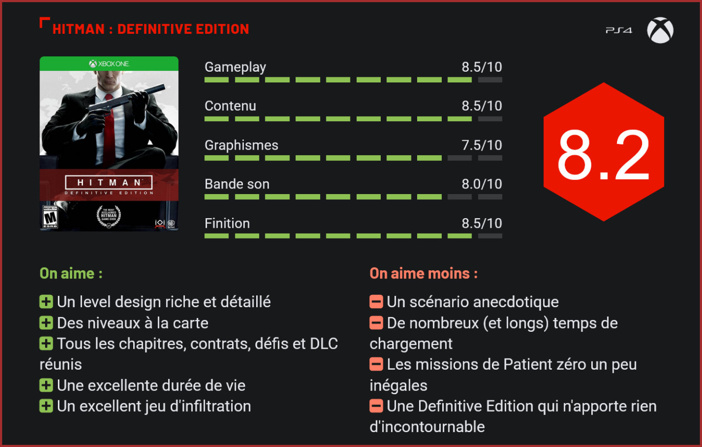Déjà sorti en format physique au tout début de l’année, l’intégralité de la saison 1 d’Hitman se voit ici agrémentée de tous ses bonus et DLC pour une expérience complète en matière d’assassinats virtuels sur PS4 et Xbox One. Sortie au début de l’année 2017, l’intégralité de la saison 1 de Hitman se voit agrémentée dans cette version physique intitulée « Definitive Edition » de toutes ses extensions, comprenant les quatre missions de la campagne Patient Zéro, les contrats bonus « Escalade » (permettant de débloquer trois armes uniques), des packs de tenues à tire-larigot ainsi que tous les défis mis à jour. Un level design assassin Rappelons que le jeu principal propose sept lieux à explorer (la base de l’ICA, Paris, Sapienza, Marrakech, Bangkok, le Colorado et Hokkaido), soit autant de terrains de jeu regorgeant de possibilités d’assassinats, toujours à effectuer en toute discrétion, il va de soi. Si le joueur impatient (qui aura tendance à rejeter en bloc ce type de jeu) peut en faire le tour relativement vite en se contentant d’un seul moyen de liquidation par « niveau », les autres, c’est-à-dire les as de l’infiltration, de l’observation et aussi un peu de la perversité, trouveront amplement leur bonheur dans ces petits paradis pour tueurs à gages en manque de challenge. C’est que cet Hitman renoue avec l’essence de la saga en proposant une expérience d’assassinat pure, propulsant le célèbre Agent 47 dans de somptueux environnements (excepté la base de l’ICA qui sert essentiellement de tutoriel) où il devra éliminer une ou plusieurs cibles sans se faire repérer ni faire de victimes collatérales. Tous les moyens sont bons et chaque environnement bénéficie d’un level design entièrement dédié au meurtre. La mécanique est dans l’ensemble toujours la même, demandant de se déguiser pour s’infiltrer toujours plus en avant, afin d’être au plus près des cibles, et se retrouver idéalement seul avec ces dernières afin de les éliminer sans faire de remous. Choisirez-vous la corde à piano, le silencieux ou ce couteau qui trainait dans la cuisine que vous avez préalablement ramassé ? A moins que vous ayez décidé d’empoisonner le cocktail préféré de votre cible ? Ce ne sont là que les moyens les plus courants afin de compléter les missions, de nombreux éléments aperçus en chemin vous mettant régulièrement la puce à l’oreille quant à une nouvelle opportunité qui peut vous faire remporter la mission en restant à distance (en activant un mécanisme ou en exploitant un élément du décor, par exemple). De la patience et de l’observation avant tout Vous l’aurez compris, le jeu demande beaucoup d’observation, de créativité mais aussi de patience, les premières sessions consistant surtout à observer chaque recoin des niveaux, chaque comportement des nombreux PNJ ainsi que les déplacements de vos cibles. Hitman propose de véritables terrains d’expérimentations en matière d’assassinats sur lesquels il faut toujours redoubler de discrétion. Même si l’IA n’est pas toujours des plus fines, le moindre faux pas est rapidement détecté et les gardes du corps ne prendront pas longtemps avant de vous faire mordre la poussière. La possibilité de paramétrer chaque niveau à l’envie (point d’entrée, avec ou sans indicateurs apparents, etc.) offre d’innombrables approches, approfondissant encore plus la richesse du titre. Et même s’il reste accessible avec notamment l’affichage des opportunités qui vous guident dans les méthodes d’assassinat en affichant vos objectifs les uns après les autres, cet Hitman est principalement à réserver aux amateurs d’infiltration qui voudront découvrir par eux-mêmes toutes les approches possibles. Le cas Patient zéro Initialement proposé en DLC, Patient Zéro vient allonger la durée de vie de cette première saison avec quatre missions. L’histoire est indépendante de la trame principale, même si elle nous replonge à Bangkok, Sapienza, dans le Colorado et enfin Hokkaido. C’est cette dernière localisation qui propose d’ailleurs le plus grand challenge, en offrant en outre une conclusion des plus intéressantes. Les autres sont plus anecdotiques, et font un peu redite. Au terme de ces quatre missions, on ne peut en tout cas qu’être impatient de découvrir ce que IO Interactive et Warner Bros. vont nous réserver pour la seconde saison, en espérant que ceux-ci planchent davantage sur un scénario digne de ce nom, cet Hitman étant en l’état assez pauvre à ce niveau-là. Pour en savoir plus sur le jeu de base, n’hésitez pas à relire notre test publié à l’époque. Conclusion Avec cette Définitive Edition, les fans d’infiltration détiennent LA simulation d’assassinat qui les tiendra en haleine durant des heures et des heures. Avec son level design riche et ses missions paramétrables à l’envie, la saison 1 dans son déroulé principal était déjà conséquente. Avec tous les contrats, missions secondaires et défis supplémentaires réunis, l’expérience globale n’en est que plus forte encore. Dommage que l’ensemble manque de liant, de véritable caractérisation des personnages et d’une narration au diapason pour pouvoir nous faire totalement vibrer. A défaut de totalement nous convaincre, cette Definitive Edition aura au moins le mérite de permettre à certains de rattraper leur retard, en attendant le second volet.