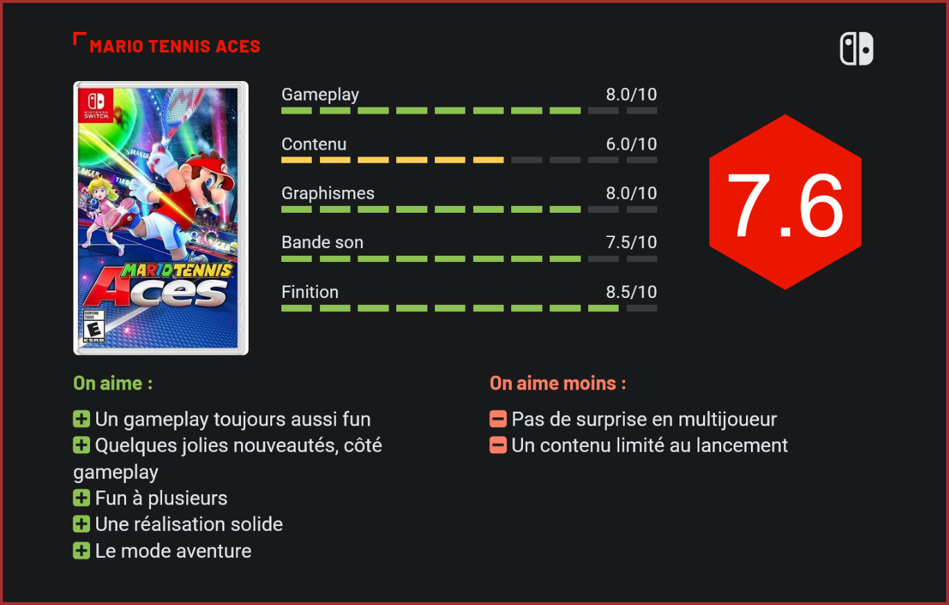 En perte de vitesse depuis quelques épisodes déjà, la série des Mario Tennis opère un retour en force sur Switch, avec Mario Tennis Aces, tout fraîchement débarqué sur la dernière console de Nintendo. Moins populaire que Mariokart, Mario Tennis reste l’une des séries de spin-off parmi les plus abouties au sein de l’univers de Nintendo. Depuis l’épisode sorti sur Nintendo 64, les fans de la franchise n’avaient toutefois pas eu grand chose à se mettre sous la dent. Vivement critiqué au moment de sa sortie, l’épisode sorti sur WiiU souffrait surtout de son contenu famélique, mais également d’un manque cruel de nouveautés. Nintendo espérait donc nous faire oublier cette petite déception avec Mario Tennis Aces, nouvel épisode de la franchise, qui sort cette fois exclusivement sur Switch… Première bonne surprise donc, Aces n’est pas le portage de l’épisode sorti sur WiiU mais bel et bien un tout nouveau jeu, fraîchement développé dans les locaux de Nintendo. Certains éléments de gameplay du dernier épisode disparaissent donc, pour laisser leurs places à quelques jolies nouveautés… L’autre bonne surprise : c’est qu’il est tout à fait possible de désactiver les nouveaux éléments de gameplay pour se rapprocher d’une expérience plus classique, dans la veine de l’épisode sorti sur Nintendo 64. Les puristes apprécieront. Ceci étant dit, les nouveautés introduites par Aces devraient logiquement séduire les joueurs. Nintendo a pris le temps pour imaginer de nouveaux mécanismes de jeu qui s’intègrent parfaitement à Mario Tennis. On remarquera ainsi d’entrée de jeu que si le titre conserve une orientation très arcade pour les frappes et déplacements, il hérite d’une jauge de supercoup des jeux de combat, laquelle permettra au joueur d’élaborer des stratégies complexes pour venir à bout de son opposant. A côté du lift, du lob, du slice et du smash – quatre types de coups que les joueurs pourront réaliser en utilisant les différents boutons de la manette -, il sera donc possible de lancer de super-attaques en faisant grimper sa jauge de supercoup, qui se remplit à chaque frappe. Plus un échange est long, plus il y a donc de chance qu’une super-attaque émerge… Là où les choses deviennent intéressantes, c’est dans le fait que ces super-attaques peuvent également être parées, soit par chance, soit en utilisant sa propre jauge de supercoup pour lancer une “course instinct” qui permettra de parer beaucoup plus facilement le coup de l’adversaire. Inutile de le préciser, le jeu est beaucoup plus technique et stressant avec l’ajout de cette fonction! Pour ajouter une dose de fun au jeu, Nintendo nous livre des stades rempli de pièges à activer (ou éviter). Il ne sera pas rare ainsi de devoir éviter une plante carnivore, in-extremis, ou au contraire, de tirer parti des décors pour prendre un avantage sur son concurrent. Délibérément fun, Mario Tennis Aces offre un solide casting, et un joli rooster de stages également, tous inspirés de l’univers Nintendo. Très bien équilibré, le jeu promet des affrontements nerveux et très funs à plusieurs. Et s’il s’agit d’un titre pensé pour le multijoueur, Aces n’en reste pas moins agréable à parcourir en solo également, grâce à sa campagne qui mélange brillamment matchs et défis. Nintendo parvient ainsi à diversifier les plaisirs en proposant une expérience qui ne se résume pas à l’enchaînement de tournois. Au programme : des tas de défis qui vous feront éliminer des cibles mouvantes, affronter des boss gigantesques et participer à des défis totalement tirés par les cheveux. Un ajout amusant, qui permettra de gonfler la durée de vie du titre de 4 à 6 h, sans ajouter de redondance. Sans surprise toutefois, c’est bien en multijoueur que Mario Tennis prend tout son sens. Jouable en ligne et hors-ligne, le titre de Nintendo a été parfaitement peaufiné et est véritablement taillé pour les affrontements multijoueurs. On regrettera toutefois qu’une fois encore, le contenu du jeu soit relativement limité pour le lancement. Bonne nouvelle en revanche, de nombreuses nouveautés seront ajoutées au cours des prochains mois, avec pas moins de cinq nouveaux personnages à débloquer d’ici la rentrée scolaire. Certes, il est regrettable que tout ce contenu n’ait pas été proposé dès le lancement, mais Nintendo rattrape de justesse une grosse polémique en attendant quantité de DLC gratuits et de futurs ajouts pour son jeu. On espère toutefois que le support durera suffisamment longtemps, et apportera également de nouveaux terrains de jeu et modes de jeu, pour un mode multijoueur certes convaincant, mais qui ne surprend guère. Côté réalisation, Mario Tennis Aces assure sans toutefois surprendre. Les graphismes sont propres, les décors soignés, et les effets visuels donnent brillamment vie à cet univers, mais le jeu ne surprend pas forcément, et affiche une réalisation en phase avec les dernières productions de Nintendo, sans toutefois atteindre le niveau d’un Super Mario ou d’un Zelda. Solide, la réalisation du jeu est mise en avant par une bande son plutôt convaincante, elle aussi, et calquée sur les autres productions de Nintendo. Conclusion A défaut de surprendre, ce nouvel épisode de la série des Mario Tennis parvient à nous convaincre avec son gameplay enrichi de plusieurs nouveautés, son nouveau mode solo rempli de défis et le fun qu’il dégage dans ses parties multijoueurs. Les amoureux de Mario Tennis 64 seront également ravis d’apprendre qu’il est tout à fait possible de revenir au gameplay caractéristique de cet épisode en désactivant certaines fonctionnalités. Pour le reste, malheureusement pas de grosse surprise à l’horizon, et un contenu limité au lancement. Mario Tennis Aces est plutôt une belle réussite, mais pas forcément le hit qu’on attendait…