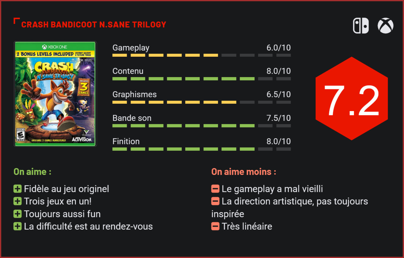 Sorti l’été dernier sur PS4, l’excellent Crash Bandicoot N.Sane Trilogy a aujourd’hui droit à un portage en bonne et due forme sur Xbox One et Switch. L’occasion de se replonger dans ce classique du jeu de plates-formes. Après des débuts remarqués sur PS4 – et une jolie exclusivité temporaire pour la console de Sony -, Crash Bandicoot N.Sane Trilogy débarque enfin sur les consoles concurrentes, avec une compilation qui rassemble les remakes des trois premiers volets, sortis initialement sur PS One. Au programme donc : 3 grands jeux de plates-formes remis au goût du jour, 21 ans après leur sortie. Et le moins que l’on puisse dire, c’est que Vicarious Visions a fait du joli travail sur ce remake des trois premiers volets, nous offrant l’une des meilleures compilations de l’année. Tout d’abord, parce que, visuellement, le jeu a eu droit à une refonte graphique intégrale, avec des visuels qui n’ont rien à envier à ceux des productions actuelles. Le pelage de Crash est surprenant de réalisme, les effets visuels soignés et les animations ont été entièrement retravaillées. Tout au plus regrettera-t-on la relative simplicité des décors – liée indirectement à la volonté du studio de rester fidèle à l’œuvre originale. Ensuite, parce que Crash Bandicoot N.Sane Trilogy ne rassemble pas un mais trois remakes. Les trois premiers volets de la franchise sont rassemblés dans une seule et même compilation, et ont tous eu droit au même traitement de faveur. Avec, à la clé, une durée de vie tout bonnement exceptionnelle! Vous assurer que Crash n’a pas pris une ride serait toutefois vous mentir. Car oui, Crash Bandicoot a vieilli. Principalement en raison de son gameplay. Beaucoup plus dirigiste qu’un Mario ou qu’un Banjo, le titre de Vicarious Visions a conservé son gameplay old-school qui n’en reste pas moins très exigeant. La moindre erreur est ici sanctionnée de la perte d’une vie et le joueur est encouragé à faire preuve de prudence s’il souhaite finir le niveau en vie… Car éviter les précipices, pièges et monstres ne sera pas une tâche facile. Le timing est très important dans les sauts, et les quelques affrontements nécessiteront une petite dose de stratégie. Rien d’impossible en soi, mais il est vrai que l’on n’a plus vraiment l’habitude de se heurter à un tel niveau de difficulté dans un jeu destiné avant tout aux plus jeunes… C’est davantage vrai pour le premier et le second opus que pour le troisième, qui est probablement celui qui s’en sort le mieux, tant au niveau de la prise en main que de la diversité des séquences de jeu. Délicieusement nostalgique, Crash Bandicoot N.Sane Trilogy devrait surtout plaire à ceux qui ont fait les jeux originaux sur PS One. Pas sûr en revanche que les plus jeunes accrochent à un gameplay qui a très mal vieilli. En soi, la prise en main ne pose pas vraiment de soucis : le jeu est accessible et la difficulté plutôt bien dosée. Le concept de die & retry ne s’adapte toutefois pas forcément à un public qui n’a pas l’habitude de l’appliquer dans les jeux actuels… Pour les plus anciens, difficile en revanche de ne pas céder aux charmes de ce remake qui prouve qu’il est possible de ressusciter une franchise que l’on pensait enterrée depuis longtemps. Conclusion Remake réussi, Crash Bandicoot N.Sane Trilogy prouve qu’il est possible de ressusciter une franchise tout en conservant tous les ingrédients du jeu originel. Vicarious Visions nous livre ici un remake qui nous fait redécouvrir la trilogie Crash Bandicoot, avec son gameplay d’origine mais des graphismes réactualisés. Un concept séduisant qui devrait surtout plaire aux joueurs nostalgiques, car dans la pratique, le gameplay de Crash Bandicoot a plutôt mal vieilli, et pas sûr que les plus jeunes accrochent encore à un concept qui pourrait paraître aujourd’hui trop simpliste…