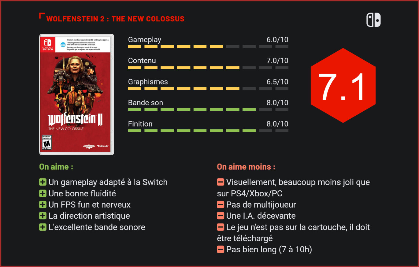 Très bonne surprise sur PS4, PC et Xbox, Wolfenstein 2 a aujourd’hui droit à un portage en bonne et due forme sur Switch, par le même studio qui s’était déjà chargé de porter Doom sur la console nomade de Nintendo. Un pari audacieux, que le studio texan a relevé avec brio. Après avoir porté Doom sur Switch, le studio texan Push Start nous livre donc un nouveau portage d’un FPS culte sur la console de Nintendo. Une audace surprenante, à l’heure où les plus gros studios refusent de porter leurs franchises sur la console de Nintendo, sous prétexte que celle-ci n’est pas suffisamment puissante pour faire tourner les dernières superproductions. Sans surprise, le studio texan aura du donc faire quelques concessions. Moins joli que sur PS4 et Xbox, Wolfenstein 2 n’en reste pas moins un titre très agréable à l’oeil sur Switch. La direction artistique est superbe, et s’il est vrai que les graphismes sont moins fins sur Switch, il est difficile de ne pas être séduit par le travail du studio texan, qui a réalisé de gros efforts pour que Wolfenstein 2 reste un jeu très fluide et agréable à jouer en mode nomade. D’entrée de jeu, ceux qui avaient parcouru la version PS4 / Xbox remarqueront toutefois d’importantes différences au niveau des textures, des effets visuels et de la résolution – divisée par deux. Pour éviter que tout cela ne soit trop voyant, le studio a ajouté des flous de mouvement pas forcément très jolis mais qui camouflent efficacement les artifices. Des concessions nécessaires pour garantir du 30 images par seconde et une expérience de jeu optimale. Alors oui, Wolfenstein 2 est moins beau sur Switch que sur les autres plates-formes, mais le plaisir de jeu est là et ceux qui n’avaient pas pu y goûter sur consoles ou PC devraient prendre leur pied. La bonne nouvelle, c’est qu’au niveau du gameplay, Panic Button a fait beaucoup mieux qu’avec Doom. Wolfenstein 2 est un FPS nerveux, mais son gameplay s’adapte davantage au mode nomade compte tenu du fait que le joueur progresse ici en prenant davantage de couvertures que dans Doom, où il est question de se déplacer rapidement et de tourner sur soi même pour massacrer tous les monstres qui nous coursent à travers le niveau… Du coup, qu’on joue en nomade ou en dock, Wolfenstein 2 reste très agréable à parcourir : les contrôles sont précis, l’expérience fidèle à l’original et le jeu sait se montrer très séduisant. Seul gros regret finalement : vendu plein pot, Wolfenstein 2 nous est livré sans ses DLC sur Switch. Dommage dans la mesure où la sortie tardive aurait justifié une édition GOTY… Conclusion Plus aboutie que le portage de Doom, cette édition nomade de Wolfenstein 2 brille par sa prise en main adaptée au support et sa grande fluidité. Un travail d’exception qui prouve qu’il est possible de faire tourner des titres plus “gamers” et “matures” sur une console qui éprouve encore de grosses difficultés à attirer les gros studios de développement. Ce portage ne s’est toutefois pas fait sans concessions, notamment du côté des graphismes, avec une résolution divisée par deux et des effets visuels au rabais. Si vous n’aviez pas eu la chance de plier le jeu sur un autre support, et que vous rêvez depuis longtemps de massacrer du nazi dans le train ou le métro, ce portage de Wolfenstein 2 est fait pour vous.