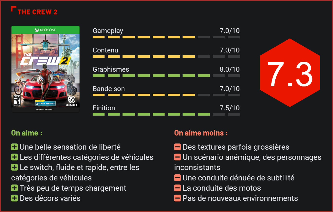 Après un premier volet moyennement convaincant, Ubisoft s’est donné les moyens d’offrir une suite bigger and louder à The Crew pour plus de fun, plus de vitesse mais aussi et surtout plus de véhicules, dans différentes catégories. Le pari tient-il la route ? Accrochez vos ceintures, la réponse arrive à plus de 300 km/h. Ivory Tower, le studio appartenant à Ubisoft basé à Lyon, a mis les bouchées double pour développer la suite de The Crew qui était sorti en 2014 mais qui n’avait pas franchement marqué les esprits. Reprenant son monde ouvert qui s’étend de la côte ouest à la côte est des Etats-Unis, The Crew 2 revoit quelque peu sa formule en se concentrant avant tout sur le fun en proposant désormais, en plus des courses en voitures, tous types de compétitions motorisées. On the road again Cette fois-ci, le joueur a directement accès à l’intégralité de l’imposante carte, qui s’étale donc de New York à San Francisco (durée du trajet en voiture : environ 45 minutes). Les joueurs du premier opus regretteront peut-être de retrouver le même bac à sable, mais il faut tout de même admettre que celui-ci est maintenant beaucoup plus agréable à arpenter, grâce à des graphismes rehaussés (mais toujours pas exempts de défauts) mais aussi et surtout grâce aux nouvelles façons de l’explorer offertes par la multiplicité des véhicules. En effet, vous pourrez découvrir les plus beaux spots du pays de l’oncle Sam sur les routes, mais également dans les airs et sur l’eau. Malgré des textures souvent sommaires, c’est un vrai plaisir de frôler les pieds de la Statue de la Liberté, de passer sous le Golden Gate ou encore d’explorer Monument Valley. La carte a donc entièrement été revue et a également été rendue plus vivante par rapport au premier volet, avec une faune et une flore (ainsi qu’un trafic et des passants) plutôt riches pour un jeu de course. Des quêtes secondaires vous demanderont d’ailleurs de vous attarder sur le décor, en vous demandant de prendre par exemple des photos des paysages et des animaux que vous croiserez lors de vos escapades. Dépaysement garanti ! Visuellement parlant, il ne faut néanmoins pas s’attendre à un Forza Horizon de dernière génération (peu d’effets de particules, clipping régulier), mais vu l’étendue du monde qui nous est offert et la quasi absence de temps de chargement, on ne sera pas trop regardant, d’autant qu’on a droit à des effets de lumières dans l’ensemble plutôt jolis. La course aux followers Le sentiment de liberté ressenti est tel que l’on en oublierait presque que The Crew 2 est un jeu de course. Si on peut en effet se laisser aller à faire le touriste durant de longues minutes, le jeu dispose d’un lot conséquent de courses en tous genres pour nous occuper une vingtaine d’heure durant. Si le jeu propose deux nouvelles catégories de véhicules (le bateau et l’avion) en plus de la voiture et de la moto déjà présentes dans le premier volet, il embarque de nombreuses disciplines et d’innombrables modèles de ces engins. Tout est rassemblé au sein de quatre grandes familles (Street Racing, Freestyle, Offroad et Pro Racing) comprenant chacune des épreuves qui se débloquent au fur et à mesure que l’on évolue. Au programme, en vrac : des courses sur circuit fermé, du motocross, des figures aéronautiques, du rally, du drift, du powerboat, du monster truck, la liste tient du jamais vu au sein d’un seul et unique jeu ! Côté histoire, vous incarnez un newbie qui va devoir faire ses armes dans les différentes catégories citées ci-dessus et ramasser un maximum de followers pour être dans les petits papiers d’une entreprise qui organise des évènements de sports extrêmes qu’elle diffuse massivement sur les médias. Le plus important de ces évènements prend la forme de « live » (au nombre de six) qui sont des courses multi-véhicules lors desquelles il faut briller. En une seconde, on change d’engin pour finir des circuits alliant passages sur terre, dans l’eau et dans les airs. Une fois le premier live débloqué, c’est-à-dire très rapidement, l’option est disponible en exploration libre, pour des rides totalement libres où, d’une simple pression sur le stick, vous pouvez passer d’une voiture à un powerboat ou à un biplan. Grisant. La progression dans le jeu se fait en récoltant de nouveaux followers, ce qui se fait lorsque vous terminez une course avec succès (ce qui vous procure également des pièces d’améliorations) ou parvenez à accomplir les défis. Ce système d’XP très ancré dans son époque augmente également lorsque vous déambulez en dehors des épreuves, quand vous roulez en sens inverse de la circulation, lorsque vous faites des figures, bref, lorsque vous faites des actions considérées comme fun. Cela vous permet in fine de débloquer de nouvelles disciplines et d’acheter de nouveaux véhicules pour enrichir l’expérience de jeu ainsi que votre garage. C’est là que vous pourrez personnaliser vos engins (et votre avatar), à la façon d’un bon vieux Need for Speed. Rush rush Il n’y a en somme rien d’autre à chercher dans The Crew 2 à part le fun et la vitesse. Les sensations de conduite sont dans l’ensemble bonne (même si l’avion demandera un peu plus de maîtrise, son maniement se rapprochant fort de ce que GTA proposait) et le titre n’a pas la prétention de jouer dans la cour de la simulation. Arcade, The Crew 2 l’est jusqu’au bout des pneus avec une physique qui n’est pas des plus réaliste (les piquets et panneaux de signalisation s’envolent à votre passage, les conditions météorologiques ne changent quasiment rien à la conduite) et une conduite peu subtile et très permissive, qui n’est définitivement pas destinée aux puristes de la simulation. Gros bémol à signaler toutefois du côté des motos dont la conduite est totalement aux frais