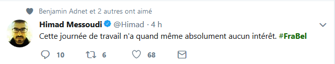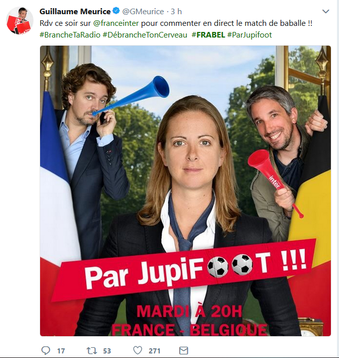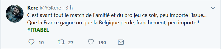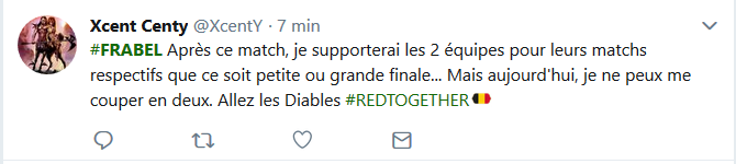 Le Hashtag #FRABEL dédié au match France-Belgique de ce soir fait fureur sur Twitter. Sur Facebook, chacun y va de sa photo de profil adaptée au match de demi-finale qui opposera la Belgique à la France. Sur Twitter, le hashtag #FRABEL remporte également un franc succès, depuis ce matin, ce dernier fait partie du top 3 des hashtags les plus utilisés dans le monde. Voici une sélection des meilleures réactions des supporters. Certains n’hésitent pas à souligner que l’attente est interminable et que la terre s’est presque arrêtée de tourner jusqu’au match. On se charrie dans les deux camps bien entendu. #FRABEL ce soir, c'est une place pour la finale. Allez @equipedefrance ???? ce soir on sort nos amis Belges !! #FiersdetreBleus https://t.co/T1vcGtAIlX — Pierre-A Coslin (@Pierrealex_Csln) July 10, 2018 Les chroniqueurs radio ne sont pas en reste, Charline Vanhoenacker s’est fait embrigader par Alex Vizorek et Guillaume Meurice ce matin sur France Inter quand elle tenta un début de chronique sur le plan pauvreté d’Emmanuel Macron. HUMOUR | Quand @Charlineaparis tente de faire un billet politique et finalement se fait embarquer pour commenter le match #FRABEL avec @alexvizorek et @GMeurice #ParJupifoot ce soir à 20h pic.twitter.com/jbQGqBu2Fd — France Inter (@franceinter) July 10, 2018 Les deux humoristes belges commenteront finalement le match de ce soir sur France Inter en compagnie de Guillaume Meurice et Thomas VDB.