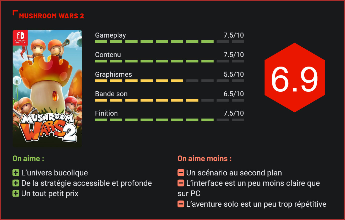Après un premier volet remarqué, Mushroom Wars 2 ressert une dose de combats stratégiques en temps réel aux commandes d’une armée de champignons conquérants. Ce n’est peut-être pas encore la période de la cueillette, mais c’est le bon moment pour planifier une invasion en solo ou entre amis sur Switch. Débutée sur PS3 en 2009 avant d’être portée sur Android, iOS puis sur PC, la licence Mushroom Wars a accouché d’un second opus en octobre 2017, directement sorti sur PC via Steam avant d’arriver cet été su Nintendo Switch. Ce jeu de stratégie en temps réel place le joueur aux commandes d’une armée de champignons déterminée à éliminer la ou les factions adverses. A part une poignée de cinématiques basiques dénuées de dialogues, rien ne vient véritablement gonfler le scénario anémique du titre (en gros l’histoire d’un roi champignon qui est à la recherche de son père et qui affronte durant son périple diverses factions dans une guerre sans merci), ce qui est bien dommage compte-tenu de l’univers singulier qui est pourtant présenté. Ceux qui ont connu le premier volet s’apercevront d’ailleurs que la direction artistique, auparavant plus cartoon et enfantine, a bien changé en devenant plus passe-partout tout en restant toutefois joliment bucolique. Le système de jeu emprunte aux ténors de la stratégie que sont Command and Conquer et StarCraft pour offrir une version de l’invasion guerrière néanmoins plus « mignonne » et simple (en apparence, seulement). On améliore ses bâtiments pour résister à l’envahisseur, on envoie un certain pourcentage de ses unités pour conquérir les édifices neutres et ennemis et on tente de survivre aux assauts qu’envoient à leur tour nos adversaires. A cela s’ajoute (seulement) trois types de bâtiments (les villages qui augmentent le nombre de guerriers, les tours défensives, et les forges qui augmentent les attaques) qui peuvent être améliorés quatre fois, ainsi que de nombreuses subtilités qui viennent pimenter les parties. On notera notamment les quatre compétences qui diffèrent entre chaque commandant de guerre (qui sont une grosse douzaine), ainsi qu’un système de moral des troupes qui augmente lorsque l’on s’empare de nouveaux bâtiments ou quand on améliore ses infrastructures, ce qui octroie des étoiles qui donnent des bonus de défense, d’attaque et de vitesse. Avec sa campagne solo scénarisée (qui sert en grande partie de didacticiel), son mode coopération et son multijoueur jusqu’à 4 (en ligne ou local), le titre offre une durée de vie plus qu’honnête. Il permet surtout de personnaliser de façon très complète chaque partie pour procurer des escarmouches fun et rapides entre amis. On regrettera toutefois en local qu’il faille posséder autant de Switch que de joueurs pour pouvoir en profiter. Si les commandes sont dans l’ensemble simples et intuitives dans cette version Switch, on perd toutefois un peu en rapidité d’exécution face à l’ergonomie offerte sur PC. On regrette d’ailleurs aussi un manque de visibilité dans l’interface, notamment lorsque l’on veut consulter les effets des compétences des commandants qui sont pour le coup difficiles à prévoir si on ne les as pas testées (et mémorisées) précédemment. Conclusion Accessible tout en offrant une jolie profondeur, Mushroom Wars 2 est un bon petit jeu tactique idéal pour des parties en ligne ou entre amis, à condition d’être équipé en Switch. Malgré sa durée de vie correcte, le solo s’avère quant à lui sympathique mais toutefois trop scolaire et répétitif pour tenir en haleine. Pour une petite vingtaine d’euros, cette guerre des champignons devrait sustenter les fanas de stratégie dans l’attente d’un éventuel successeur à Advance Wars.