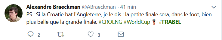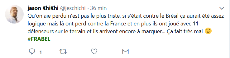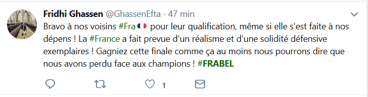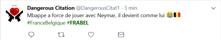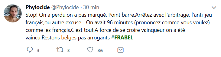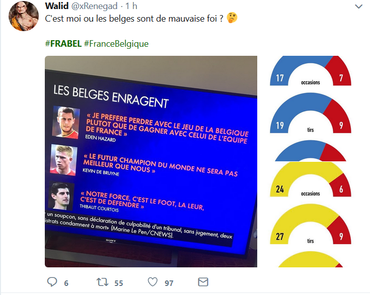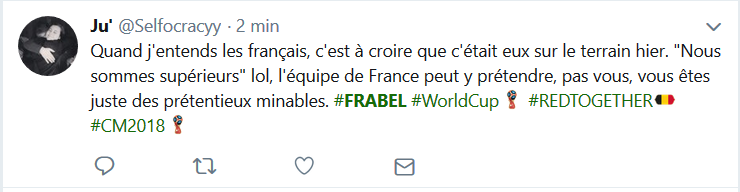 Le match historique qui a opposé la France à la Belgique a laissé un goût amer dans la bouche des internautes belges. Crédit Photo: Superfoota Le match de mardi soir a été suivi par des millions de supporters. La RTBF a d’ailleurs réalisé un nouveau record d’audience : 1.646.213 personnes ont suivis la rencontre à la télévision, soit 83.4% de part de marché. Mais sur la toile, les internautes n’étaient pas en reste, puisque les réseaux sociaux ont été inondés de commentaires. Au lendemain de la rencontre, on observe toutefois que beaucoup de supporters ont fait part de leur désarroi sur les réseaux, notamment sur Twitter, avec le hashtag #FRABEL. Et parfois même plus que du désarroi, de la rancune, voire de l’agacement. Certains résonnent et admettent la performance des Français. Les internautes français, eux, ont évidemment partagé leur joie sur les réseaux sociaux, en n’hésitant pas à taquiner leurs voisins. Beaucoup de français émettent toutefois des réserves quant à l’attitude des joueurs Belges, agacés eux aussi par le comportement des Français sur le terrain.