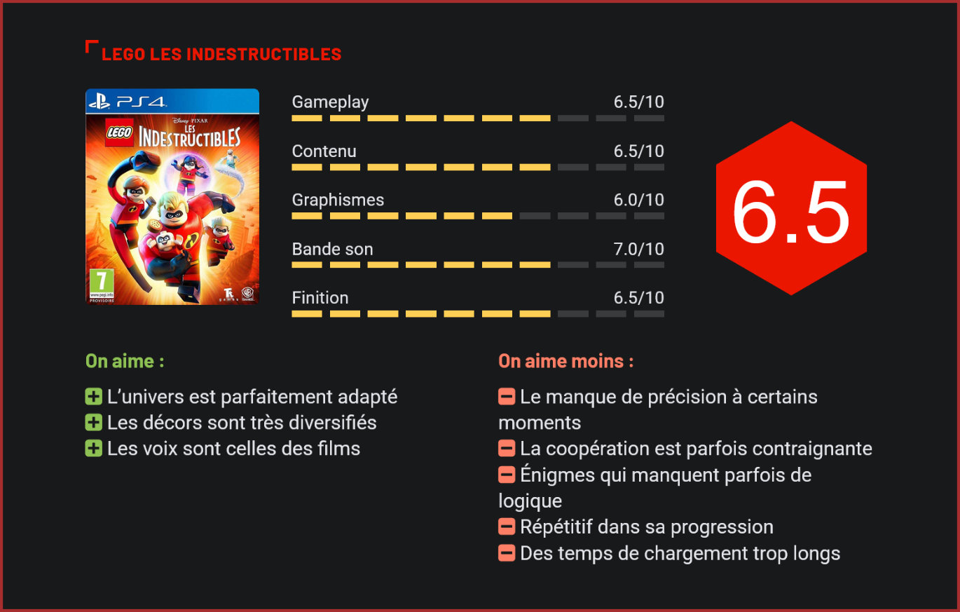 La famille Parr reprend du service 14 ans après la sortie du premier volet, l’occasion pour LEGO d’adapter la saga en jeu vidéo. Un portage qui retrace l’histoire du premier et second épisodes des aventures de cette famille indestructible. Pour les amateurs de jeux vidéo LEGO, l’année écoulée a été riche en réjouissances puisque la franchise s’est enrichie de trois titres depuis septembre 2017. L’éditeur n’hésite d’ailleurs pas à recycler inlassablement le concept… Après Super Heros Marvel 2 et Ninjago, c’est au tour de la famille des Indestructibles d’être adaptée en jeu vidéo. Ça tombe bien puisque le deuxième volet vient de sortir au cinéma. L’occasion pour LEGO de corriger l’absence de jeu lors de la sortie du premier film puisque LEGO : Les Indestructibles propose un condensé des deux aventures de la famille Parr. Indestructible I et II Si le film a été un véritable phénomène lors de sa sortie en 2004, la suite des aventures des Parr est également un carton plein au box office. De quoi surfer sur la vague du succès des films pour le constructeur de briques. On peut faire de nombreux reproches à LEGO, mais le travail d’adaptation est quelque chose que ses équipes maitrisent. En effet, le studio Traveller’s Tales a remarquablement retranscrit l’univers et l’ambiance des films dans le jeu. LEGO : Les Indestructibles suit parfaitement la trame narrative de la version cinématographie. Un point qui devrait faire plaisir aux fans. L’humour et la sympathie des personnages se retrouvent parfaitement. Pour ceux qui seraient passés à côté du phénomène, Les Indestructibles nous plonge dans le quotidien d’une famille de superhéros, la famille Parr. Chaque membre disposant de ses propres pouvoirs, ils vont devoir unir leurs forces pour combattre les menaces Il n’est donc pas question de surprises puisque le scénario du jeu reprend fidèlement celui des films. On retrouve d’ailleurs de nombreux passages tirés des films. L’union fait la force LEGO® The Incredibles_20180316193101 Sans surprise non plus, on retrouve les caractéristiques de bases des jeux LEGO. Rien d’innovant, c’est la recette miracle du développeur, pourquoi changer quelque chose qui marche ? Outre ces bases, LEGO : Les Indestructibles repose énormément sur la coopération, telle une famille. Aspect très important pour les films et qui prend effectivement tout son sens dans le portage. Pour venir à bout d’un niveau, le joueur doit jongler avec les membres de la famille Parr afin d’utiliser au mieux les pouvoirs de chacun. Une bonne idée en soi – fidèle aux messages des films –, mais la coopération s’avère trop souvent impérative et contraignante. Le plaisir se perd un peu. Malgré cela, les pouvoirs de chaque personnage sont sympathiques et originaux pour un jeu LEGO. Si les films imposaient certaines compétences, Traveller’s Tales a réussi le challenge de proposer des applications distinctes de ces pouvoirs ainsi que des variables chouettes. C’est ainsi que l’on peut passer d’un immeuble à un autre grâce à Elastigirl ou courir sur l’eau grâce à l’orbe de protection de Violette. On regrette tout de même un décalage énorme entre les pouvoirs des personnages. Plus de chance que de maniabilité La coopération sera poussée jusqu’au bout puisque le jeu propose de jouer à deux et suivant 8 personnages jouables. Un point qu’on retrouve depuis de nombreux épisodes de la franchise déjà, mais qui prend sens avec l’univers des Indestructibles. Malheureusement, si le titre est plutôt séduisant, il hérite des défauts des autres jeux LEGO. Bien qu’on puisse croire qu’il s’adresse à un public jeune, certaines énigmes ou réalisations demandent une réflexion et une dextérité certaines. Il est souvent difficile de voir si notre personnage est bien placé avant d’emprunter un passage au-dessus du vide. Cela relève souvent de la chance tant la maniabilité est flottante. Répétitif dans son concept, Lego Les Indestructibles souffre d’une construction trop classique, et joue encore et toujours la carte des clichés si chers au studio de développement. On aurait aimé plus d’originalité et de fraicheur, pour un titre certes séduisant pour les fans de la franchise, mais qui manque finalement d’éléments lui permettant de se distinguer des autres épisodes de la franchise… Retranscription au top Fidèle à elle-même, la franchise propose un univers coloré et très diversifié. Les décors et l’ambiance des films sont parfaitement retranscrits. Les niveaux sont très différents avec des environnements propres comme le centre-ville ou l’ile. Pour ce qui est de la musique, LEGO est maître dans les ambiances sonores épiques. On ne peut rien dire de plus. Ça résonne l’action et ça marche. Le gros point positif reste le fait que l’on retrouve les mêmes voix que dans les films. Conclusion : S’il n’est particulièrement original, LEGO : Les Indestructibles n’en reste pas moins un jeu très agréable à parcourir pour tous ceux qui ont apprécié les deux longs métrages. Très proche des autres jeux de la franchise Lego, cet opus conserve les qualités et défauts de ses ainés, avec un univers coloré, un gameplay coopératif et beaucoup d’humour. Malheureusement, les imprécisions du gameplay et les flottements au niveau de la jouabilité entachent largement le plaisir. La diversité des personnages et de leur pouvoir reste tout de même appréciable pour un jeu familial qui devrait logiquement trouver son public, à défaut de marquer les esprits.