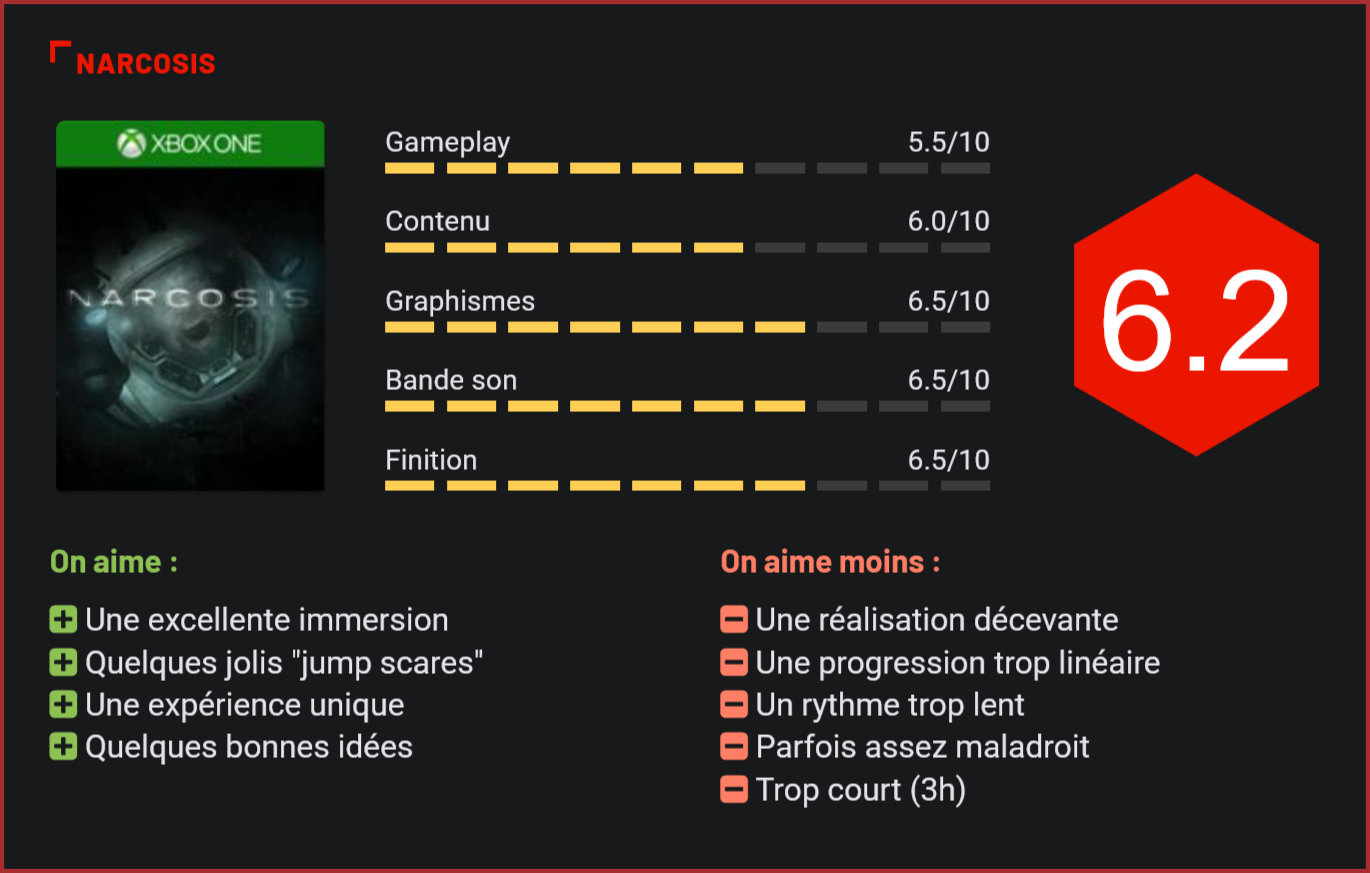 Sorti sur PC et Xbox One en 2017, Narcosis s’offre un portage en bonne et due forme sur PS4. Développé par un petit studio indépendant, Narcosis est un Survival sous-marin qui tente de remettre au goût du jour un style de jeu qu’on pensait disparu depuis le début des années 2000. Mêlant brillamment survie et infiltration, le titre du studio Honor Code parvient à se démarquer des autres Survivals par son contexte particulier. Dans Narcosis, le joueur sera en effet amené à explorer les profondeurs abyssales d’une base sous-marine. Au cours d’une mission de routine, une équipe de chercheurs est balayée par une lame de fond, qui détruit presqu’intégralement leur base sous-marine et pousse Kip, le personnage central, à explorer les décombres à la recherche d’équipements qui lui permettront de survivre et de s’échapper de cet environnement devenu totalement instable. Les premières minutes de jeu seront l’occasion pour le joueur de se familiariser avec les commandes particulières de Narcosis. Car ici, pas de straff ni de couvertures. Le joueur devra apprendre à maîtriser son scaphandre, et à garder un oeil attentif sur les indicateurs de pression de d’oxygène. S’il se joue entièrement à la première personne, Narcosis n’est pas à proprement parler un “First person shooter”, mais davantage un jeu de survie qui immerge parfaitement le joueur dans un univers sombre et effrayant. D’ailleurs, n’espérez pas croiser un fusil dans Narcosis puisque les seules armes qui seront à votre disposition sont un couteau de plongée et des fusées éclairantes, qui permettront d’attirer certaines créatures pour se faufiler dans leur dos. S’il rencontrera plusieurs créatures qui pourront facilement lui ôter la vie, le joueur devra se méfier tout autant si ce n’est plus dans l’environnement qui l’entoure. Car dans Narcosis, rester en vie est un véritable challenge et il faudra constamment veiller à remplir sa barre d’oxygène. Claustrophobes s’abstenir! Car oui, Narcosis est un titre qui parvient à faire grimper le stress rapidement avec ses espaces confinés, l’ombre d’une menace permanente et son sens aigu du timing. Pour en rajouter une dose, les développeurs n’ont pas hésité à jouer sur la psychose du personnage principal, qui subit les effets de la pression, et sombre dans progressivement dans la folie. Un véritable parcours du combattant qui fascinera les amateurs d’exploration sous-marine. Plutôt réaliste, le jeu fait toutefois la part belle aux hallucinations et n’hésite pas à glisser son lot de “jump scares”. Le résultat est plutôt convaincant, même si le rythme de l’aventure est morcelé et la progression reste horriblement linéaire. Original dans son approche, Narcosis souffre malheureusement d’un manque d’ambition tant au niveau de sa réalisation – tout à fait banale – que de son aventure, qui se joue en ligne droite, avec une narration minimaliste. Dommage, d’autant plus que l’ambiance du jeu était bien travaillée et le concept suffisamment original pour séduire les nombreux joueurs blasés des grosses franchises. Un monde ouvert aurait probablement offert davantage de profondeur à ce titre, qui, s’il ne révolutionne rien, n’en reste pas moins une expérience agréable à parcourir en solitaire. Conclusion Bourré de bonnes intentions, Narcosis parvient à tirer son épingle du jeu grâce à son approche rafraîchissante d’un genre délaissé par les gros éditeurs, et sa mise en scène efficace. Malheureusement, ce petit projet indépendant ne parvient pas tout à fait à nous convaincre, la faute à une réalisation technique décevante, une progression trop linéaire et quelques maladresses. Efficace, à défaut d’être incontournable, le titre d’Honor Code devrait surtout séduire les amoureux du fantastique avec son univers soigné et ses quelques “jump scares”.