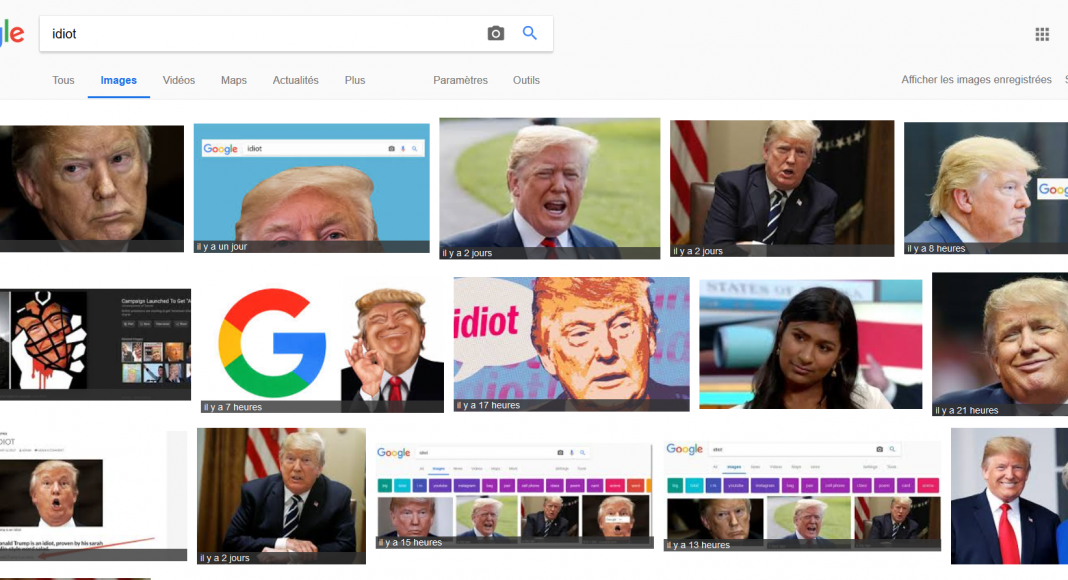 La photo du président américain apparait comme résultat d’une recherche avec le mot “idiot” sur Google Images. Vous pouvez faire le test chez vous, en tapant le mot « idiot » sur Google, cliquez sur l’onglet « images » et vous tomberez sur de nombreuses photos de Donald Trump. Au début, le président américain était assimilé à la chanson American Idiot du groupe Green Day parce que les protestants avaient utilisé cette chanson lors de sa visite à Londres. Le président s’était en effet fait remarquer par son comportement déplacé vis-à-vis de Theresa May et de la reine Elitzabeth II. Mais depuis, des activistes ont continué à lier ce mot à Donald Trump. Pour cela, ils utilisent l’algorithme de Google pour maintenir le lien entre le terme « idiot » et les photos. La plupart du temps, les internautes postent une image de Trump accompagné du mot idiot sur la plateforme Reddit. C’est ce qu’on appelle le phénomène de « Google Bombing ». Chaque mention de Donald Trump et du mot idiot aura donc tendance à remonter les images du 45e Président des États-Unis dans les résultats de la recherche de Google Images. Google, de son côté, ne fait absolument rien. Ce n’est pas une question de parti pris, c’est juste que l’entreprise a comme politique de ne pas modifier son algorithme pour ce genre de chose. Google modifie seulement son algorithme pour le rendre plus efficace, pas pour le rendre culturellement acceptable. On se souvient que des images d’une caricature de juif apparaissaient en tapant le mot juif dans Google Images. De la même manière, Google n’est pas intervenu pour modifier les résultats, mais a par contre affiché des bannières invitant au respect et à la tolérance à la place des publicités. On ne sait pas combien de temps va durer cette campagne de Google Bombing, mais on imagine que devant l’efficacité de la méthode, les anti-Trump vont alimenter l’algorithme le plus longtemps possible.