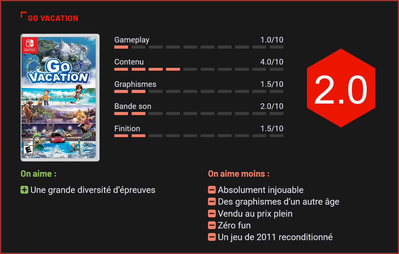 Maigre en exclusivités, le catalogue de jeux de la Switch a eu droit cet été à quelques jolis ajouts avec les sorties de Mario Tennis, Sushi Striker et Hyrule Warriors. Bien décidé à poursuivre ses efforts, Nintendo nous livre aujourd’hui un autre party-game rescapé du catalogue de la Wii, qui aurait toutefois mieux fait de sombrer dans l’oubli… Sorti en 2011, Go Vacation avait remporté un certain succès sur la Wii grâce à son concept amusant, qui surfait sur le succès de Wii Sports, en proposant aux joueurs de participer à plusieurs dizaines de mini-jeux dans une station balnéaire. Orienté multijoueur, le jeu jouait la carte du fun pour séduire une audience très « casual. » Sept ans plus tard, Namco Bandai nous livre une refonte de son jeu. Et en dépit de l’enthousiasme de Nintendo, qui assure la promotion du jeu sur sa plate-forme, il n’y a guère grand-chose de très excitant à attendre de ce nouveau party-game. D’une laideur à couper le souffle, le jeu de Namco-Bandai est pratiquement un copié-collé du titre sorti en 2011, auquel on aurait ajouté quelques activités sans grand intérêt pour attirer de nouveaux joueurs… Si le concept – participer à des mini-jeux délirants allant de la pêche à la course à pied et en passant par le kayak – reste très séduisant, difficile d’être enthousiaste face à un titre qui est techniquement complètement à la rue et qui est surtout victime d’une prise en main totalement ratée. Impossible ou presque de trouver du fun dans un gameplay sans aucune logique qui use et abuse du motion control et finira par agacer même le plus zen des gamers. Mou, lent et horriblement répétitif, le titre de Namco Bandai provoquera chez les joueurs ennui et bâillements. La petite console de Nintendo attendait pourtant son Mario-Party depuis un moment déjà, et il faudra visiblement se montrer patient puisque Go Vacation est un véritable fiasco. Dans l’attente d’un party-game digne de ce nom sur Switch, les joueurs pourront toujours se tourner vers le sympathique Sushi Striker ou vers la 3DS, qui a récemment accueilli l’excellent WarioWare, et Mario Party : the Top 100. Regrettable, d’autant plus que sur le papier, le jeu de Namco-Bandai avait tout pour séduire : de sa cinquantaine d’épreuves totalement délirantes à son mode multijoueur, en passant par les nombreux objets à collectionner. Conclusion Si le catalogue d’exclusivités de la Switch regorge d’excellents jeux, Go Vacation n’en fait toutefois pas partie. Laid à en pleurer, le jeu de Namco Bandai souffre de sa réalisation désastreuse et d’une prise en main exécrable. Ne cherchez pas une once de fun ici, car il n’y en a tout simplement aucune. Pratiquement injouable, le party-game de Namco-Bandai n’est ni plus ni moins qu’une relique d’un autre âge qui aurait mérité une retraite paisible. Dommage, car sur le papier, Go Vacation avait plus d’un argument à faire valoir…