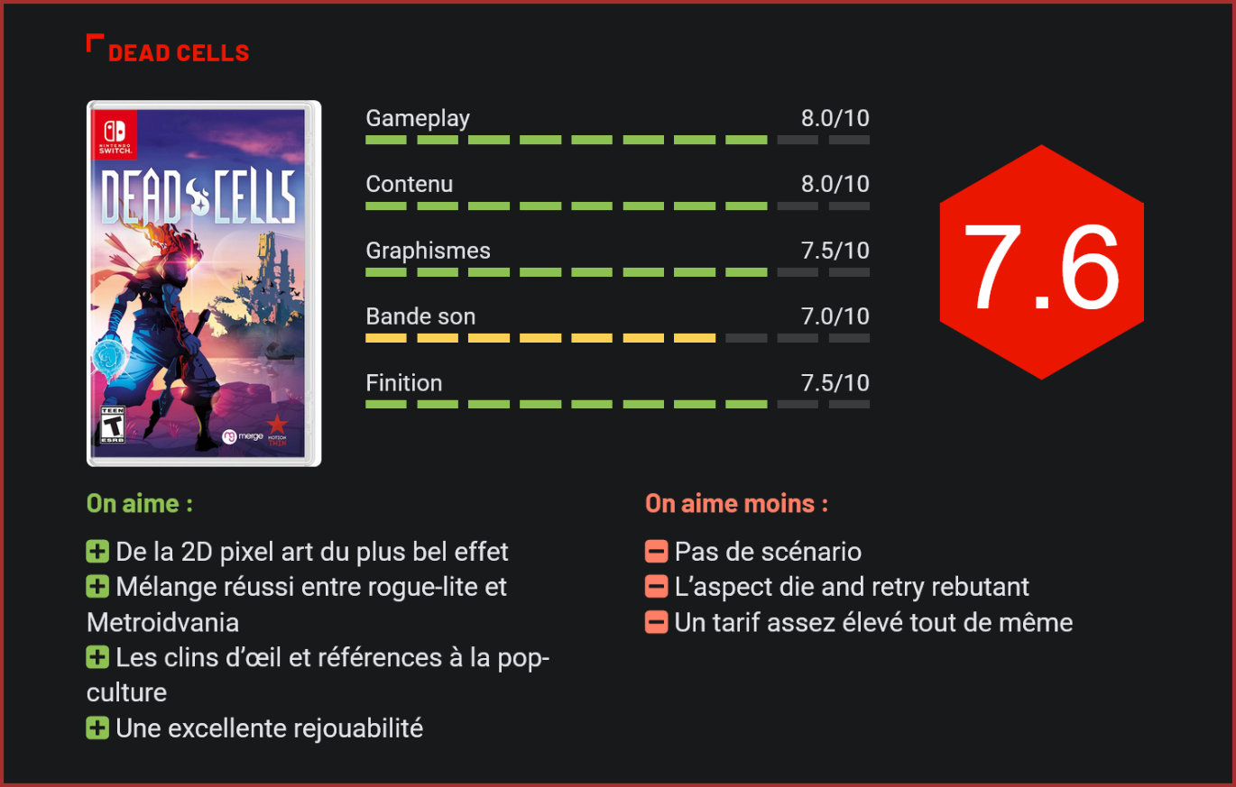 Lorsque Castlevania rencontre Rogue Legacy, cela donne naissance à Dead Cells, un Roguevania aussi aventureux qu’exigeant, pour les fans de plateforme et de véritable challenge. Disponible en early access sur PC depuis le mois de mai 2017, Dead Cells livre à présent son univers généré de manière procédurale sur les consoles PS4, Xbox One et Switch. Ce jeu issu du studio français Motion Twin propose au joueur d’explorer un château rempli de créatures monstrueuses. Des squelettes, des points de téléportation, des morceaux de viande pour récupérer (un peu) de vie, une carte qui s’affiche à mesure de votre progression, on se croirait dans un Castlevania. Sauf qu’à chaque mort, c’est retour au point de départ, dépourvu des armes et trésors acquis lors du précédent essai. Aucun point de sauvegarde à l’horizon. Rageant vous dites ? A priori oui, mais Dead Cells a plus d’un tour dans sa besace pour vous inviter à persévérer. Impitoyable mais juste Le level design est généré aléatoirement, ce qui brise la monotonie de chaque partie en offrant à chaque fois de nouvelles variations. Votre avatar, le corps d’un prisonnier investit par une cellule ressemblant à un blob, dispose de deux armes principales (épées, arcs à flèches, fouet, etc.) et d’accessoires de type pièges, bombes, tourelles, etc. qui peuvent être découverts au fil de la progression. Le titre en est même très bien achalandé. Chaque joueur peut orienter son approche en fonction de trois builds principaux : le premier favorisant la brutalité, le second la technique et le dernier la survie. Des améliorations dispersées dans chaque niveau vous permettront régulièrement d’aiguiser l’une de ces approches. Bien sûr, en fonction des armes récoltées, les variations vont bien au-delà des trois types d’optimisation de personnages cités ci-dessus, prouvant la richesse inouïe du jeu. Durant les niveaux, vous pourrez également récolter de l’or, des cellules de monstres ainsi que des plans pour confectionner de nouvelles armes et capacités. L’or est échangeable auprès des marchands (présents dans les niveaux) tandis que les deux autres éléments sont à rapporter au Collecteur qui vous attend entre chaque niveau. En échange de plans et de cellules, celui-ci pourra créer de nouveaux objets pour votre équipement, qui apparaîtront dès lors aléatoirement dans les niveaux lors des prochains runs. De même, en allant de plus en plus loin, le joueur débloque également des compétences donnant accès à des zones précédemment inaccessibles. Bien vu ! Equilibré comme il faut, le titre contient donc un vrai système de progression qui vous permet de conserver les améliorations, rendant le titre à la fois exigeant et accessible. Bref, dans Dead Cells la mort n’est qu’une étape et tout est fait pour vous donner envie de recommencer pour aller plus loin. Beau et fluide à se damner Pour ne rien gâcher, la prise en main du personnage est excellente, fluide et nerveuse à souhait. Le personnage frappe, saute, coure et effectue des roulades avec une facilité déconcertante. Tout répond au doigt et à l’œil et l’on ne peut au final s’en prendre qu’à soi-même en cas d’échec, même si la difficulté est globalement au rendez-vous. La moindre erreur se paie en effet cher face à des ennemis qui vous avalent votre barre de santé en très peu de coups. Les animations et le rendu tout en 2D pixel art est pour sa part du plus bel effet avec des jeux de lumières et des effets (flammes, éclairs, etc.) très soignés. Les environnements sont également variés et très détaillés, avec parfois de petites surprises à la clef (on vous invite à régulièrement tenter d’interagir avec une porte en arrière-plan ou des écritures présentes sur un mur). Bourré de clins d’œil, Dead Cells fait régulièrement référence à ses deux modèles que sont Castlevania : Symphony of the Night et Rogue Legacy. Mais la culture et l’humour des développeurs ne s’arrête pas là, puisque l’on trouve régulièrement d’amusantes allusions au cinéma et à la pop-culture (un message textuel vous invitant par exemple à vous « Méfier des mouches lorsque vous vous téléportez »). Conclusion Les fans de Castlevania et autres Metroidvania seraient tentés de se procurer ce jeu de plateforme affichant de jolis graphismes en pixel art et des combats nerveux (notamment au fouet) dignes de Simon Belmont. Il ne faut néanmoins pas oublier sa dimension rogue-lite qui, hormis proposer une expérience renouvelée à chaque partie, ne dispose d’aucun point de sauvegarde. Il faut bien en être conscient : même s’il est accessible, Dead Cells est un condensé de challenge pur et dur qui vous renverra impitoyablement et incessamment à la case départ. Néanmoins, il est si bien équilibré qu’il n’est jamais vraiment punitif, mais au contraire très addictif. A réserver à ceux qui voient en la mort un éternel recommencement.